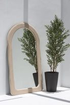 The Mirabella mirror wrapped in a beige flannelette velvet-like fabric, adds a unique touch of sophistication to any setting. The irregular arching silhouette lends an artistic and slightly imperfect charm, making it a standout piece. This design is ideal for bedrooms, living rooms, or any space where a subtle, artistic flair is desired.