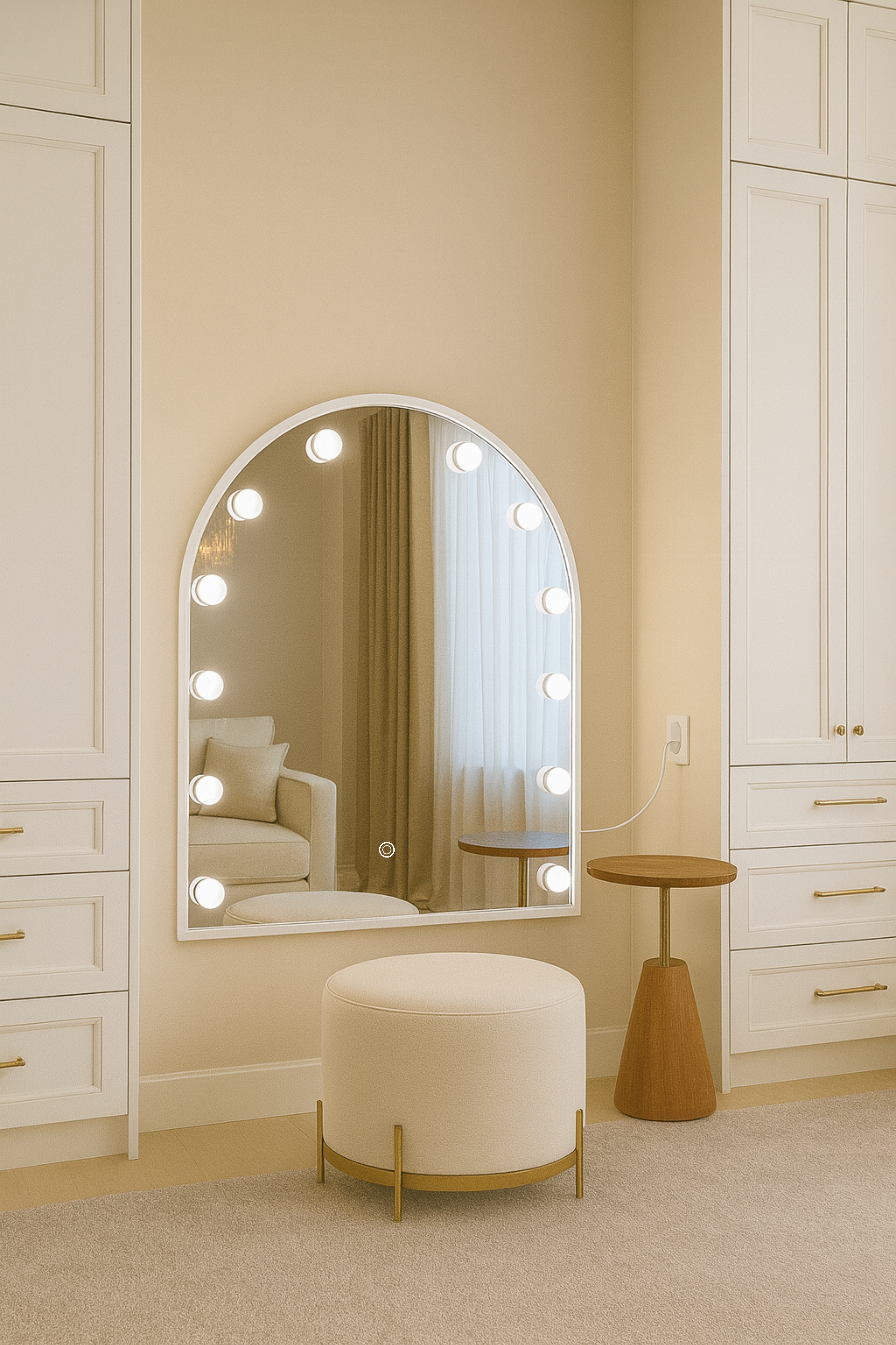 This mirror combines an arched profile with a crisp white frame accented by integrated Hollywood-style bulbs for balanced illumination. Its reflective surface paired with soft lighting creates the ideal setting for makeup application, dressing, or adding a statement feature to interiors. Designed to enhance brightness and style, it transforms bedrooms, vanity corners, or studios into inviting spaces with a professional finish.