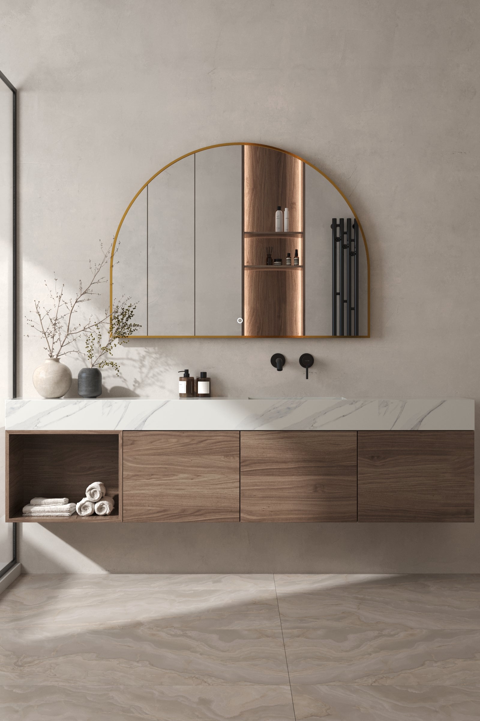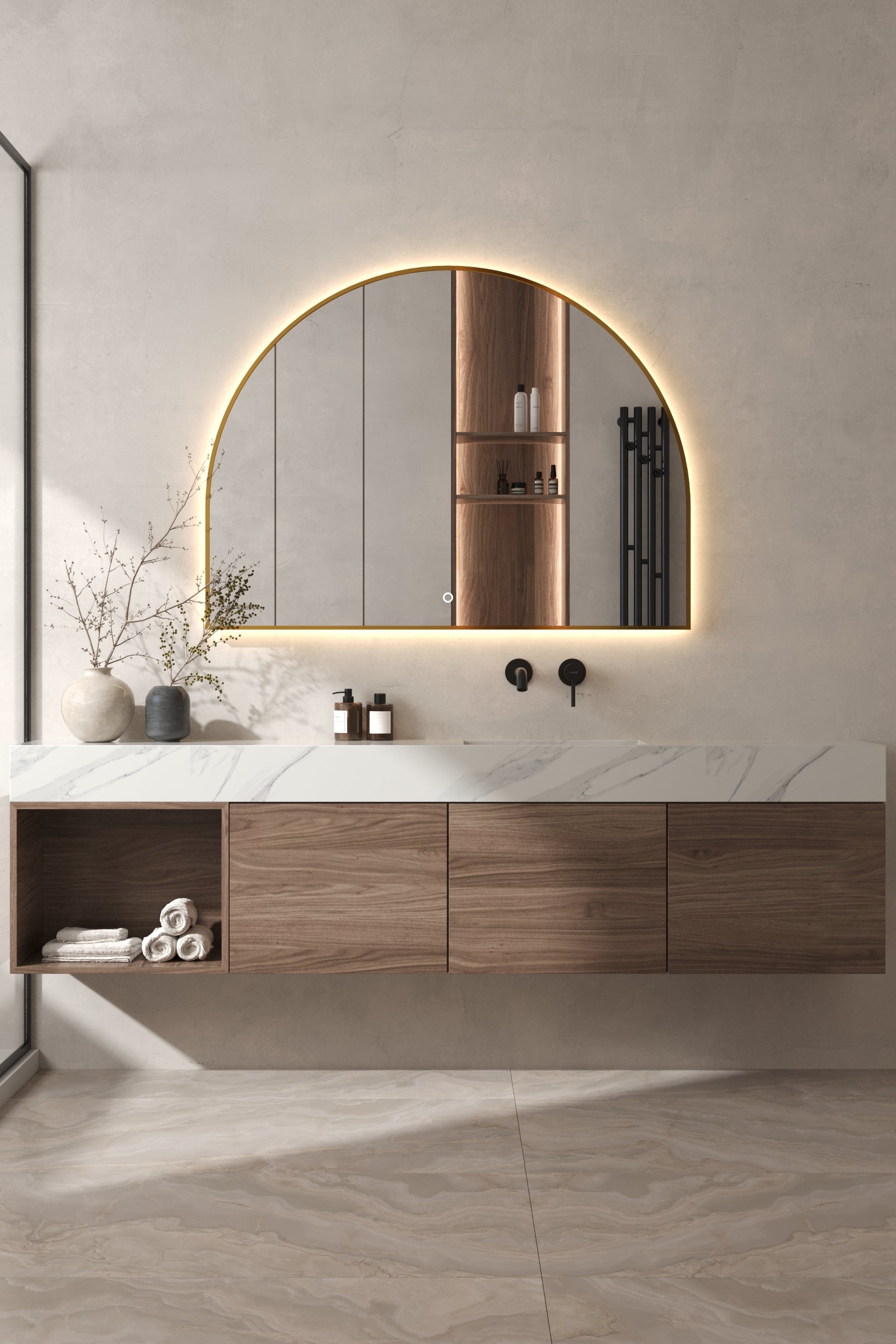 Elevate your bathroom or vanity space with our elegant Gold Backlit Arched Mirror, where timeless sophistication meets modern functionality. Featuring a graceful arch design and a sleek gold frame, this mirror adds a luxurious focal point to any room. The integrated LED backlight emits a soft, ambient glow that enhances visibility while creating a relaxing spa-like atmosphere. Designed with touch-sensor technology for easy lighting control, this mirror is perfect for daily grooming and nighttime ambiance. Its minimalist silhouette blends effortlessly with contemporary, transitional, or Scandinavian-inspired interiors. Built with premium materials for durability and resistance to moisture, it is ideal for both residential and hospitality bathrooms. Make a bold design statement with a mirror that is as functional as it is beautiful.