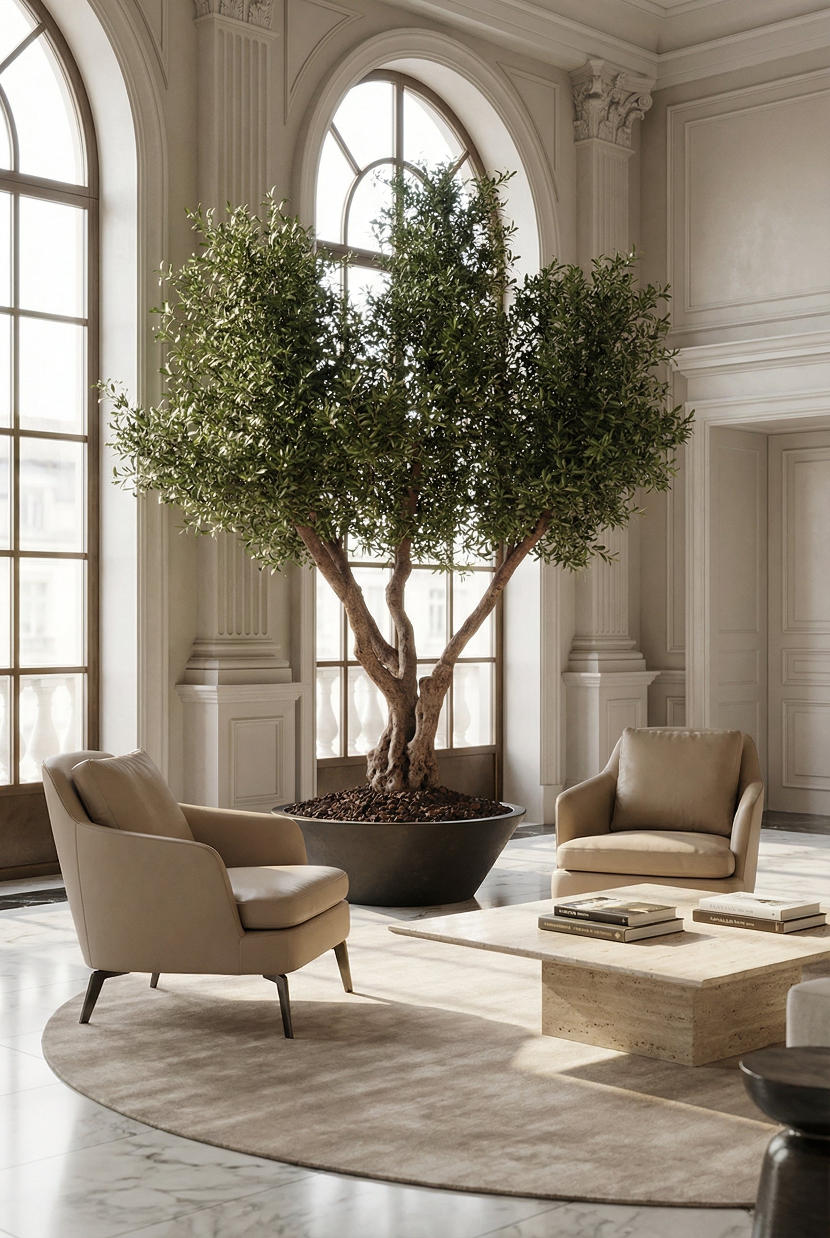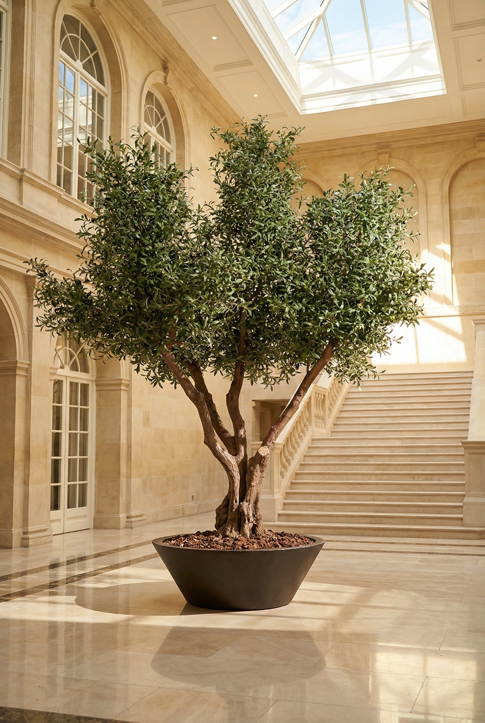 Inspired by the classic form of the Olive Tree (Olea europaea), this artificial olive tree features a tall structured canopy with finely layered foliage and a naturally textured multi branch trunk that brings timeless Mediterranean character into your space. Its balanced silhouette creates calm visual harmony, making it a refined statement piece for entrance halls, stair landings, living areas, and thoughtfully designed commercial interiors, while the natural dried three trunk form with a carefully treated finish and high quality artificial leaves delivers a realistic and grounded presence.