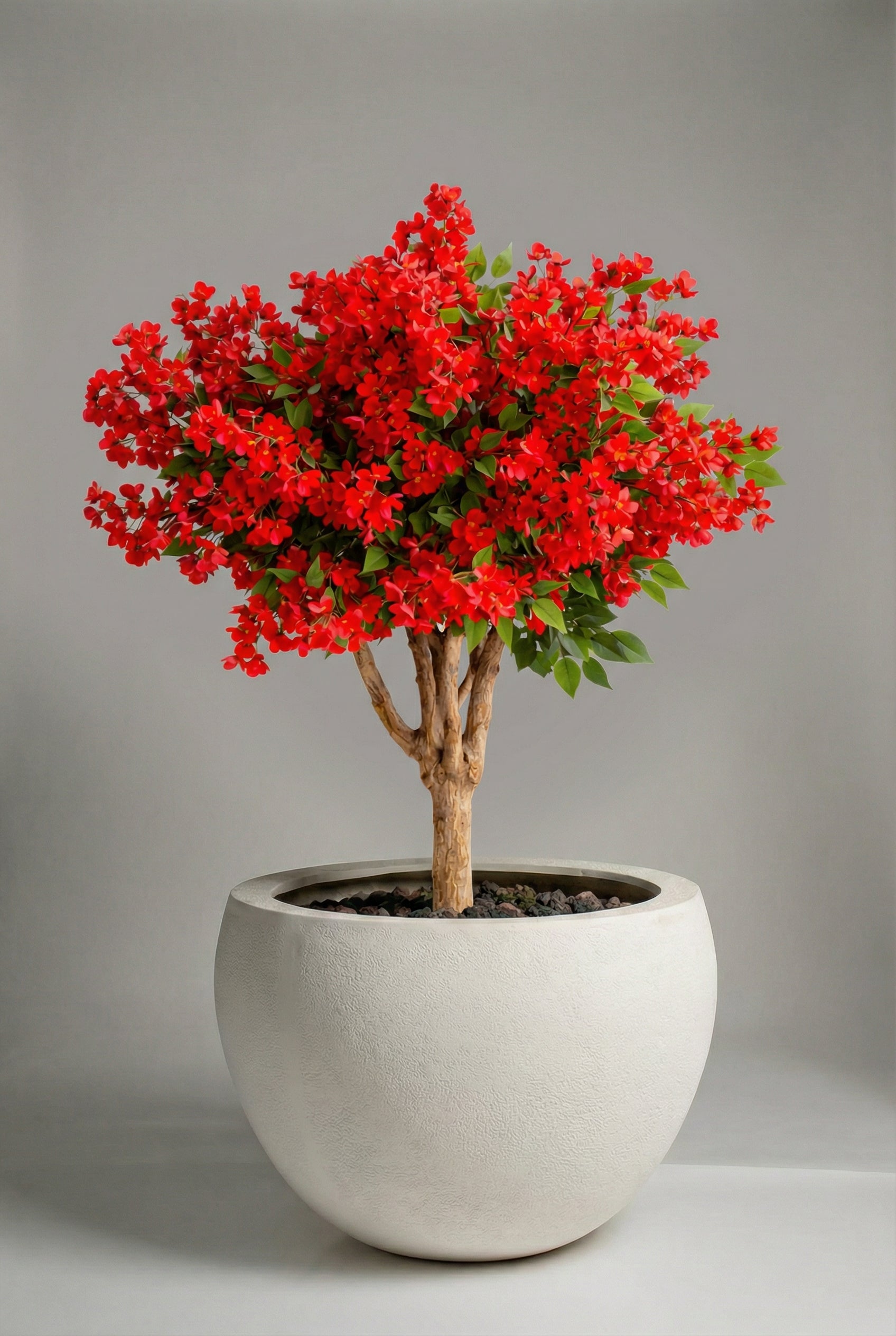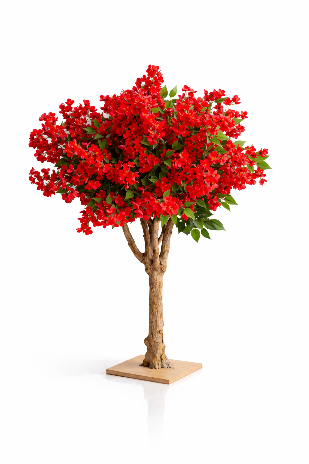 Inspired by the vibrant beauty of the Bougainvillea, this artificial flowering tree features a lush canopy of rich red blooms that instantly energize your space. The sculptural form adds warmth and Mediterranean character, making it ideal for living areas, entrance zones, terraces, and styled commercial interiors seeking a bold natural accent. Featuring a natural dried wooden trunk with a comically treated finish for a realistic look, paired with good quality artificial red bougainvillea flowers that deliver lasting color with effortless elegance.