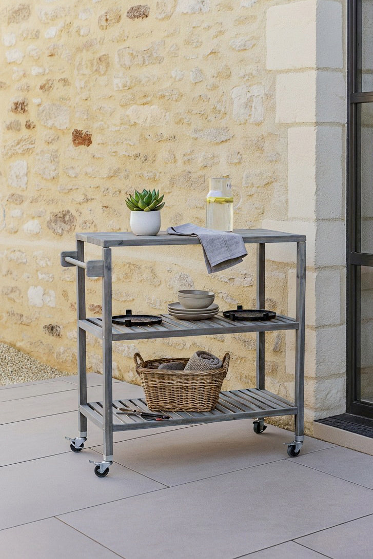 Bring modern elegance to your home with this kitchen trolley in dusk grey, where subtle sophistication meets practical charm. Its smooth, muted grey tone and clean rectangular silhouette pair seamlessly with open slatted shelving and chrome-finished wheels, allowing you to organize or showcase essentials effortlessly. The textured grey finish blends beautifully into contemporary interiors, turning any hosting moment into a statement of style.