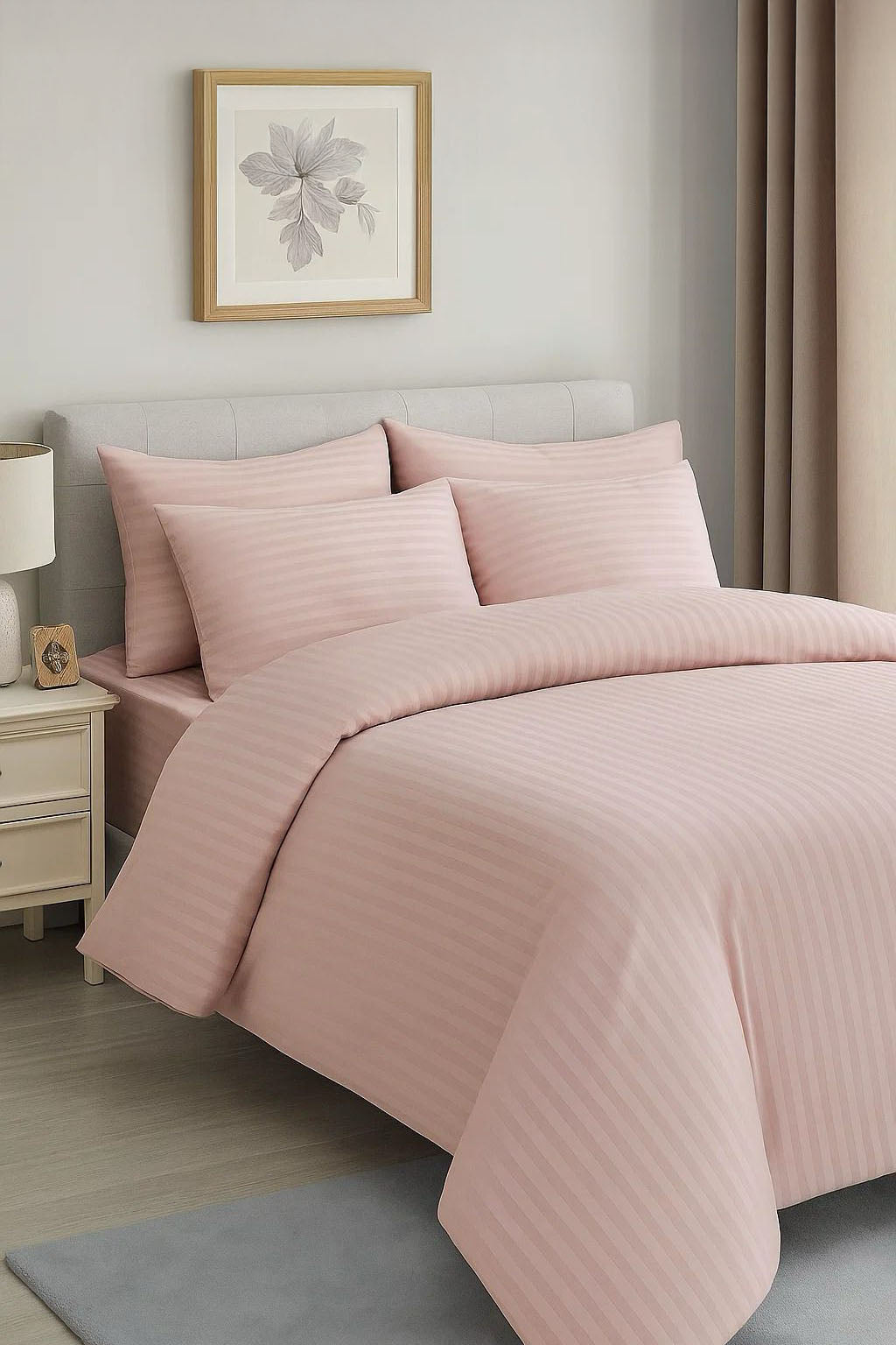Bring charm and coziness into your space with the Pink Striped 6-piece bedding set. This complete set includes a soft bed sheet, duvet cover, and four pillowcases, ideal for a refreshing yet stylish bedroom look.