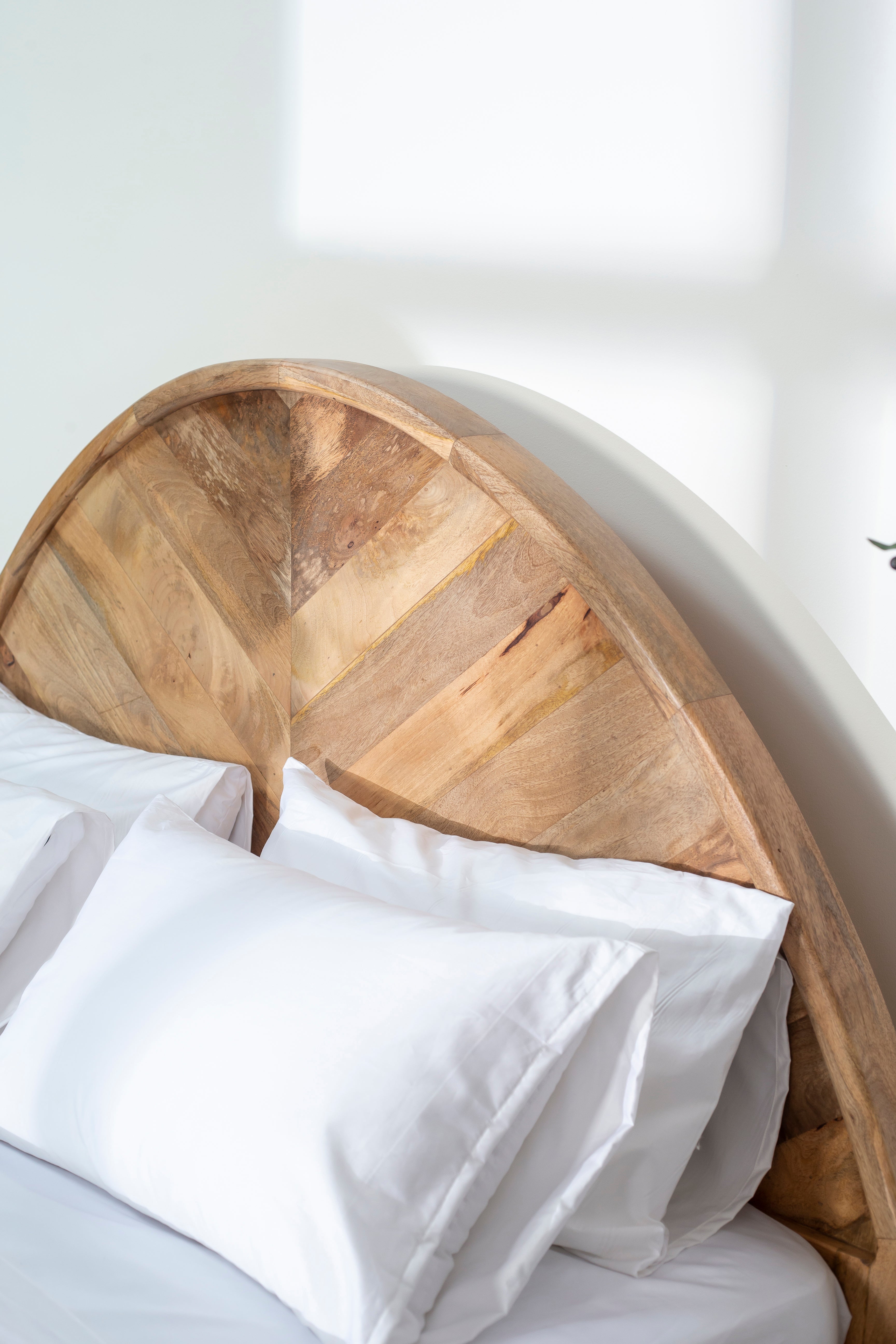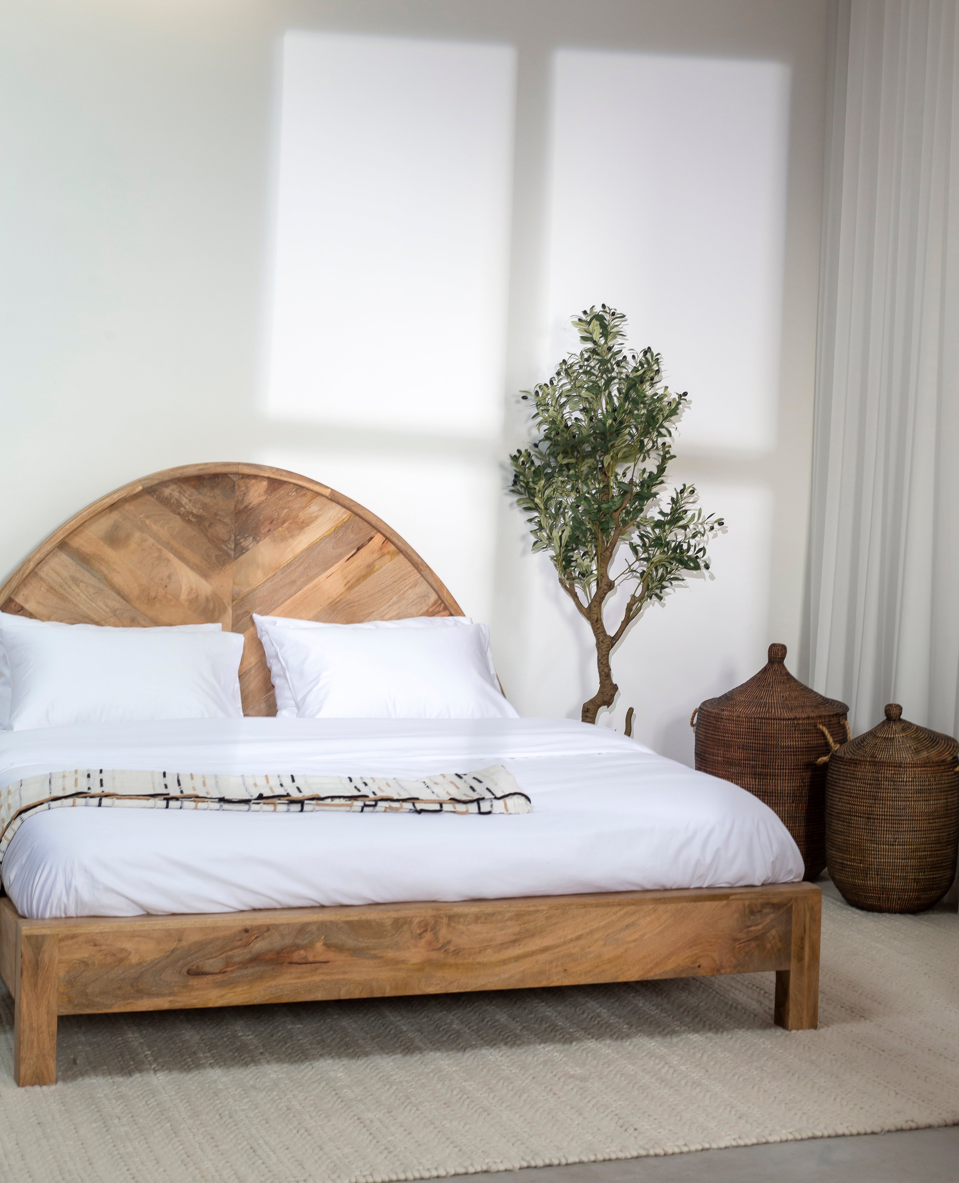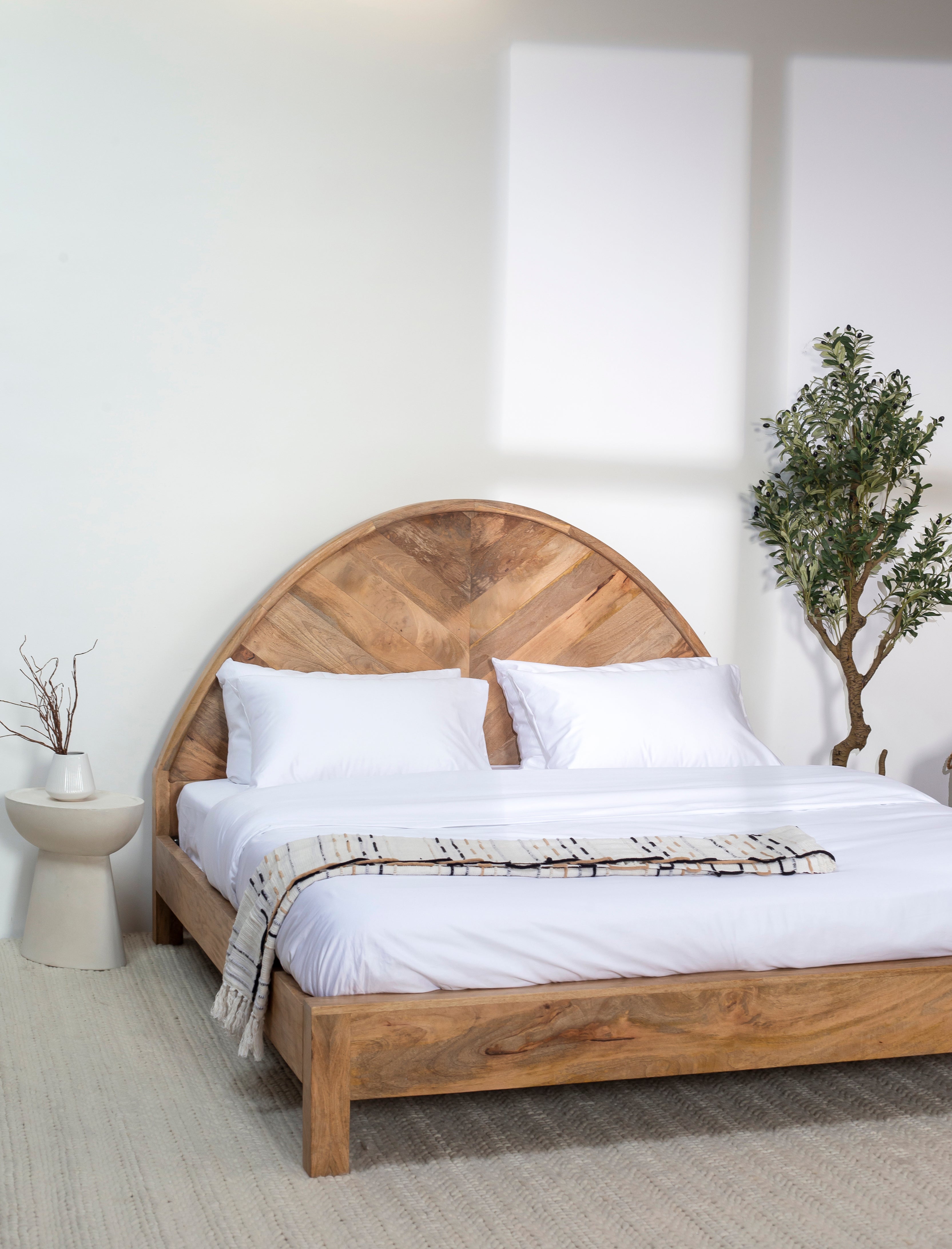 Transform your bedroom with the rustic elegance of the Damian Solid Mango Wood Bed. Featuring a distinctive arched headboard crafted from solid mango wood, this bed showcases natural wood grains and a warm honey finish that brings depth and character to any space. The chevron pattern on the headboard adds a touch of artisan craftsmanship, while the sturdy frame ensures durability. Perfectly blending style and substance, the Damian bed is ideal for contemporary, boho, or rustic interiors, offering a natural, textured charm that highlights the unique beauty of mango wood furniture.