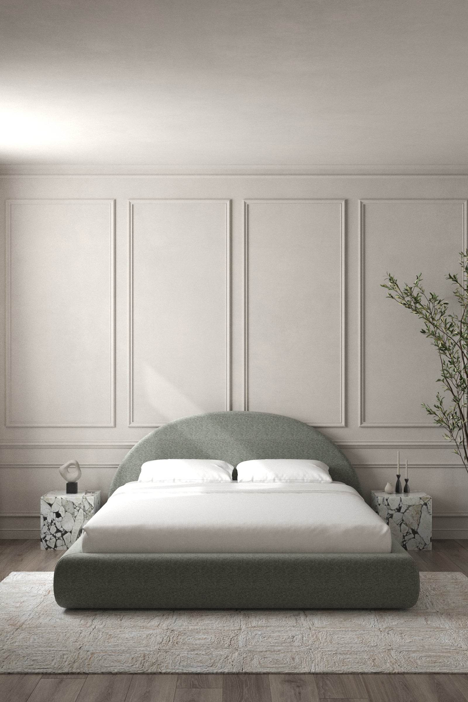 Upholstered in eucalyptus dust fabric, this bed brings a refreshing yet sophisticated touch to the bedroom. The arched headboard adds a graceful architectural detail, paired with a streamlined frame for a clean and modern silhouette. Smooth upholstery and subtle stitching showcase craftsmanship, while the muted green tone introduces a natural elegance that complements minimalist, contemporary, and transitional interiors.