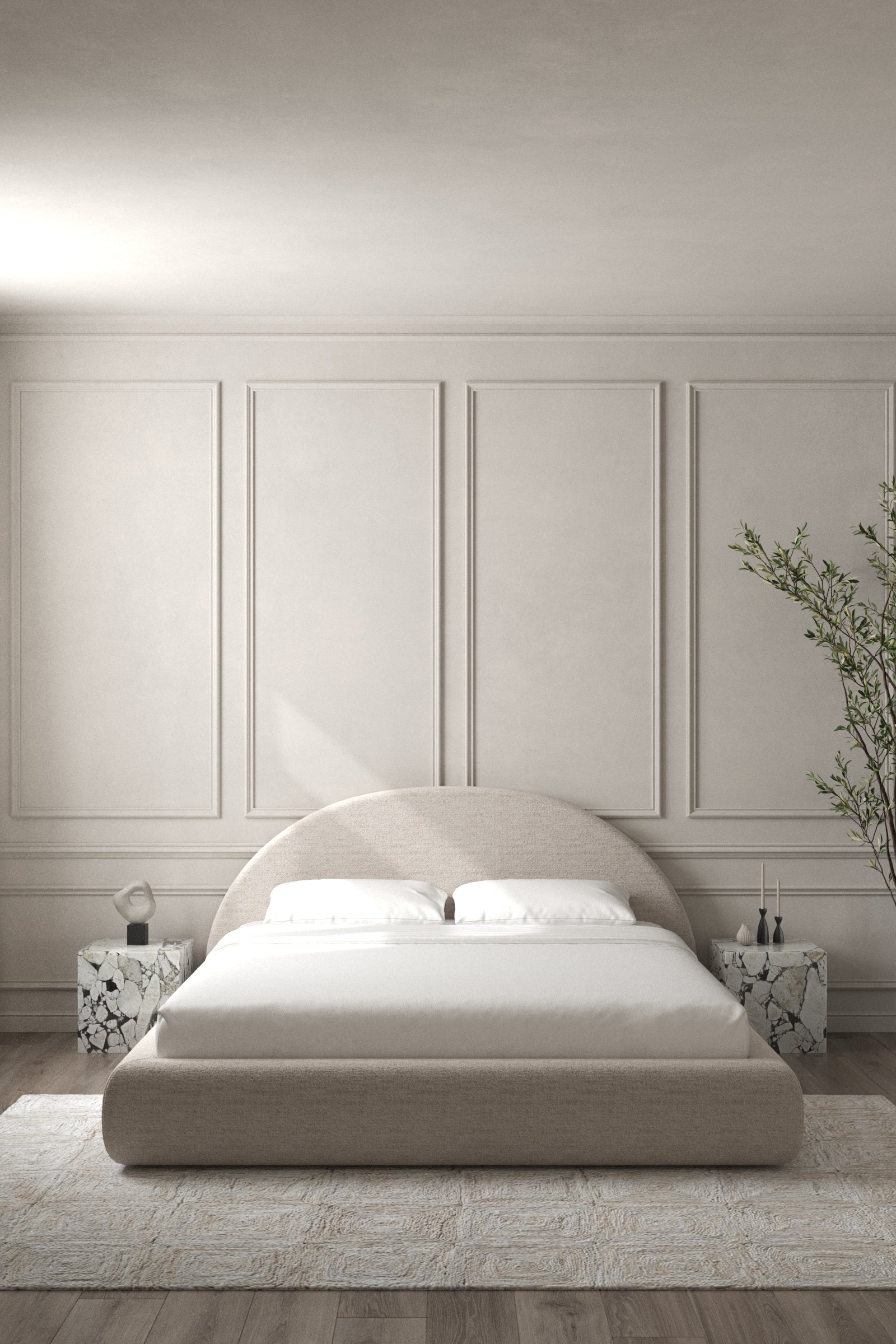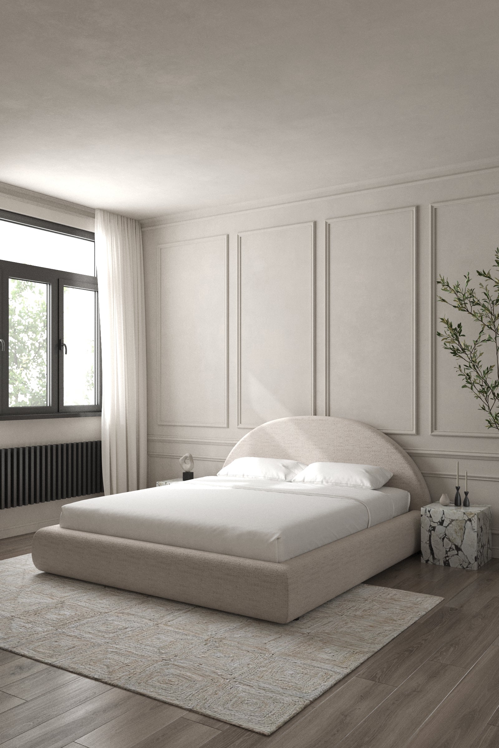 Upholstered in soft oat cream fabric, this bed exudes a serene elegance that transforms the bedroom into a restful retreat. Its gracefully arched headboard adds sculptural charm, balanced by a streamlined frame that enhances the clean, contemporary silhouette. The smooth upholstery and subtle detailing highlight refined craftsmanship, making it an ideal choice for modern, minimalist, and transitional interiors.
