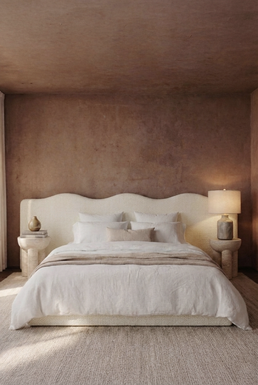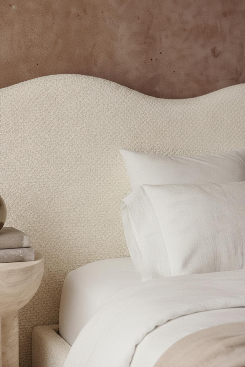 Create a calm, elevated bedroom retreat with a softly curved silhouette wrapped in off white upholstery that feels timeless and serene. The sculpted headboard adds a gentle architectural statement while keeping the look light, airy, and beautifully balanced. Designed to pair effortlessly with warm woods, stone textures, and layered linens, it delivers a refined hotel style finish with everyday comfort. A perfect foundation for minimalist, modern, or organic luxury interiors.