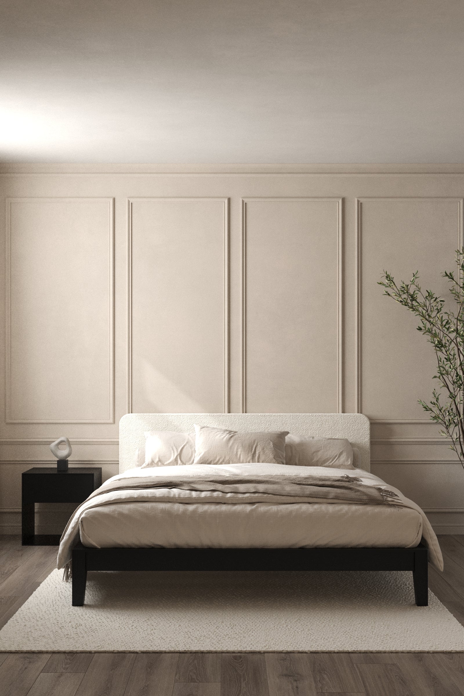 This Boucle Black Frame Bed exudes sophistication with its modern design and premium craftsmanship. Featuring a plush boucle fabric headboard in a crisp off white finish, it pairs seamlessly with a sleek black frame made from finger joint rubber wood and E2 plywood. The curved edges and minimalist silhouette evoke traditional Japanese joinery aesthetics while offering contemporary appeal. Perfect for modern or zen-inspired interiors, the bed combines durability with luxurious textures, making it a standout centerpiece for any bedroom.