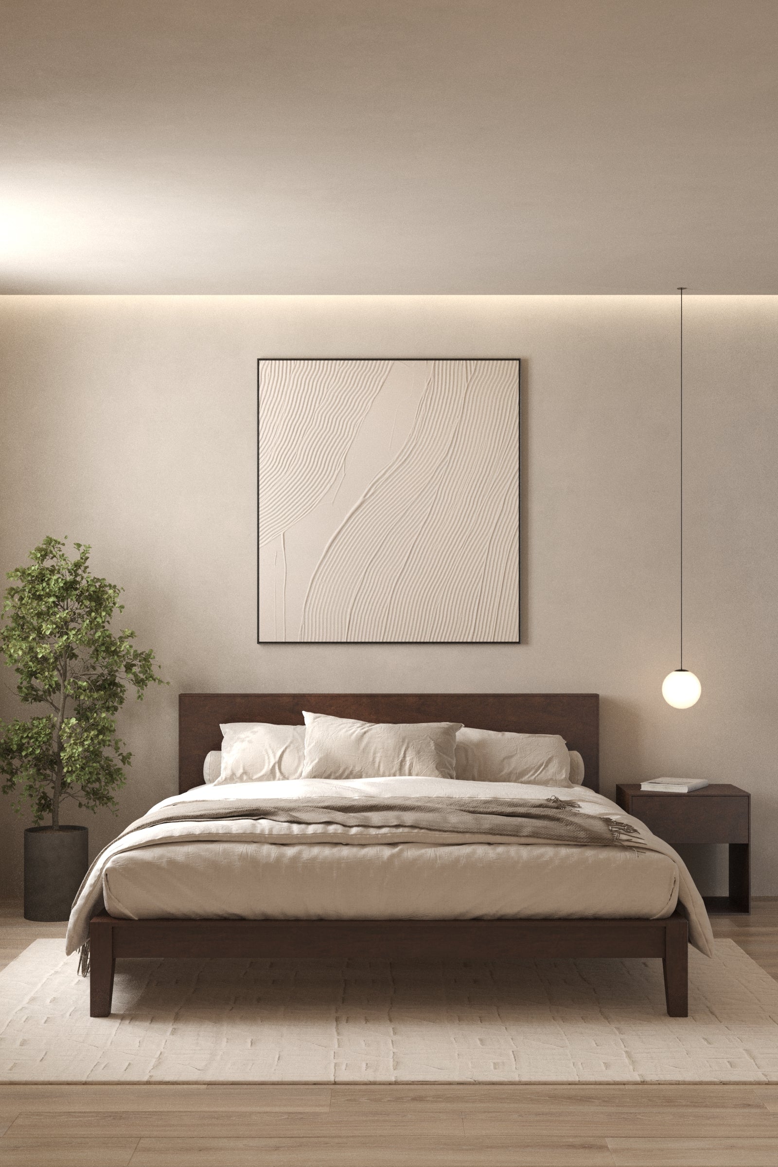 This Bed brings timeless elegance and minimalist design to your bedroom. Crafted with finger joint rubber wood and E2 plywood, its dark, rich wood tones exude warmth and sophistication. The sleek, straight-lined headboard and low-profile frame are inspired by traditional Japanese aesthetics, blending durability with understated beauty. The smooth texture and natural wood grains add depth and character, making this bed a perfect centerpiece for modern, rustic, or zen-inspired interiors. Experience the harmonious balance of style and craftsmanship with the Kohana Bed, designed to last and impress.