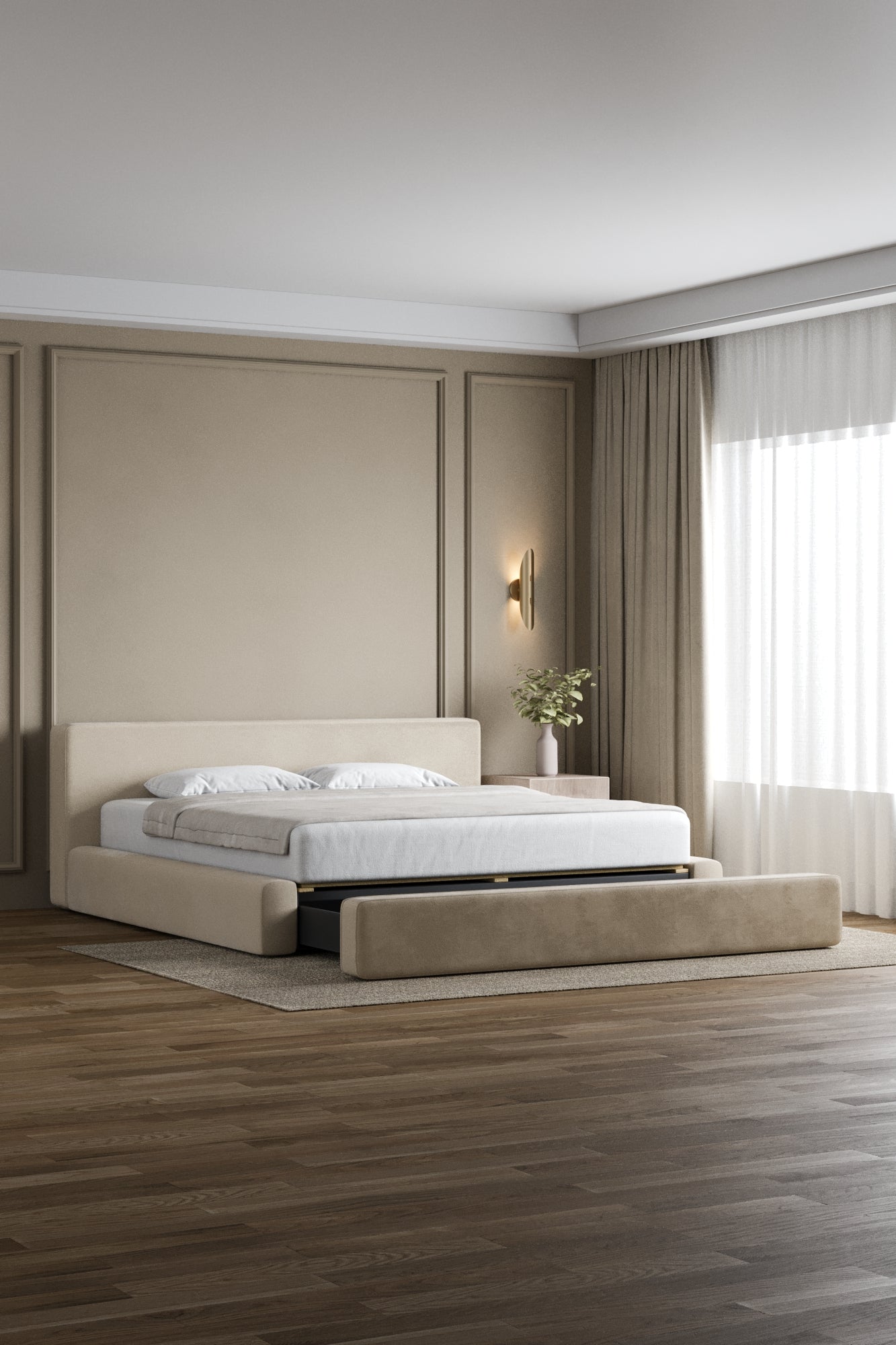 Crafted for those who seek purity in design, the Straight Headboard Storage Bed offers a pristine backdrop of soft upholstery, creating a tranquil space where rest becomes a ritual. The smooth, flush lines and low platform frame bring modern serenity to the bedroom, while its built-in storage seamlessly combines functionality with refined aesthetics. Wrapped in warm neutral tones, it blends effortlessly with minimalist or contemporary decor. With its tailored silhouette, plush texture, and hidden storage compartments, this bed offers both visual calm and everyday convenience turning your sleep space into a serene and organized personal sanctuary.
