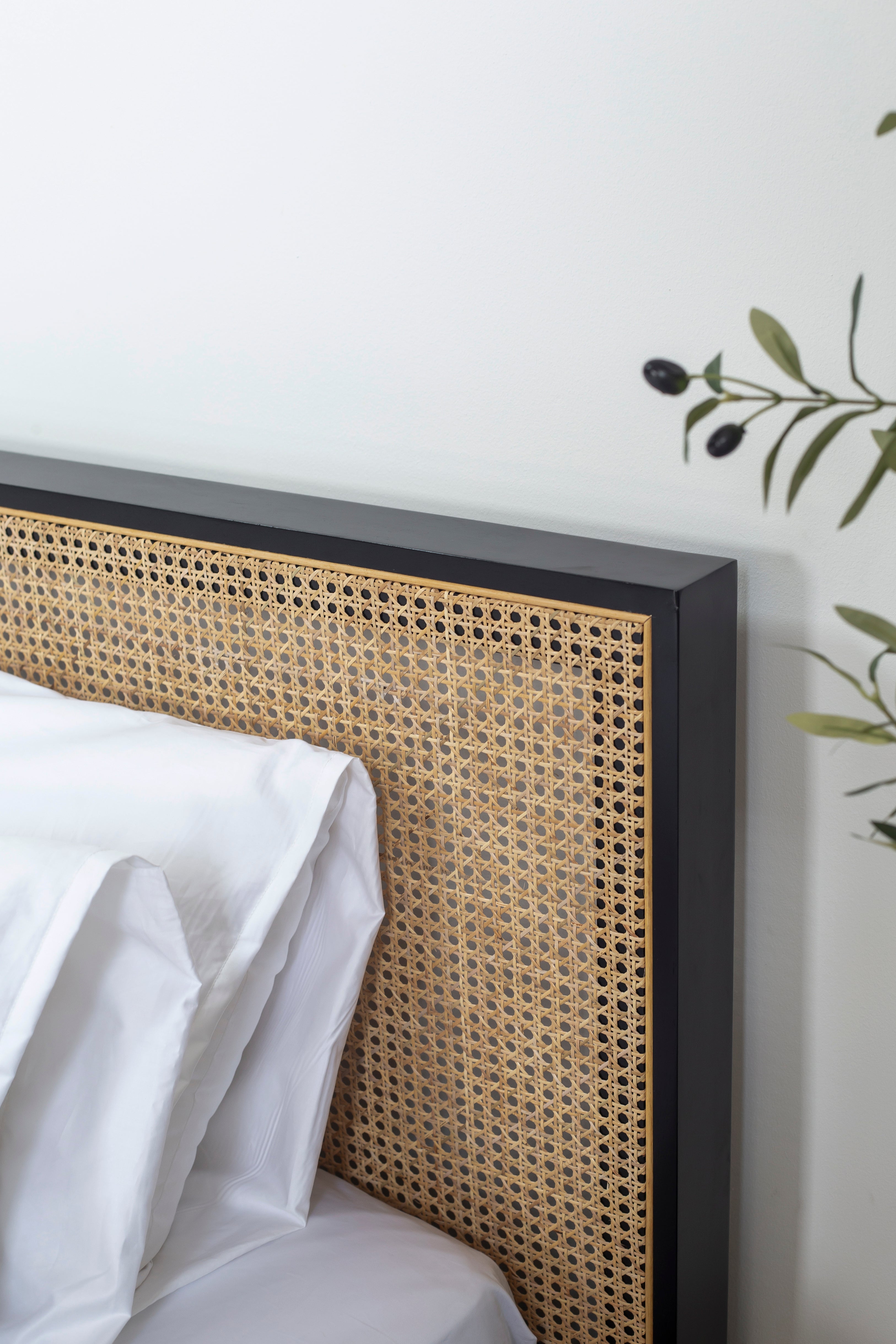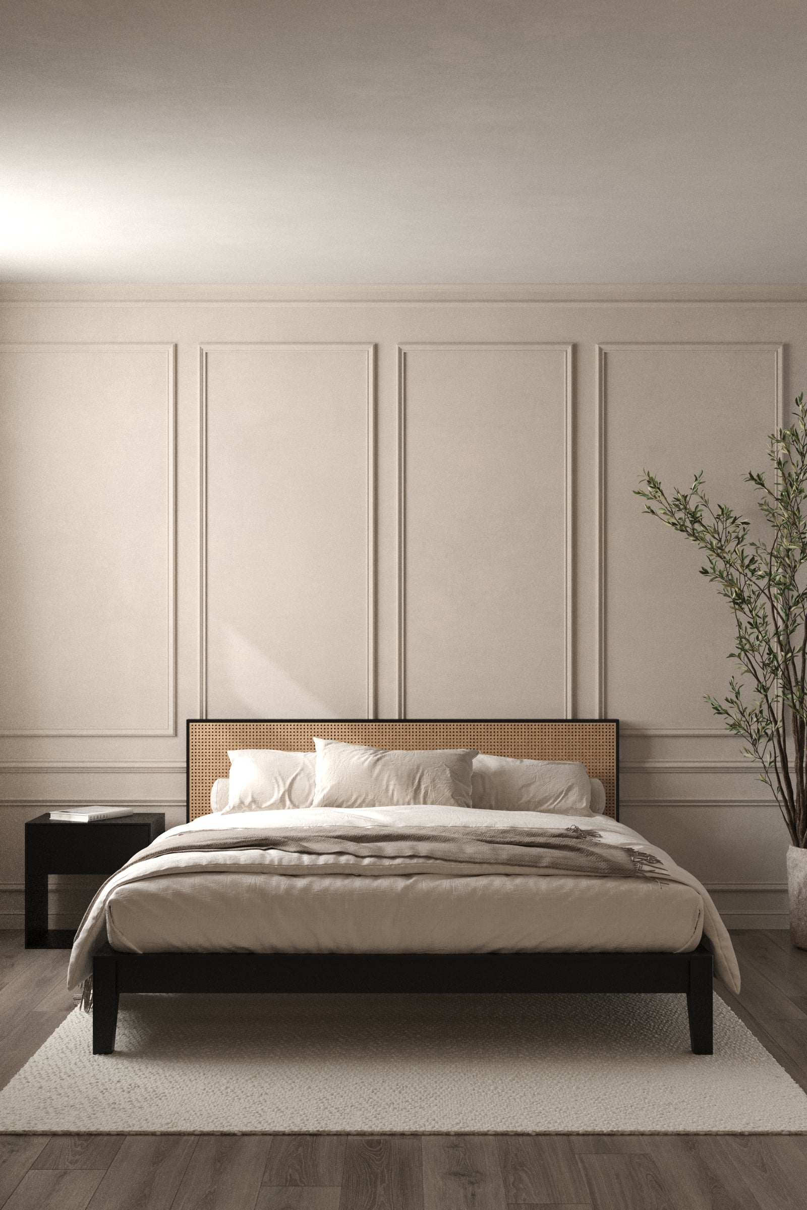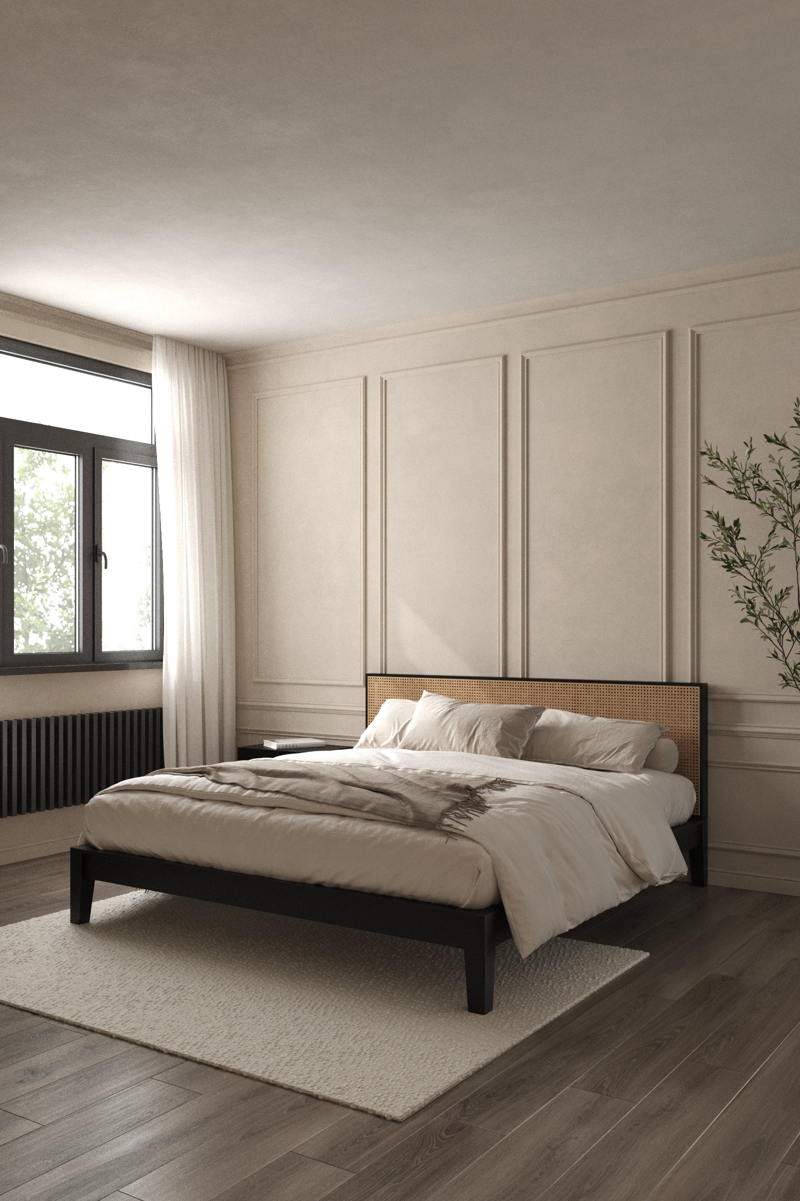 This Bed combines bold elegance with natural textures for a statement-making centerpiece. Featuring a sleek black frame crafted from finger joint rubber wood and E2 plywood, its standout rattan headboard adds a warm, organic contrast to the modern silhouette. The clean lines and minimalist design are inspired by traditional Japanese joinery, blending strength and simplicity. Perfect for contemporary, boho, or rustic interiors, this bed offers durability and timeless style with a harmonious mix of bold finishes and natural materials.