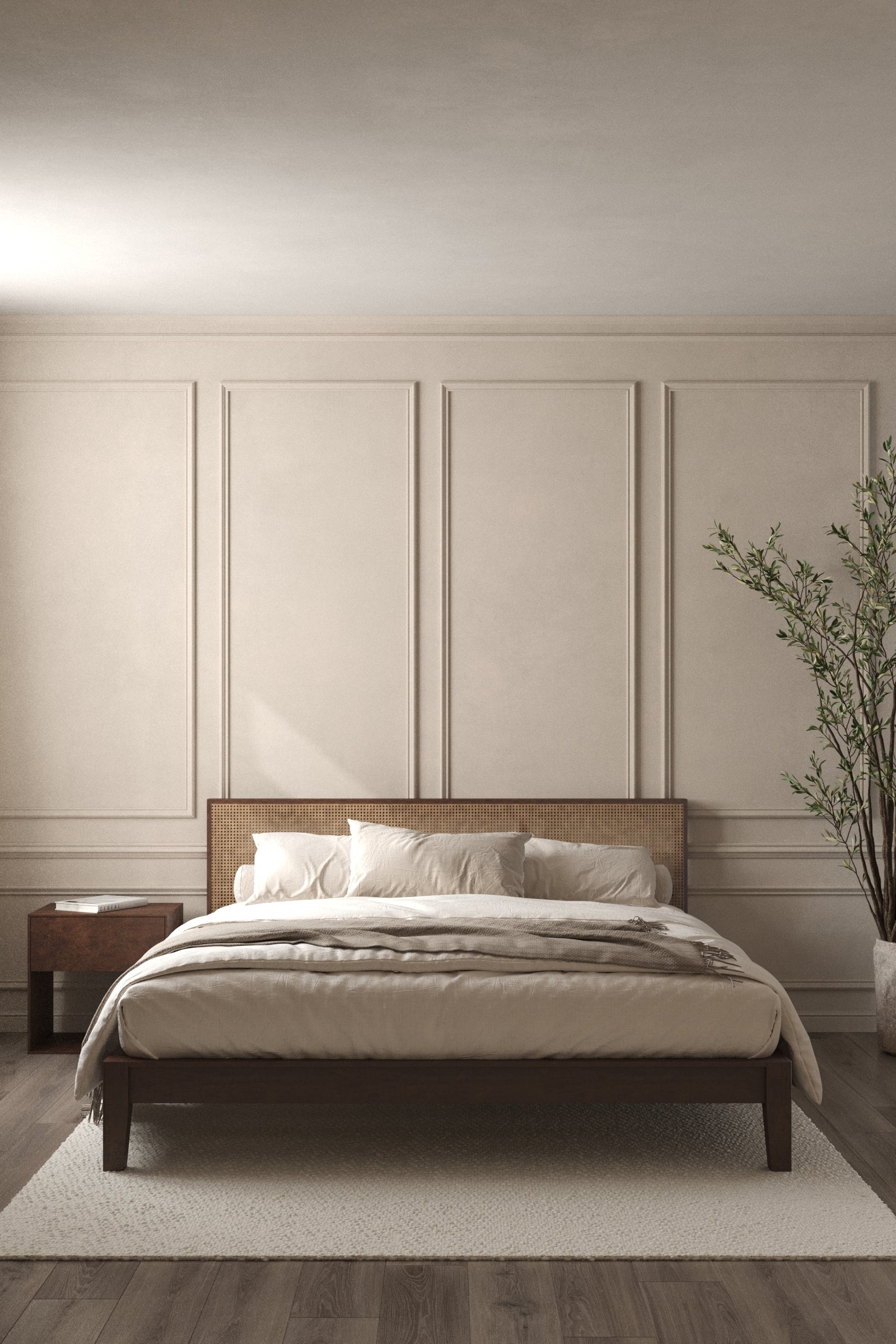 This bed showcases a sleek rectangular silhouette with clean lines and a minimalist design. Crafted from finger joint rubber wood with E2 plywood, its dark wood frame creates a striking contrast against the natural rattan headboard, adding warmth and texture. The blend of materials combines durability with an organic touch, making it a timeless piece for modern interiors. Perfectly suited for those who value elegance and functionality, this design brings Japanese-inspired aesthetics to your space.