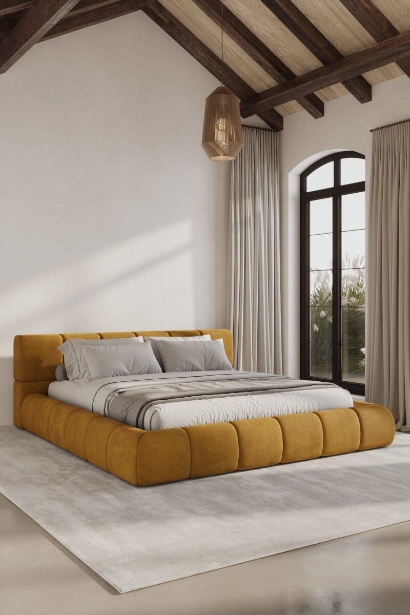 Upholstered in a rich mustard tone, the Mirela bed adds a bold yet refined touch to your bedroom. Its low-profile platform design paired with a generously padded frame creates both comfort and contemporary appeal. The smooth fabric surface and meticulous stitching highlight the craftsmanship, while the warm hue makes it an ideal accent for modern, eclectic, or minimalist interiors. A statement bed that brings vibrancy and sophistication to your space.