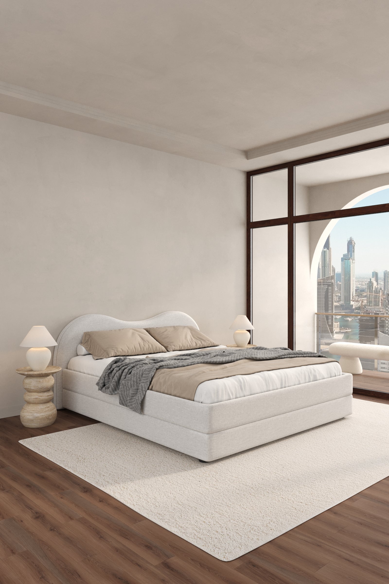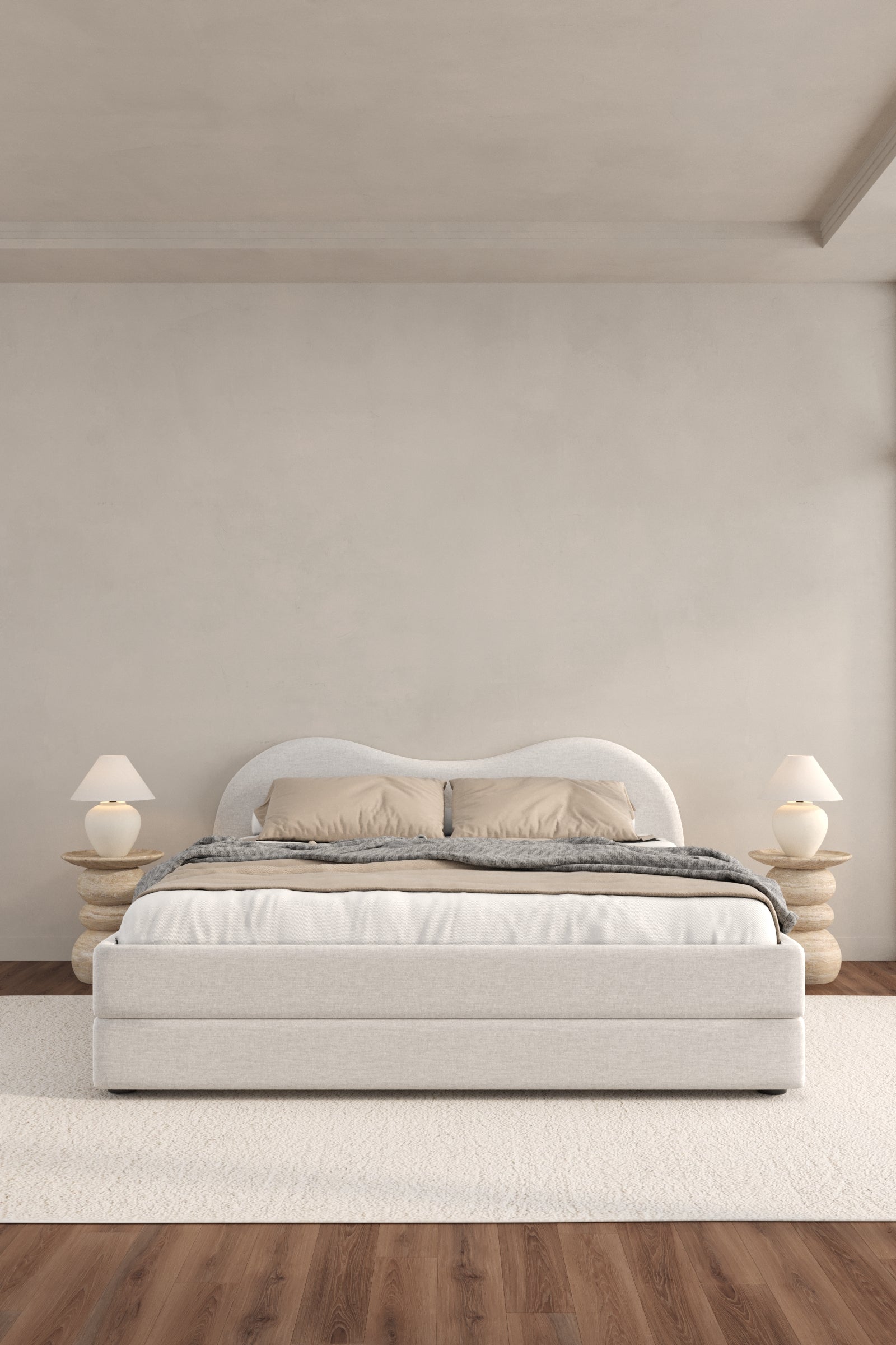With its gently curved headboard and Moonstone Beige upholstery, this bed introduces a sense of understated sophistication and warmth to any bedroom. The sculptural silhouette and neutral tone create a balanced aesthetic that complements both modern and organic interiors. Designed to serve as a serene focal point, it invites layering with textured cushions and cozy throws for a tranquil, elevated retreat. Perfect for those who value refined design and a calm, minimalist atmosphere.