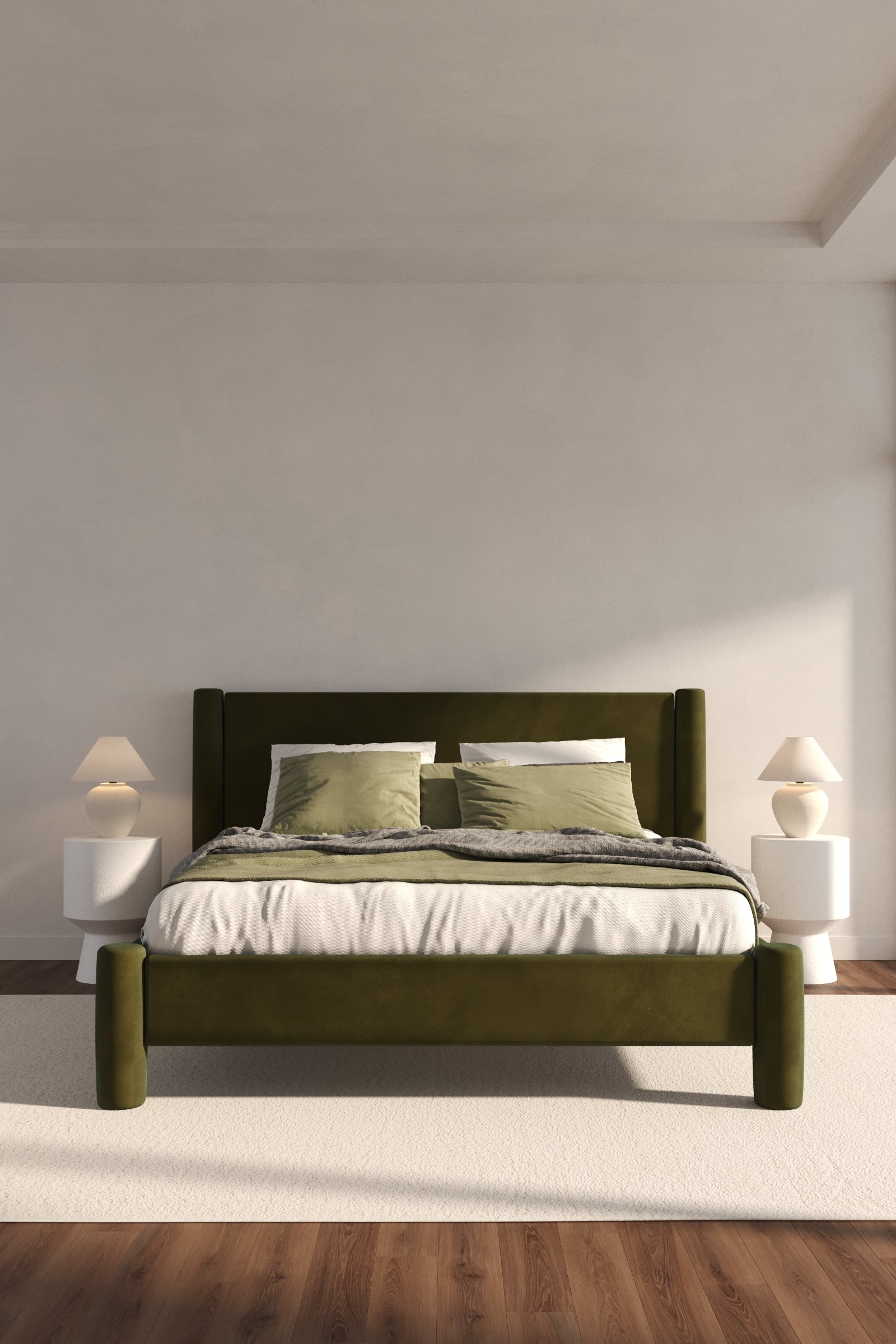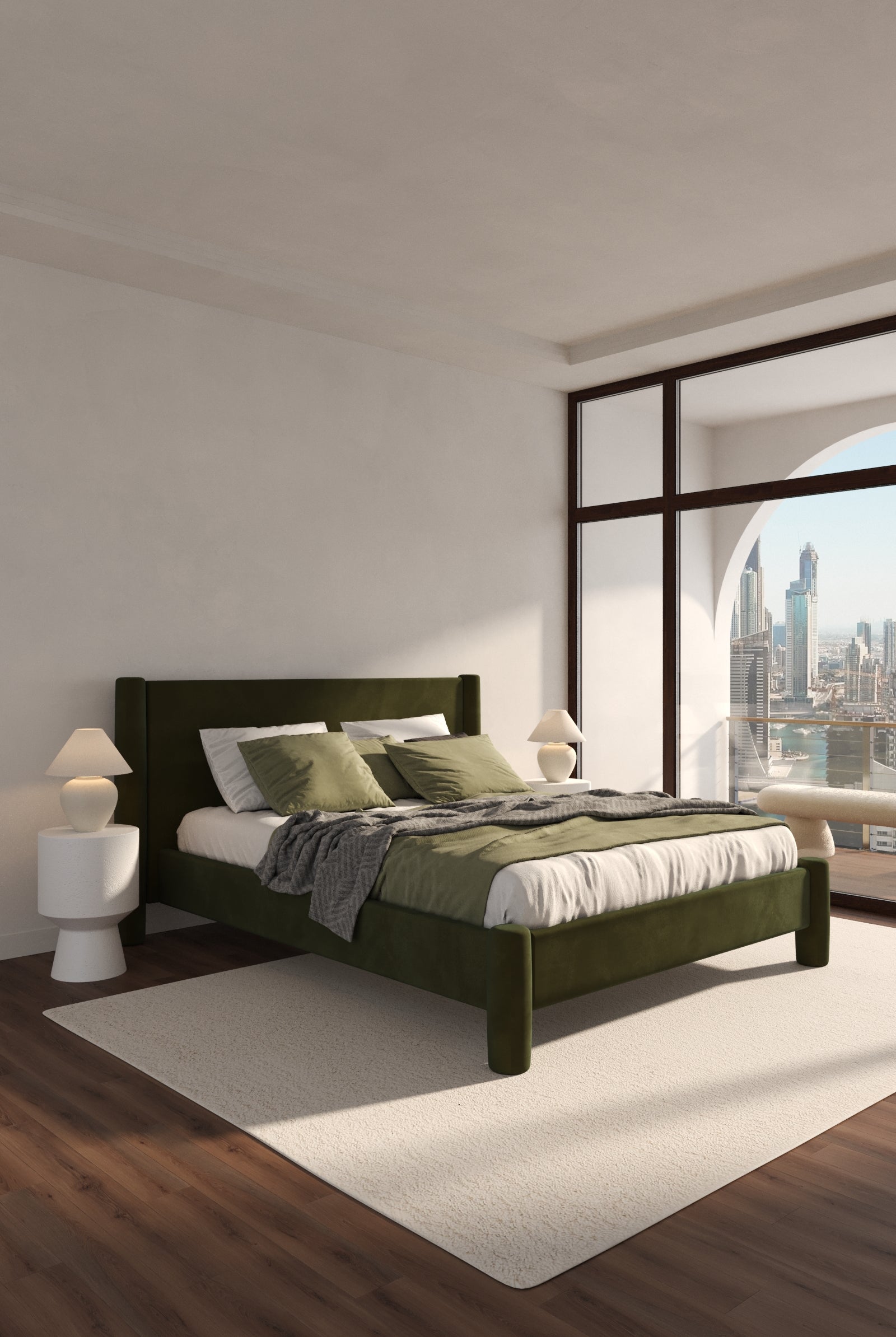 Transform your nights into a statement of style where you take center stage. Wrapped in smooth fabric, its rich MSU Green tone pairs effortlessly with clean lines and a structured frame. The minimalist shape enhances its modern appeal, while the plush upholstery adds warmth and comfort. With sturdy legs and sleek edges, this bed becomes the perfect blend of durability and sophistication for your bedroom sanctuary.