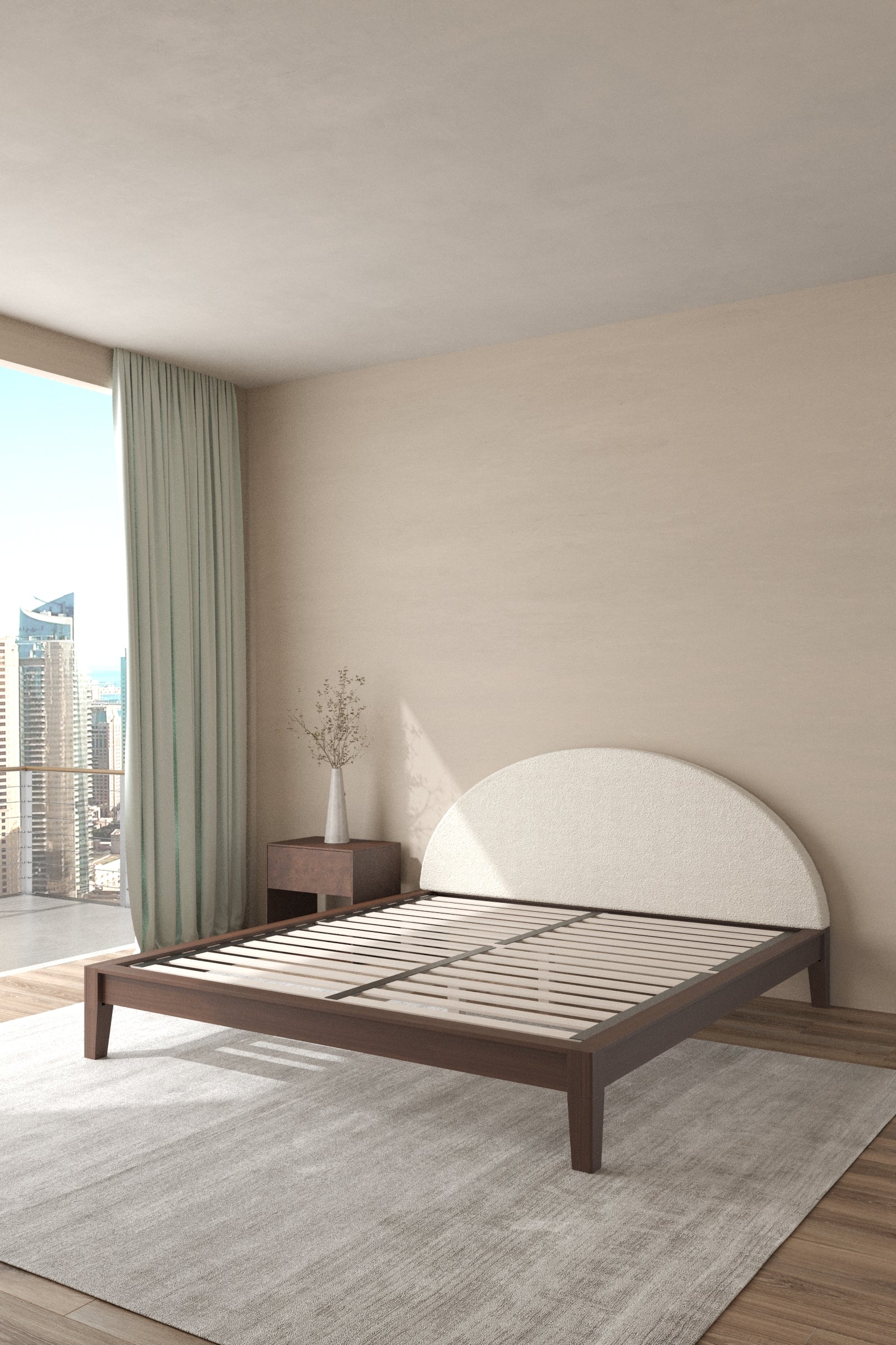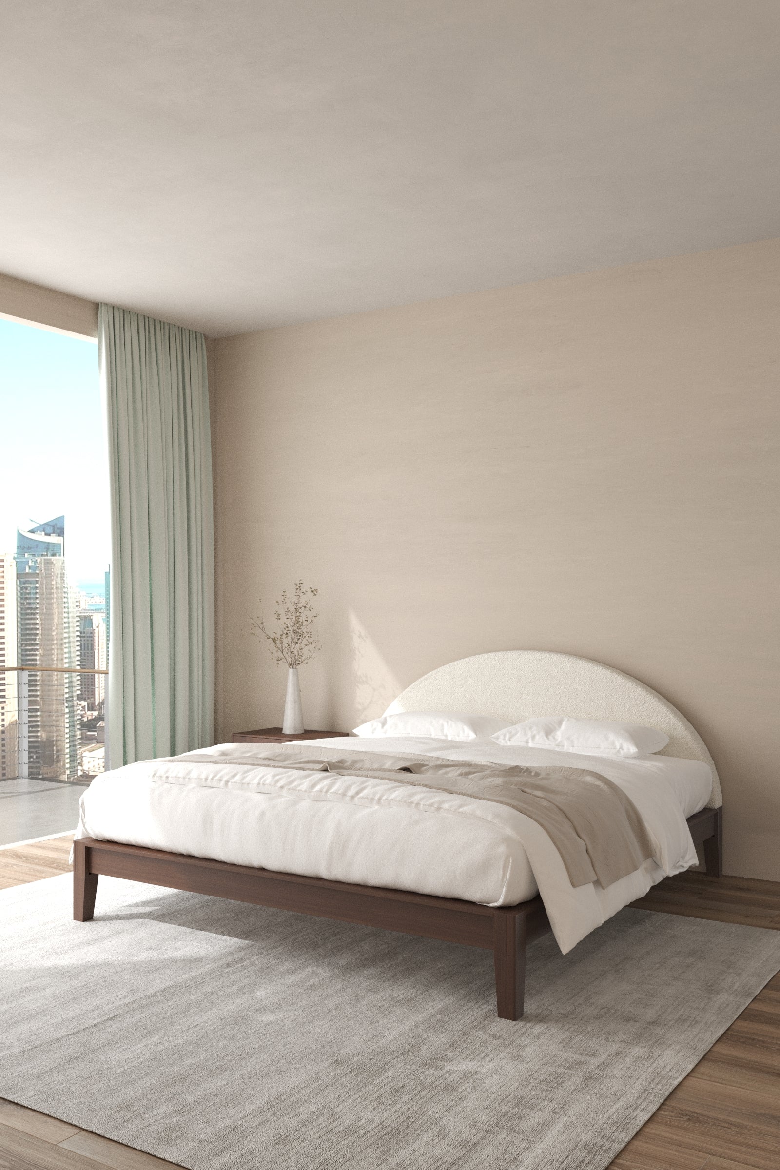 Immerse yourself in comfort and character as you lean back against a beautifully arched headboard wrapped in soft boucle fabric, framed by rich dark wood that exudes warmth and modern sophistication. Each curve flows with natural elegance, blending texture and tone in perfect harmony. Crafted with precise Japanese joinery, the structure stands strong and seamless, revealing craftsmanship meant to last a lifetime. The plush fabric invites touch, while the wooden frame grounds the piece in quiet luxury. Designed for Japandi, contemporary, or minimalist interiors, this bed transforms your room into a sanctuary of calm and style.