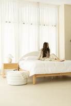 Let your space glow with calm and natural beauty as you rest against a soft boucle arch headboard framed in light wood that radiates warmth and serenity. The gentle curve draws the eye, while the texture of the fabric adds depth and tactile comfort. Crafted with precise Japanese joinery, the frame blends strength and seamless elegance, ensuring long-lasting durability. Each detail reflects minimalist design and quiet sophistication, ideal for Japandi, Scandinavian, or modern interiors. This bed invites you to unwind in a haven of balance, texture, and timeless craftsmanship.