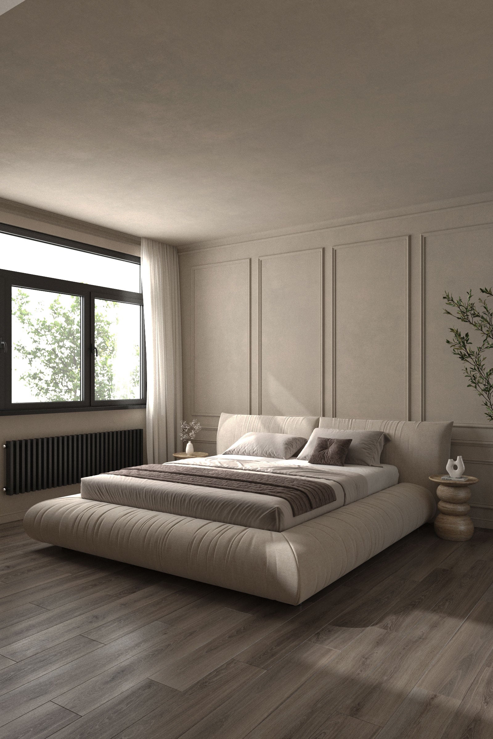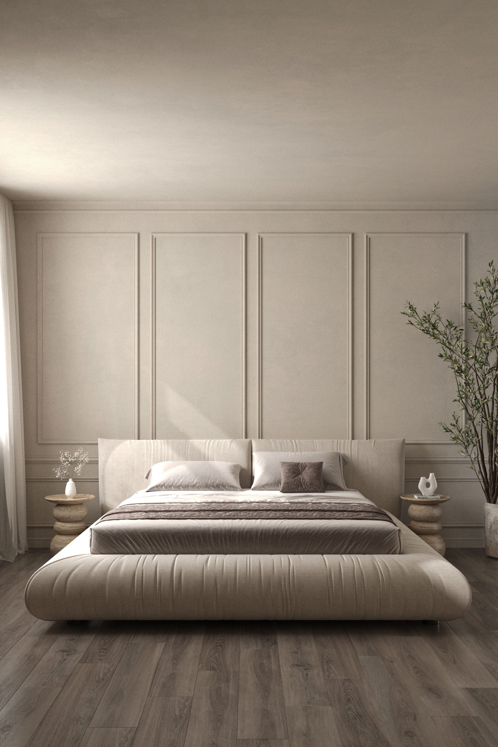 Transform your bedroom into a warm, restful haven with this modern upholstered platform bed designed for both comfort and calm. The soft beige fabric, with its natural woven texture and gentle warmth, adds depth and serenity to your space. Its low-profile platform and subtly curved edges create a grounded, contemporary silhouette that feels inviting from every angle. The padded headboard offers plush support for relaxed reading or quiet mornings in bed, while the neutral tone harmonizes effortlessly with wood accents, soft linens, and minimalist décor. A true balance of texture, tranquility, and timeless style.
