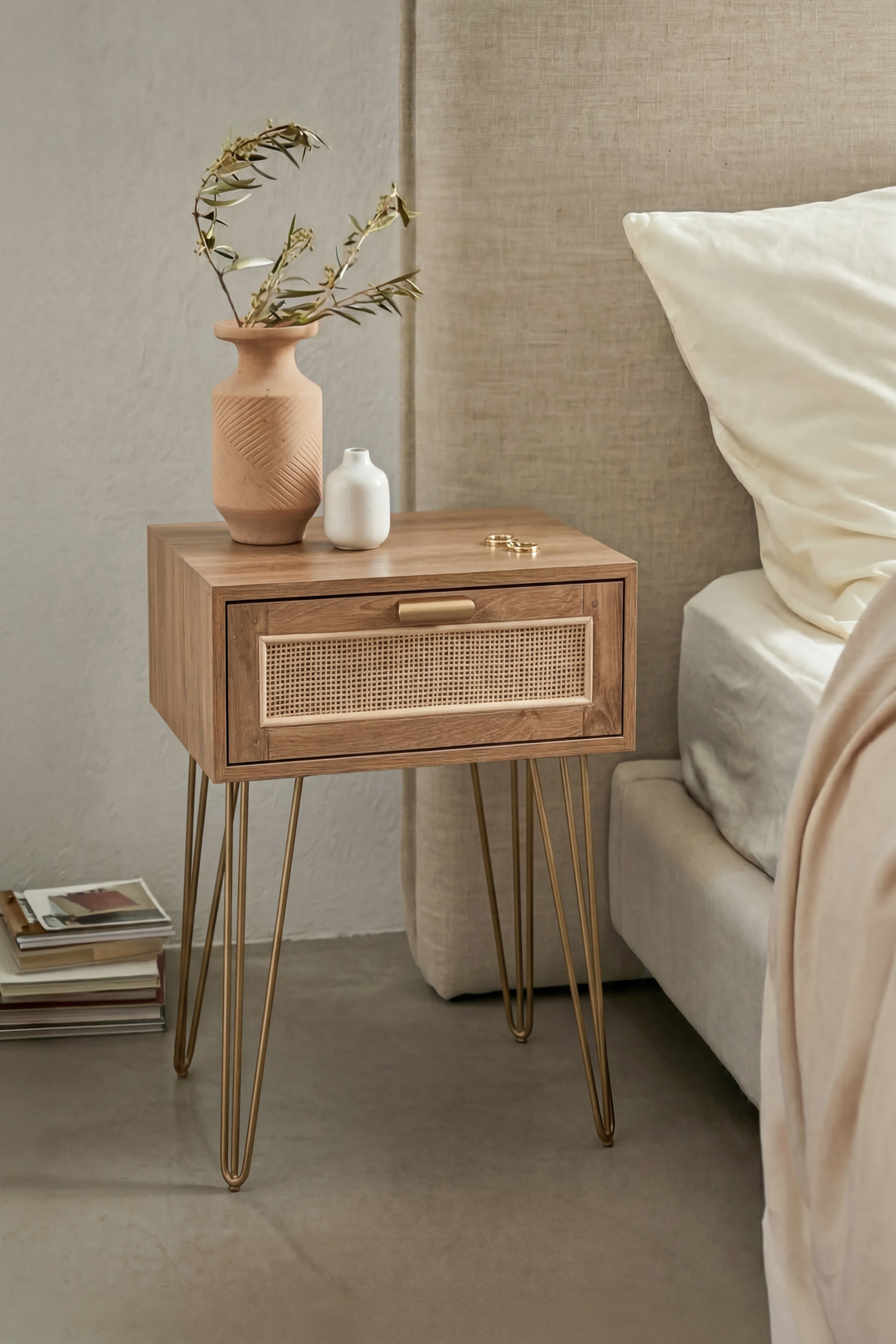 A warm and inviting addition to any bedroom, this bedside table showcases the natural beauty of teak wood paired with finely woven rattan detailing for a light and textured finish. The softly rounded edges create a gentle silhouette, while the drawer and lower shelf provide practical storage for your everyday essentials. Designed to bring a sense of calm and balance, it blends seamlessly into modern and organic interiors with an effortlessly refined presence.