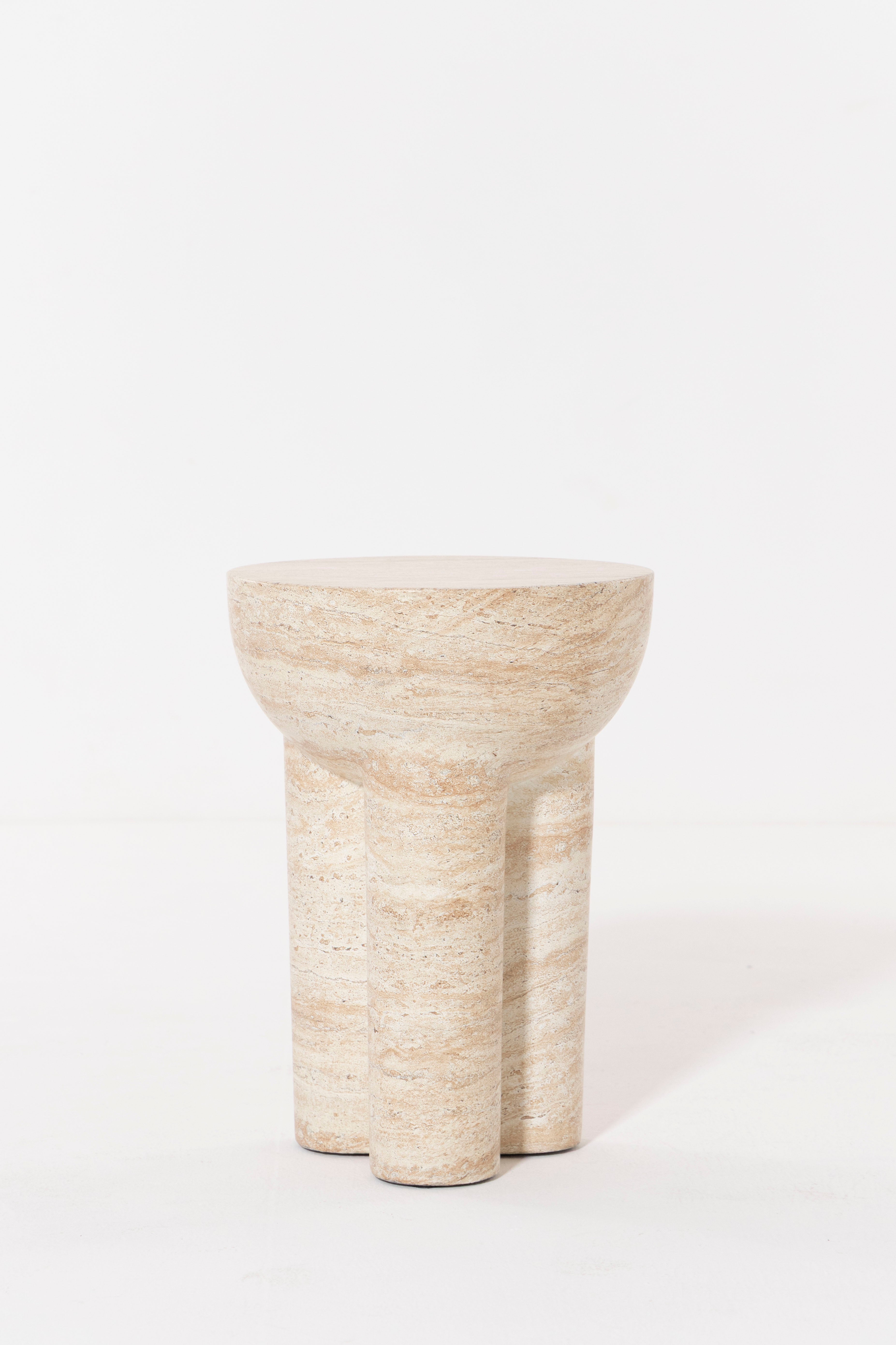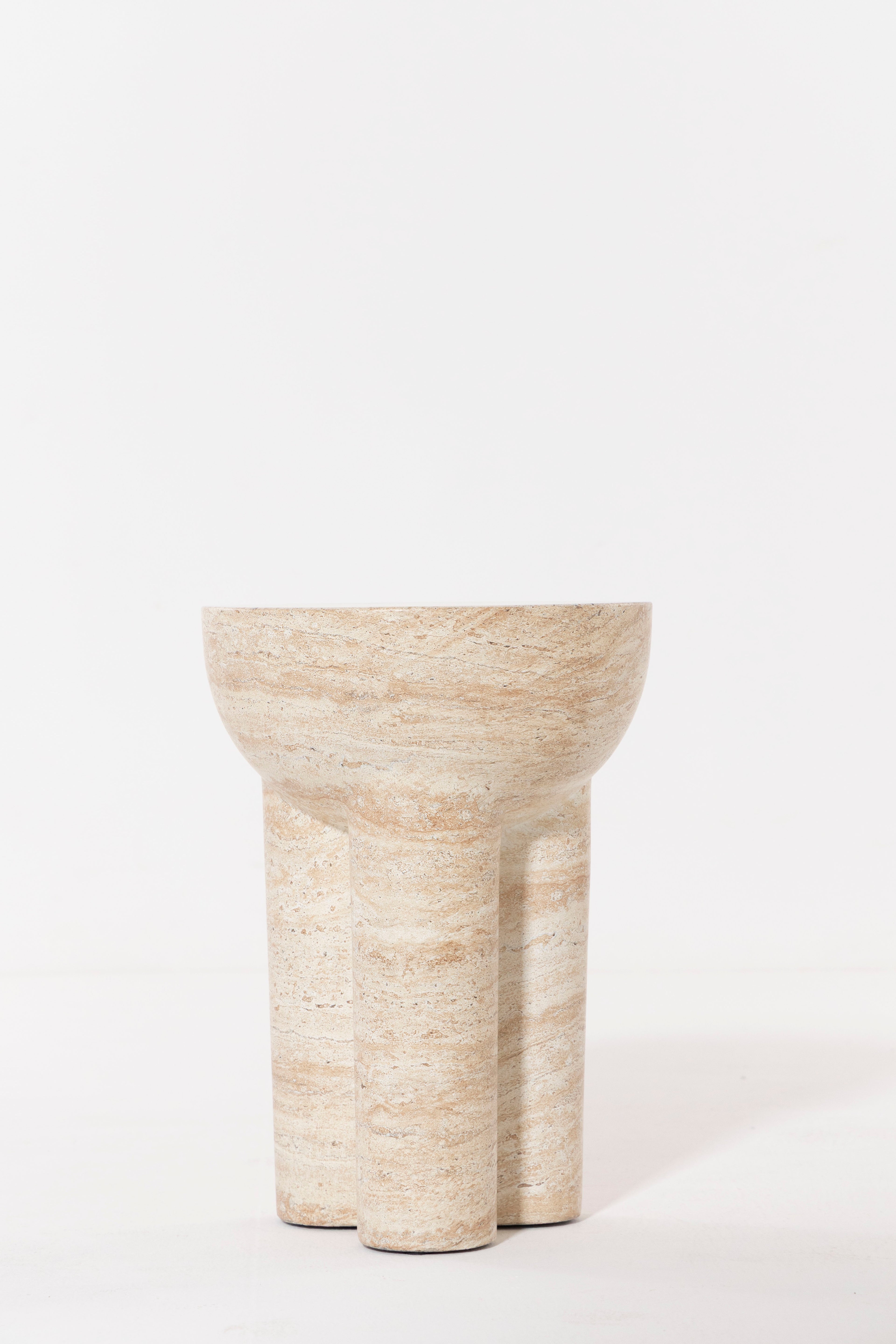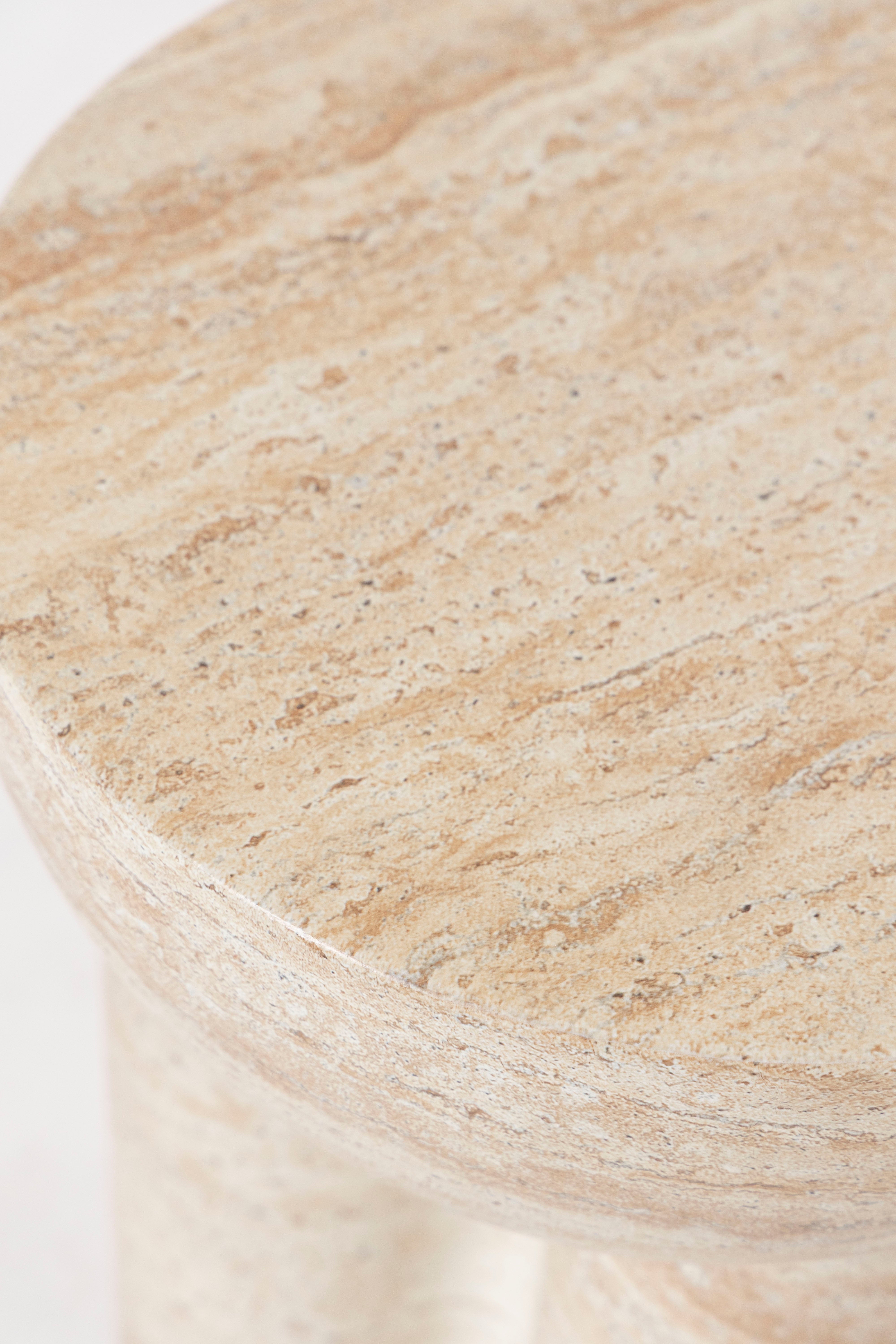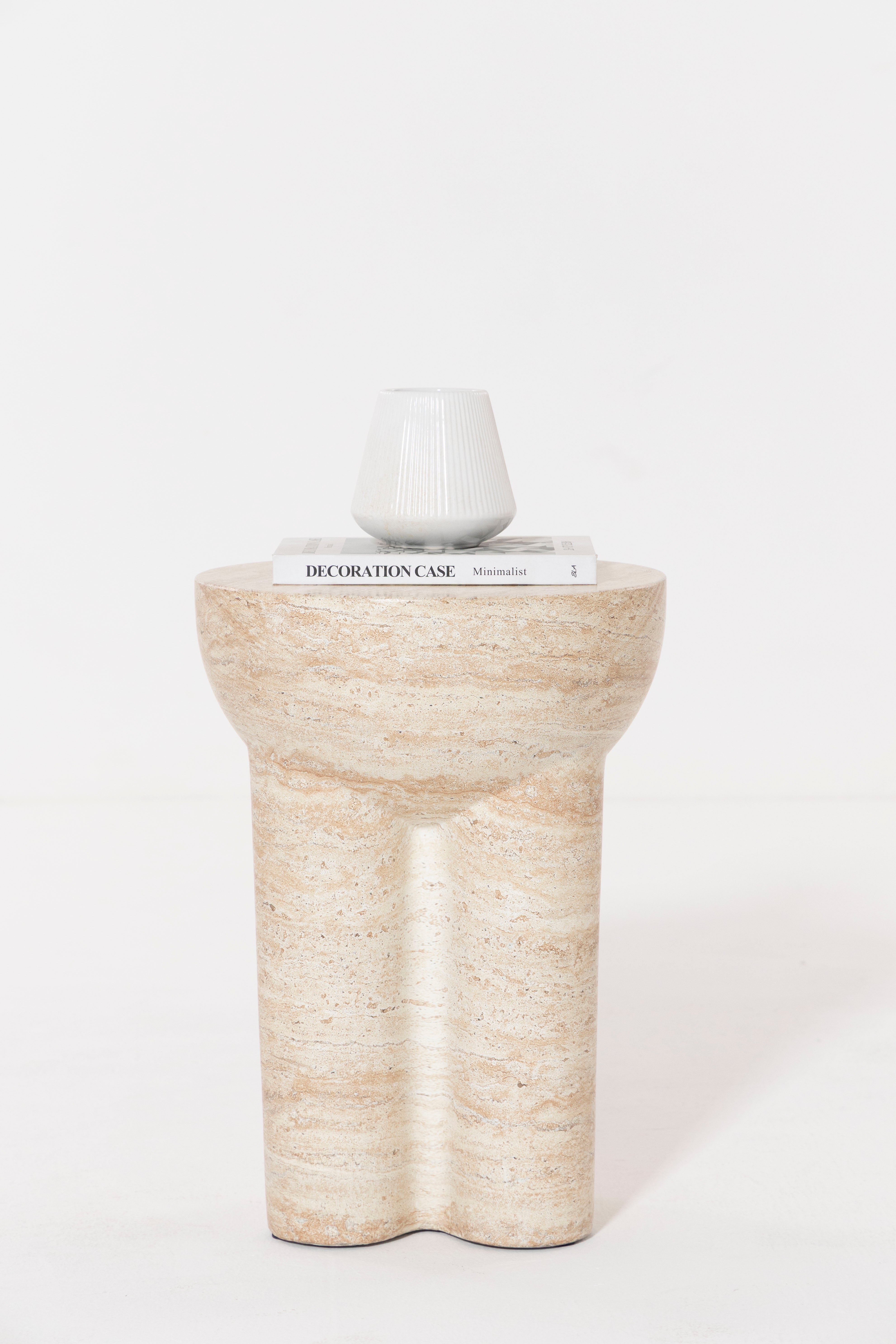 Exemplifying minimalist elegance, this sculptural side table is crafted from premium Fiber Reinforced Concrete with a refined travertine finish that brings subtle texture and natural character to its contemporary form. A smooth, rounded top rests on three bold cylindrical legs, creating an architecturally inspired silhouette that blends seamlessly into modern or minimalist interiors. Durable and striking, its tactile surface offers both visual depth and a sturdy feel, making it a versatile accent for living spaces, bedrooms, or semi-outdoor areas. With its clean lines and timeless presence, this piece adds a touch of modern artistry while maintaining practicality and lasting appeal.