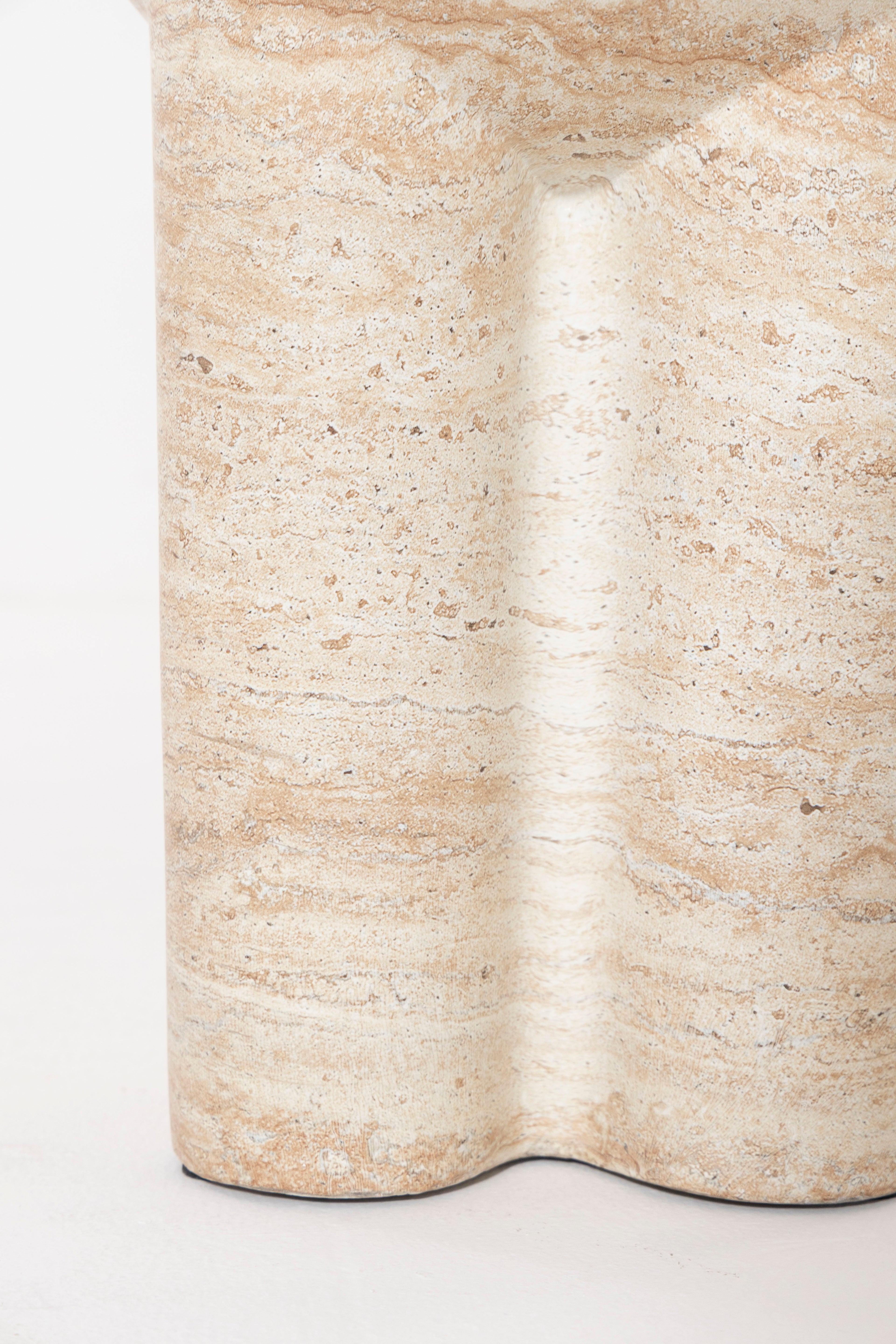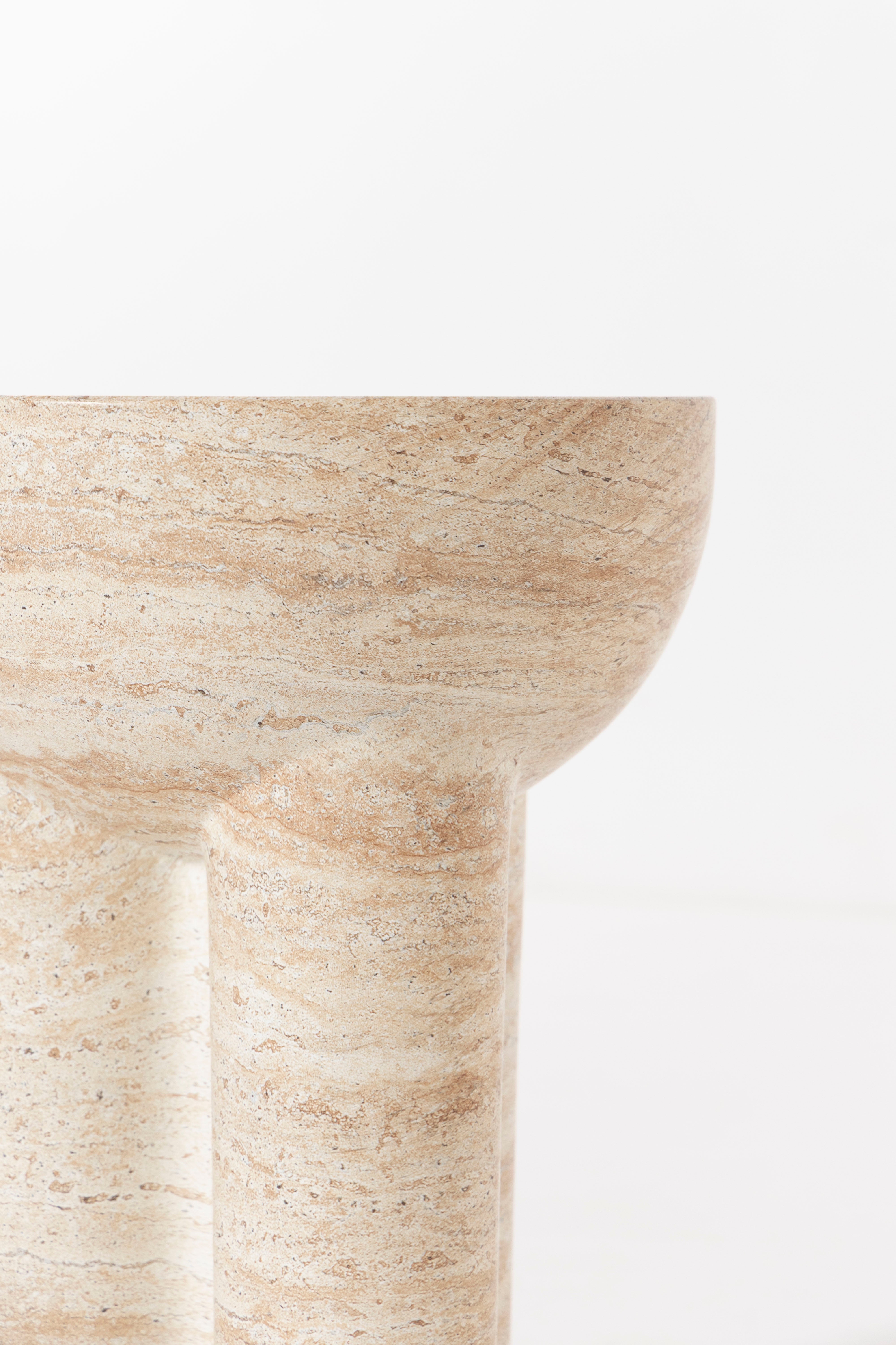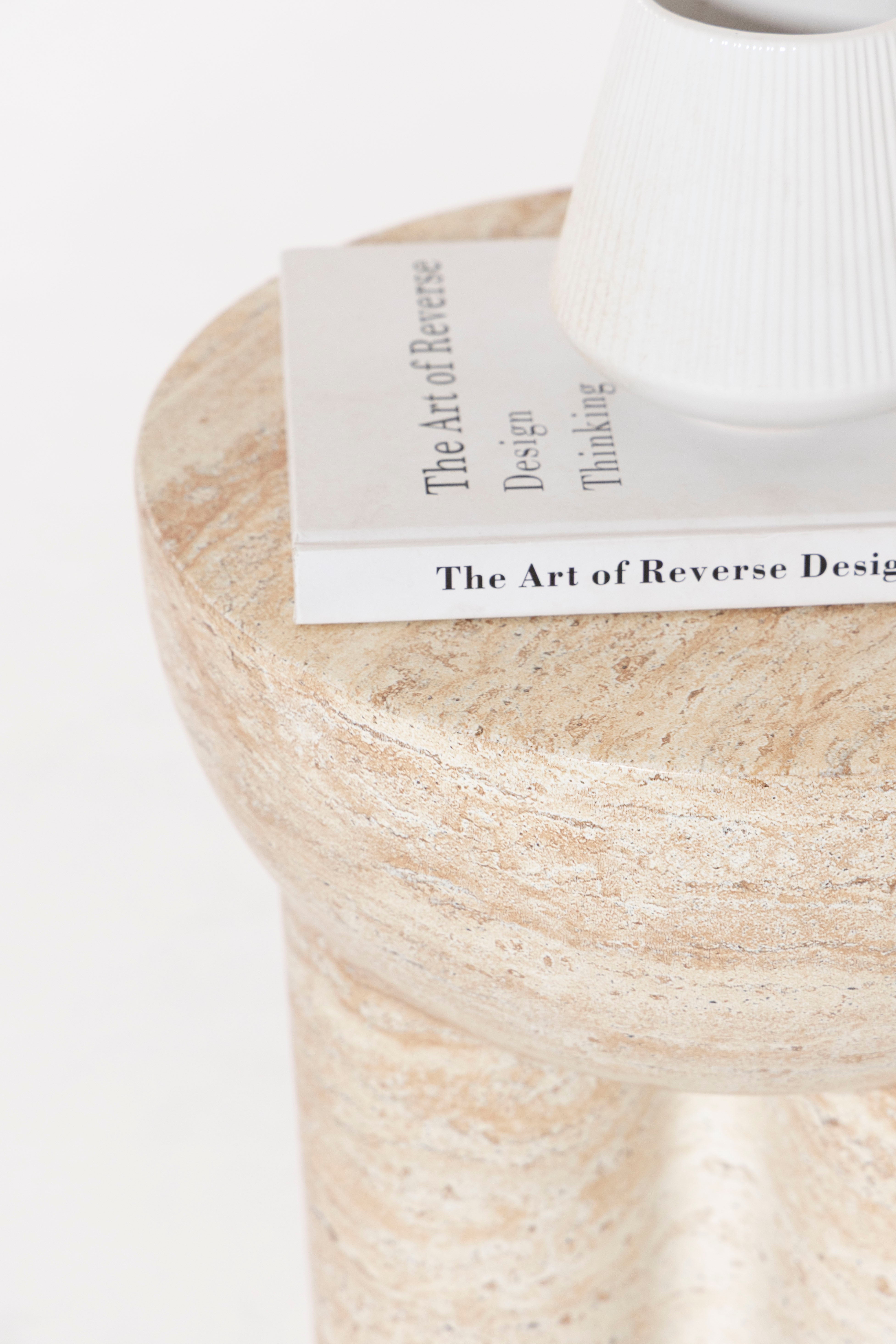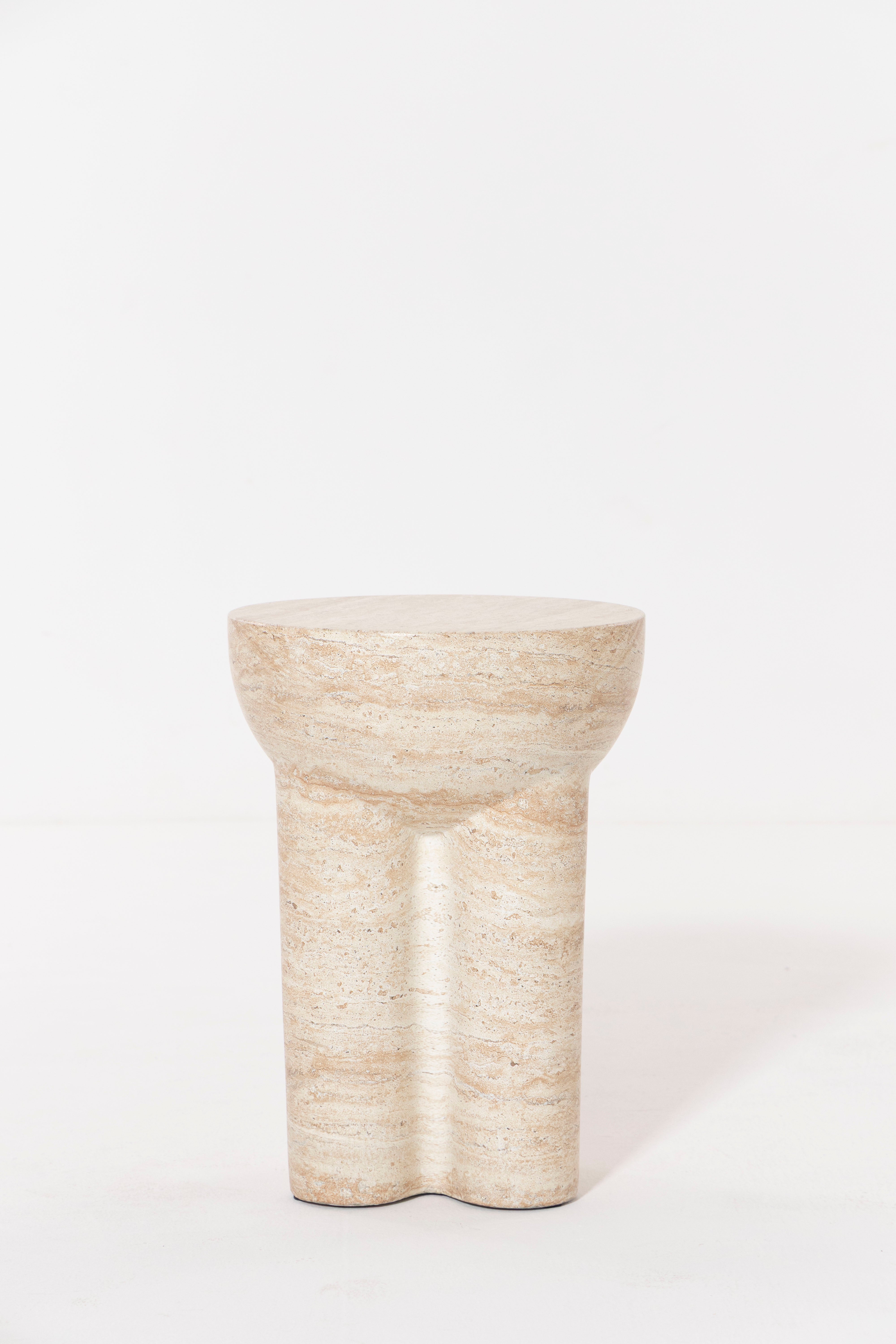 Exemplifying minimalist elegance, this sculptural side table is crafted from premium Fiber Reinforced Concrete with a refined travertine finish that brings subtle texture and natural character to its contemporary form. A smooth, rounded top rests on three bold cylindrical legs, creating an architecturally inspired silhouette that blends seamlessly into modern or minimalist interiors. Durable and striking, its tactile surface offers both visual depth and a sturdy feel, making it a versatile accent for living spaces, bedrooms, or semi-outdoor areas. With its clean lines and timeless presence, this piece adds a touch of modern artistry while maintaining practicality and lasting appeal.