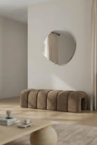 Designed to anchor a space with quiet confidence, this sculptural bench brings warmth and softness through its plush boucle upholstery and rounded, architectural form. The rich brown tone adds depth while remaining effortlessly neutral, making it ideal for living rooms, bedrooms, or refined entryways. Its low profile and generous curves invite relaxed seating while elevating the room with a modern, gallery like presence. A statement piece that balances comfort, texture, and timeless design in one seamless silhouette.