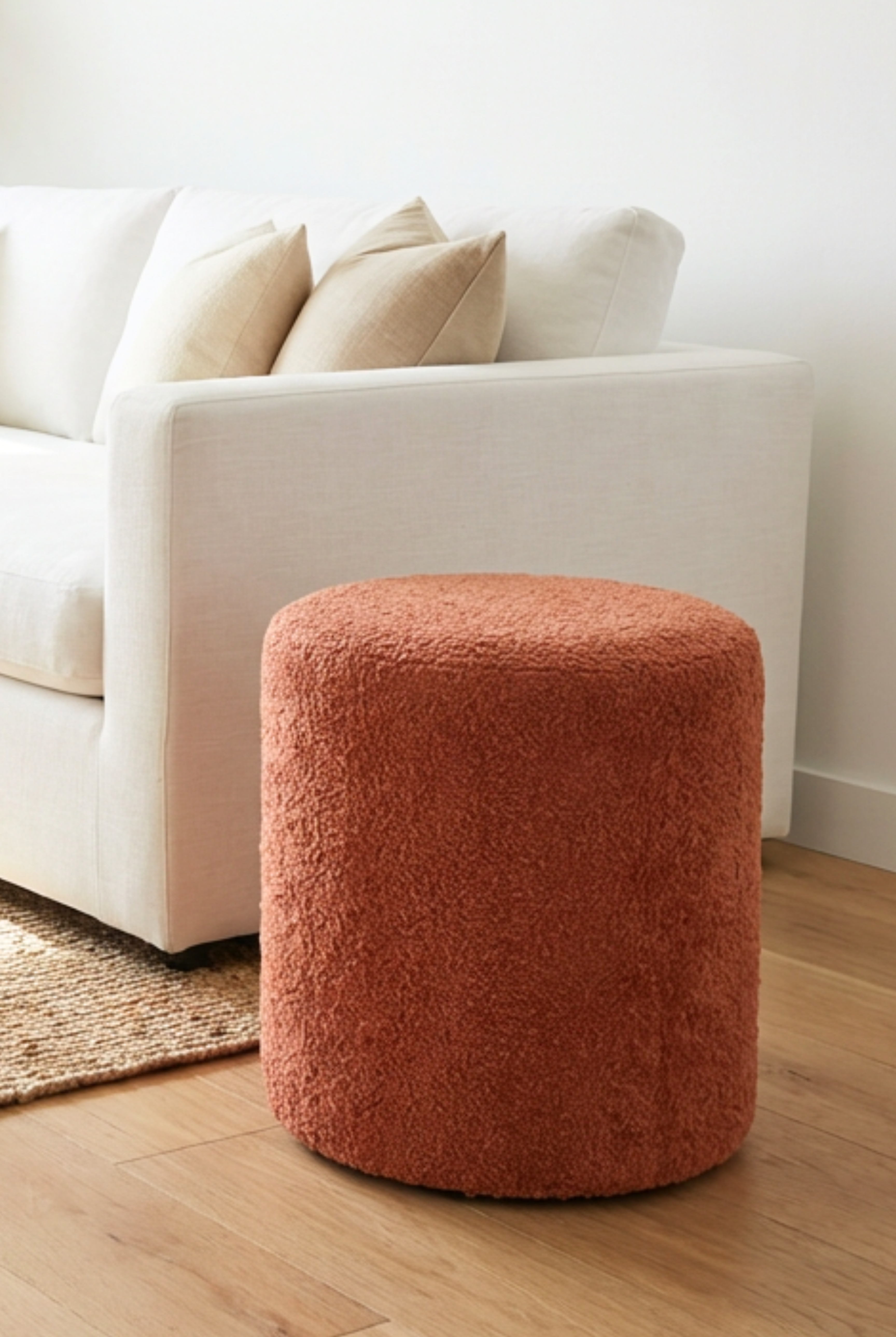 A touch of effortless charm meets cozy functionality in this plush round pouf. Wrapped in a textured boucle or fabric with a rich, tactile weave, it brings warmth and style to any space. The cylindrical silhouette, paired with its inviting cushioned top, makes it a versatile accent, perfect as a footrest, extra seating, or a chic decorative piece. Whether in a bold mustard hue or a sleek neutral tone, this pouf adds character to modern, boho, or contemporary interiors.
