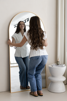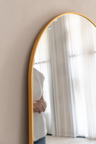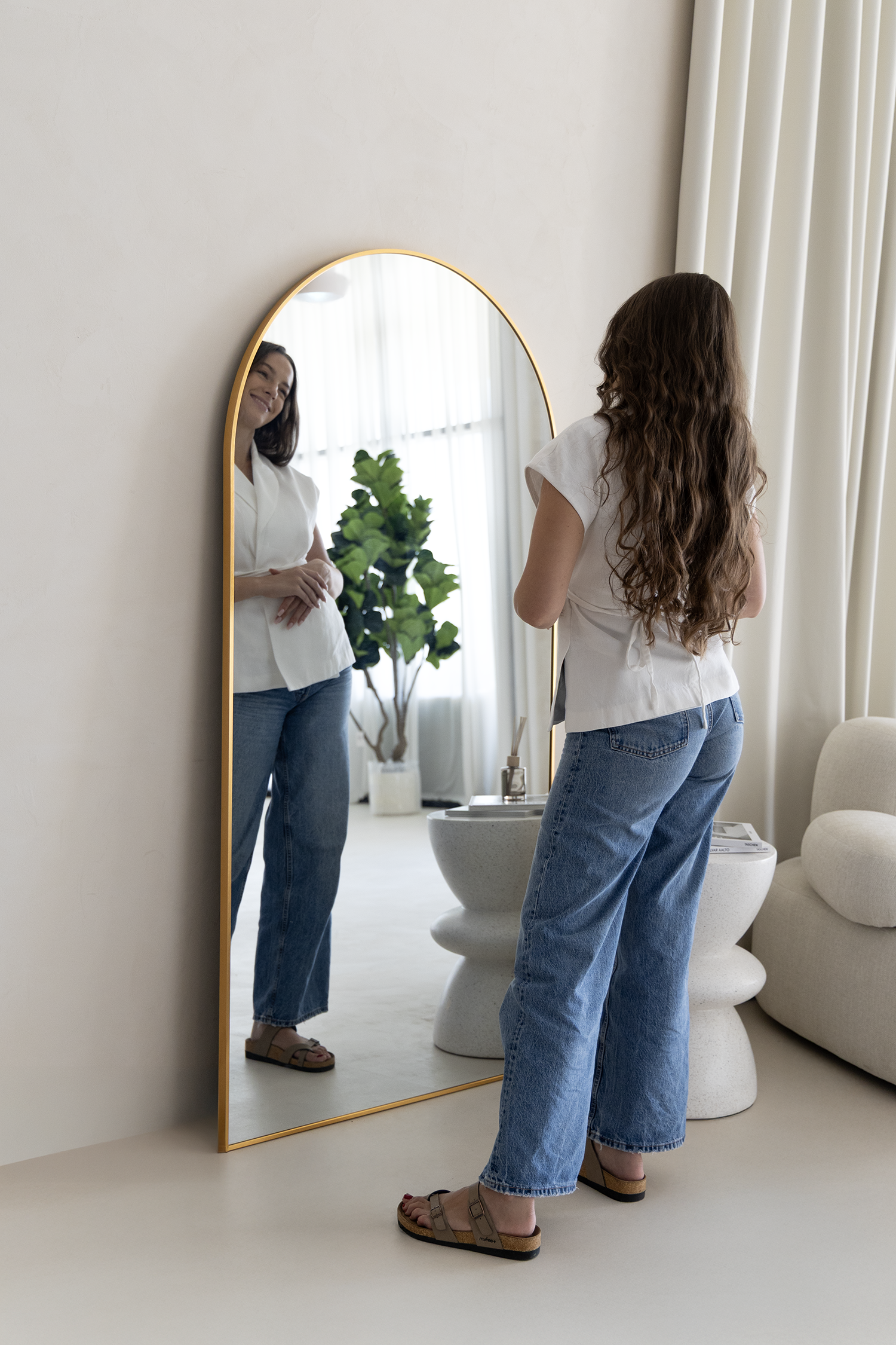 The striking gold color of the frame adds a luxurious and contemporary touch, while the rounded top shape enhances the visual appeal. The built-in wall mount offers versatile placement options - hang it securely on the wall or lean it against it for a stylish look.