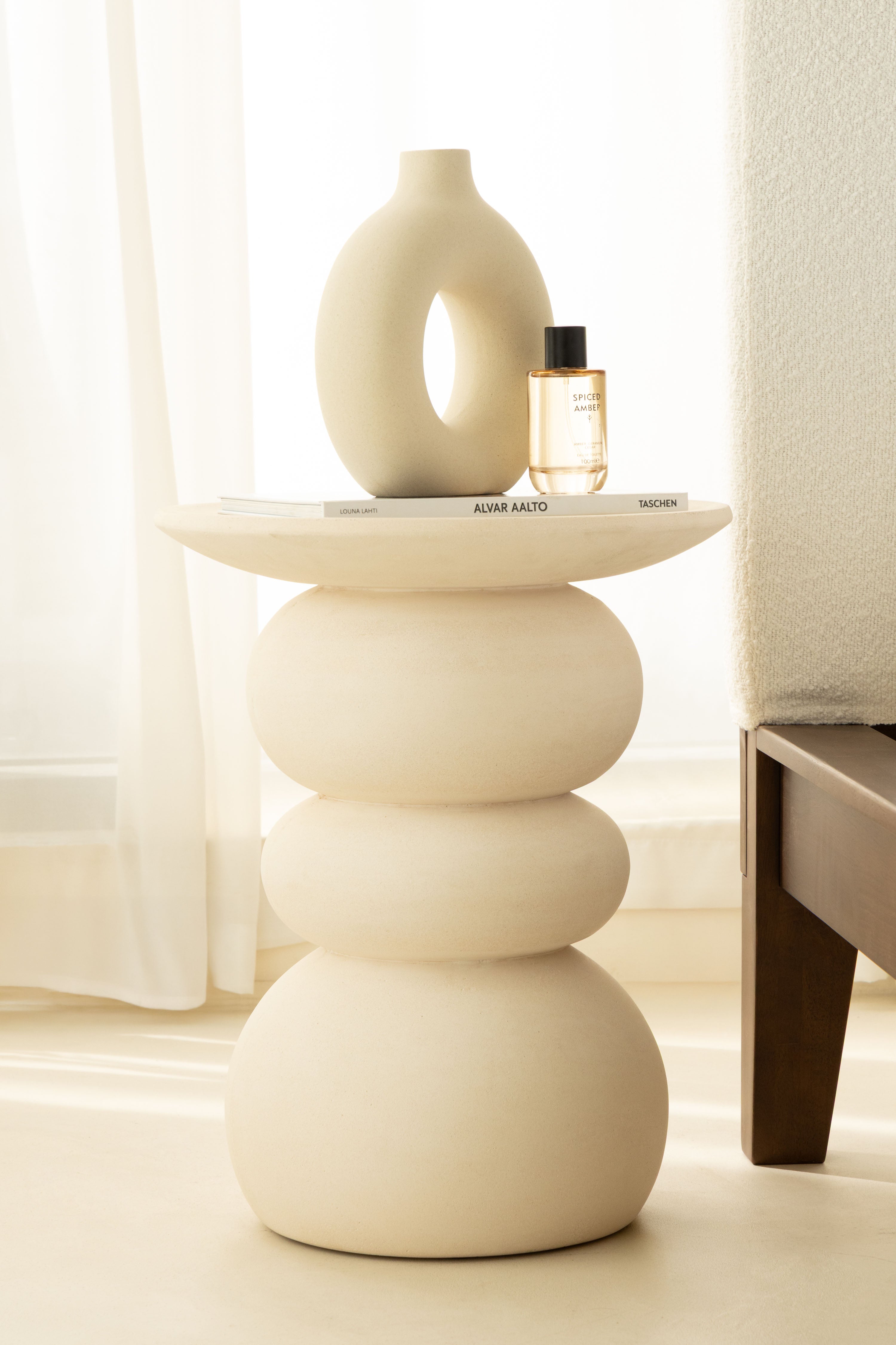 A serene blend of form and function, this off-white concrete side table is a sculptural statement piece for modern interiors. Featuring a hand-finished, pebble-stacked silhouette, its soft curves and organic shape add a sense of calm and visual interest to any room. The smooth matte texture and grounded concrete build offer both durability and style, making it ideal as a bedside table, living room accent, or decorative stand in minimalist, Japandi, or earthy-toned spaces. Its understated elegance effortlessly complements neutral palettes while serving as a functional surface for everyday essentials or curated decor.