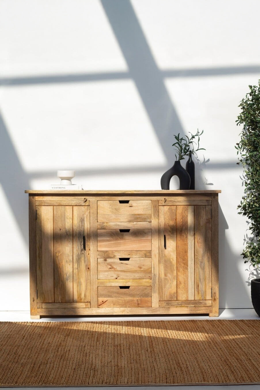 Introducing the Esther Mango Wood Sideboard – a stunning piece crafted from rich mango wood, boasting ample storage and a vintage-inspired finish.