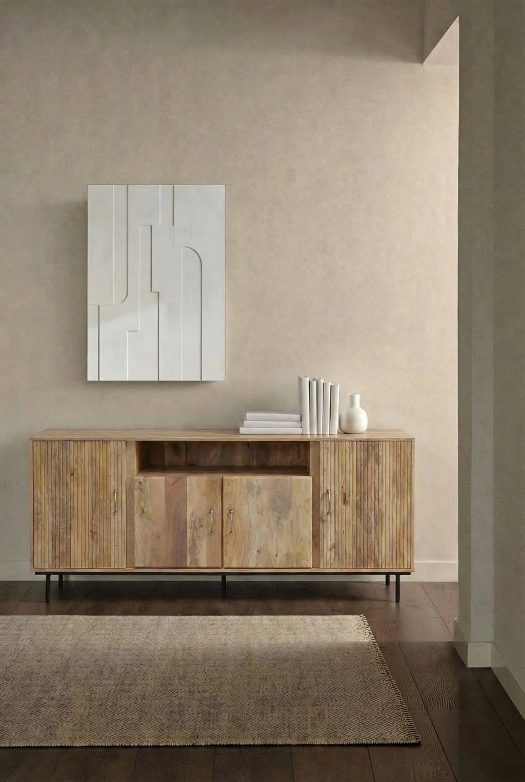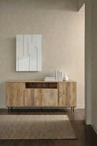 Crafted from natural solid wood, this sideboard highlights rich organic grain patterns and subtle tonal variations that bring warmth and depth into your space. The mixed vertical panel detailing adds texture and visual interest, while the slim dark metal base creates a light modern contrast. Designed to elevate your living or dining interior, it allows you to organize essentials behind clean structured doors while maintaining a refined Italian inspired aesthetic that feels both contemporary and timeless.