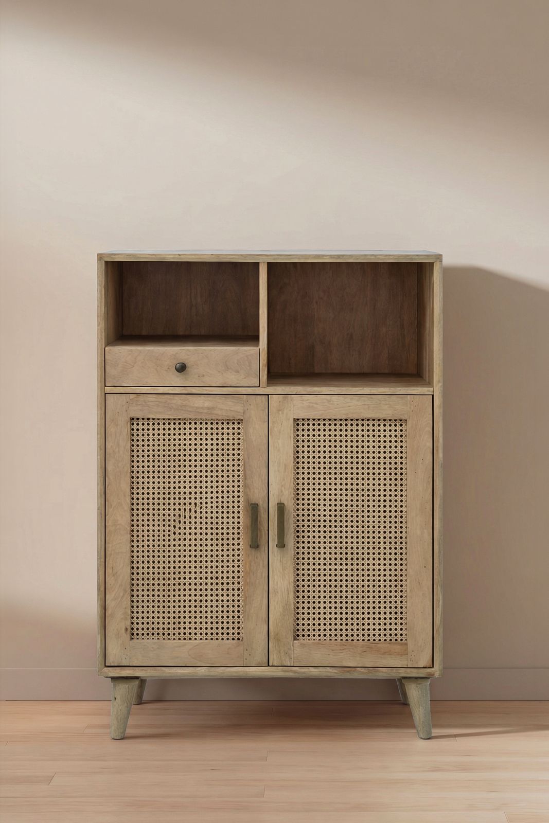 Crafted in light natural wood, this bar cabinet features woven rattan door panels that introduce airy texture and artisanal character into your entertaining space. The open upper compartment allows you to display glassware and décor beautifully, while the concealed lower storage keeps bottles and essentials neatly organized. Warm beige and honey toned grain patterns enhance its organic depth, complemented by minimalist handles and tapered legs. Designed to elevate your hosting experience, it brings refined Spanish charm, natural warmth, and timeless modern sophistication into your home.