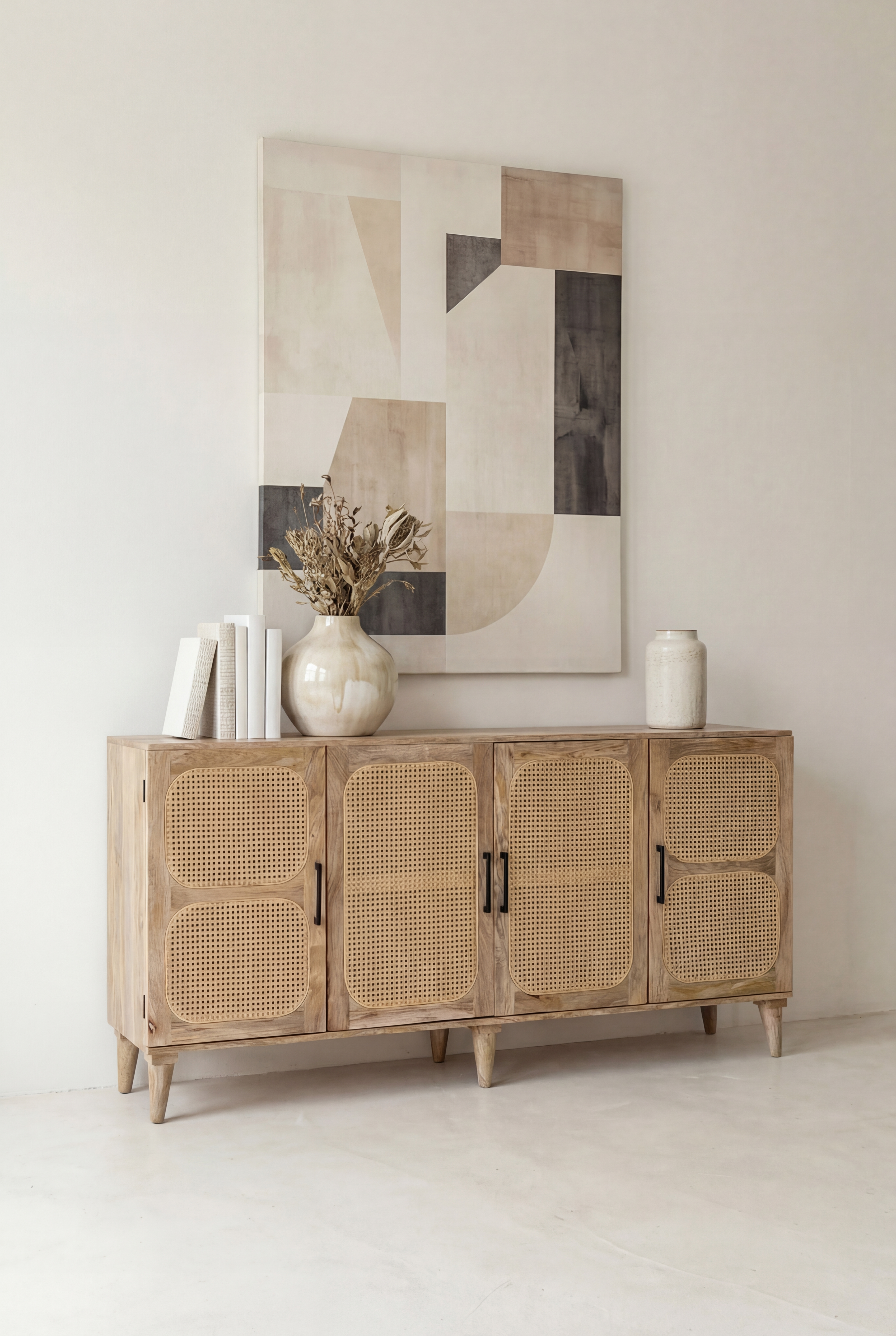Bring warmth and texture into your interior with a natural wood sideboard featuring handwoven rattan panels, soft rounded framing, and a light organic finish that highlights the beauty of the wood grain. The airy cane detailing creates visual depth while maintaining a clean, modern silhouette, and the spacious concealed storage allows you to style your dining or living area with effortless elegance. Perfect for Mediterranean, Scandinavian, and contemporary homes, this piece adds a relaxed yet refined atmosphere to your space.