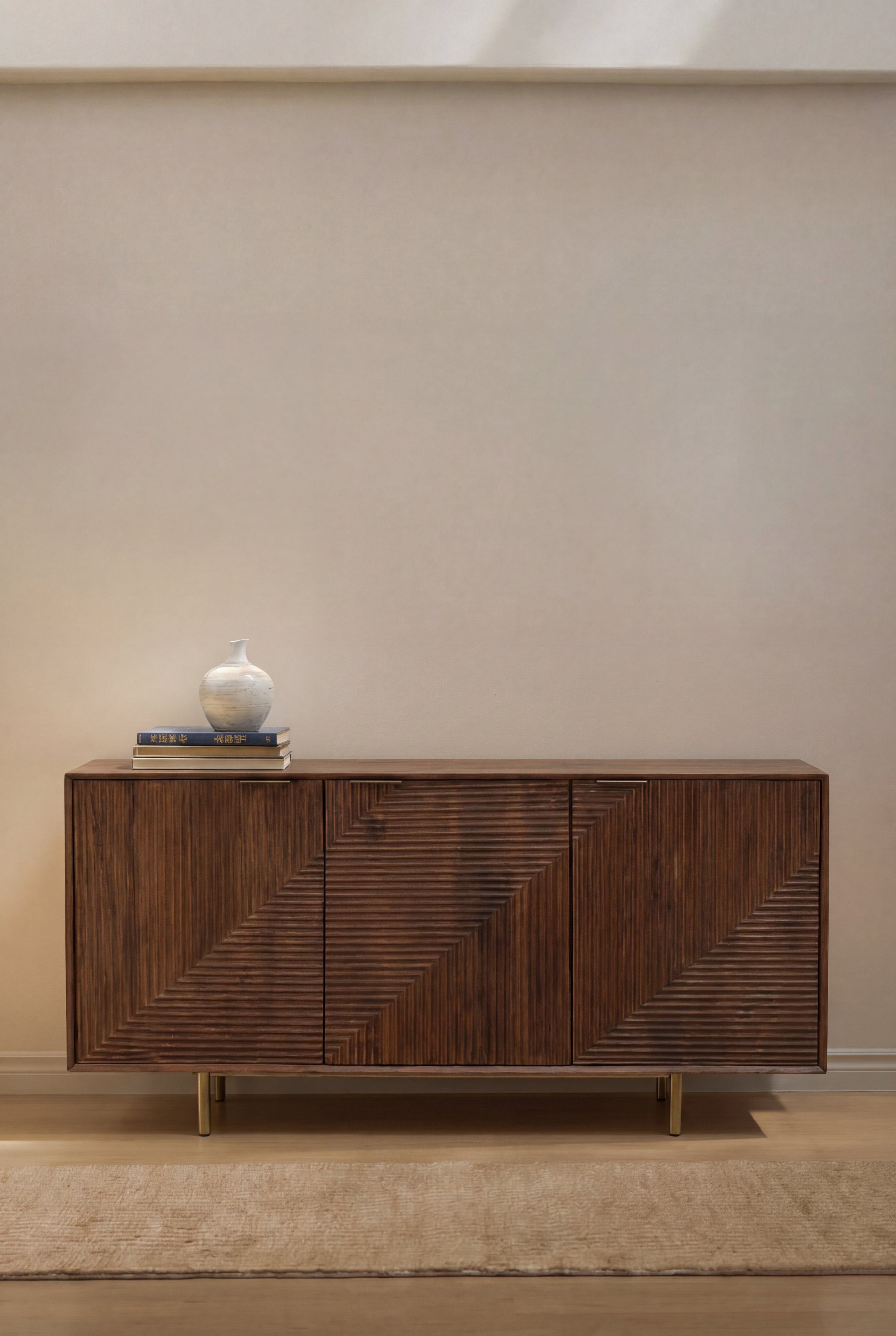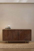 Crafted in a deep walnut tone, this sideboard showcases sculpted geometric panel detailing that adds architectural depth and refined texture to your space. The rich dark brown finish highlights natural wood grain patterns, while the slim brass legs introduce a subtle contrast of warmth and sophistication. Designed to elevate your living or dining interior, it offers concealed storage within a bold structured silhouette, allowing you to style your home with modern French elegance and timeless character.