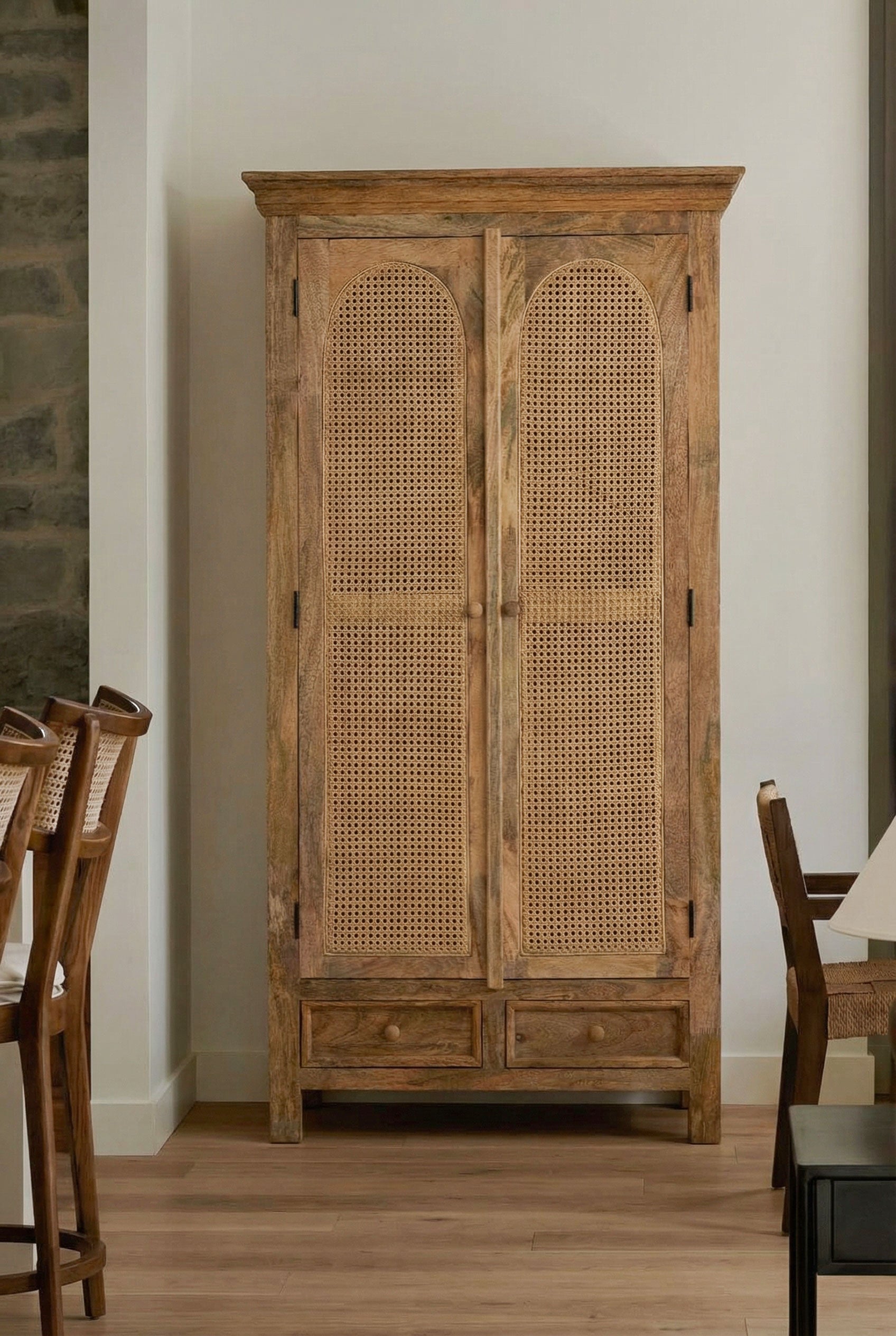 Gracefully blending natural warmth with artisanal detail, this cabinet is crafted from solid mango wood and finished with woven cane panels that introduce texture and softness to its tall, elegant form. The gently arched door detailing adds a refined architectural touch, while the spacious interior offers ample room for organized storage. Two lower drawers provide additional concealed space for everyday essentials, keeping your interior calm and uncluttered. Rich grain variation ensures each piece feels unique, making it a timeless addition to bohemian, modern natural, or relaxed contemporary interiors.