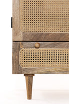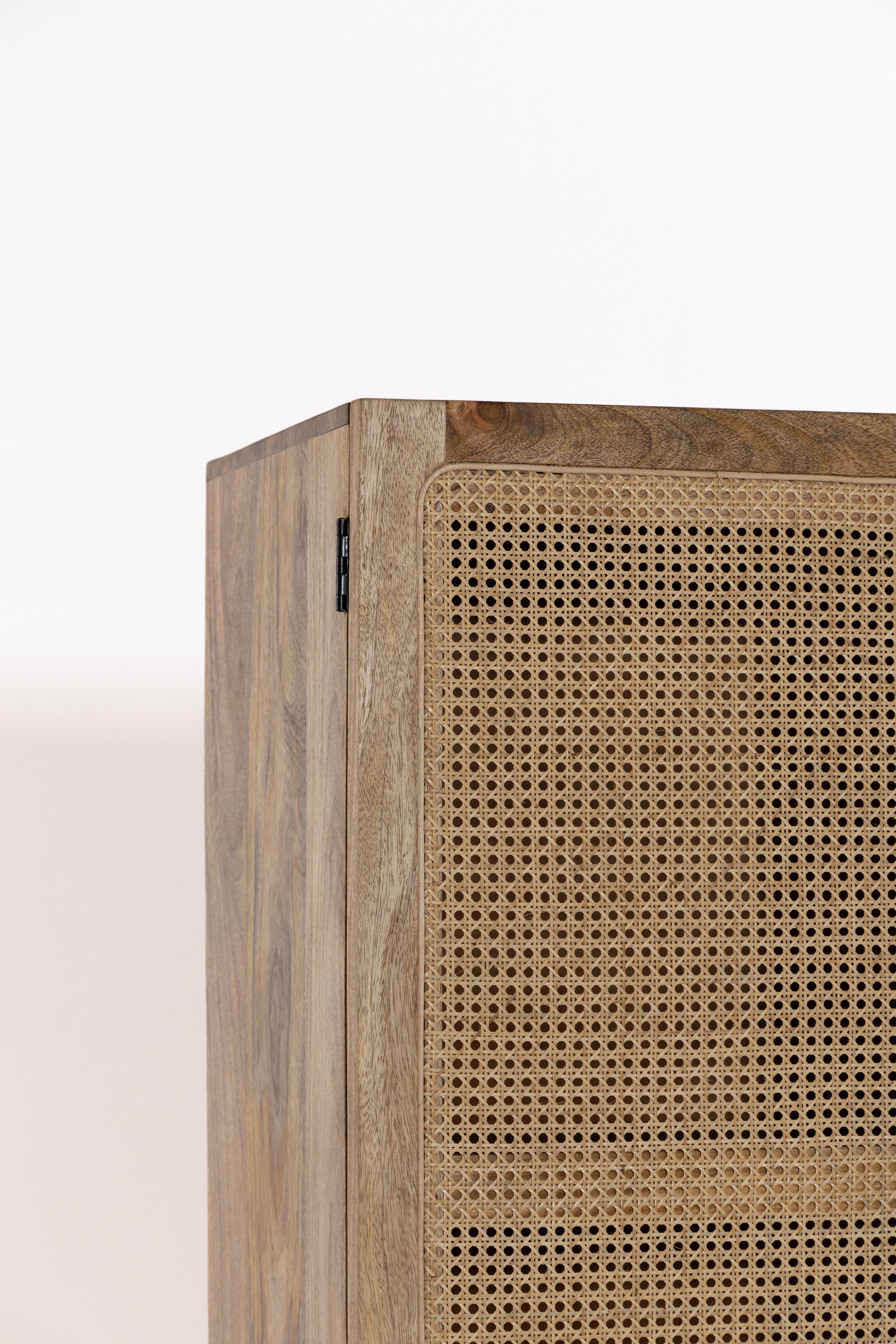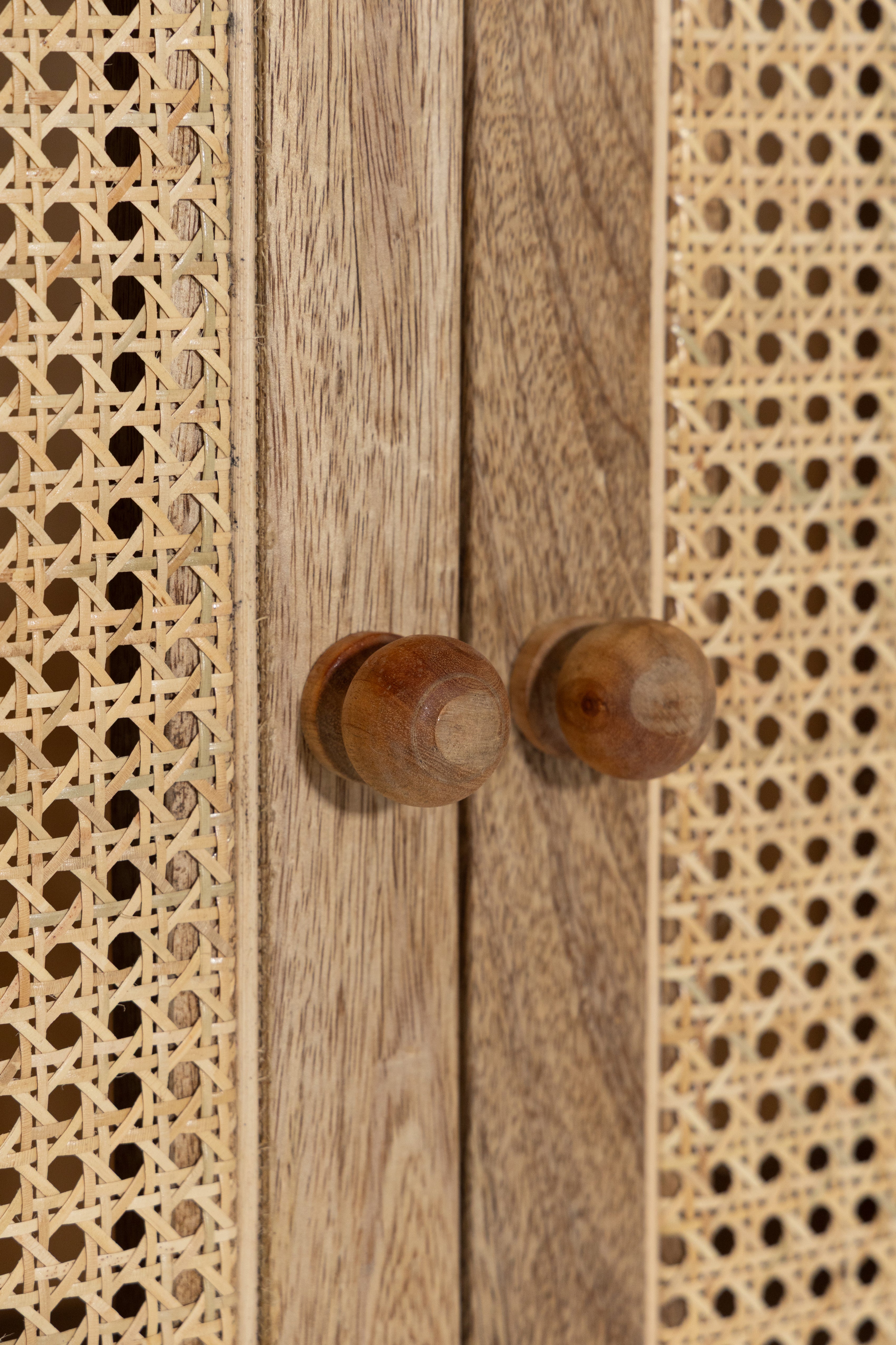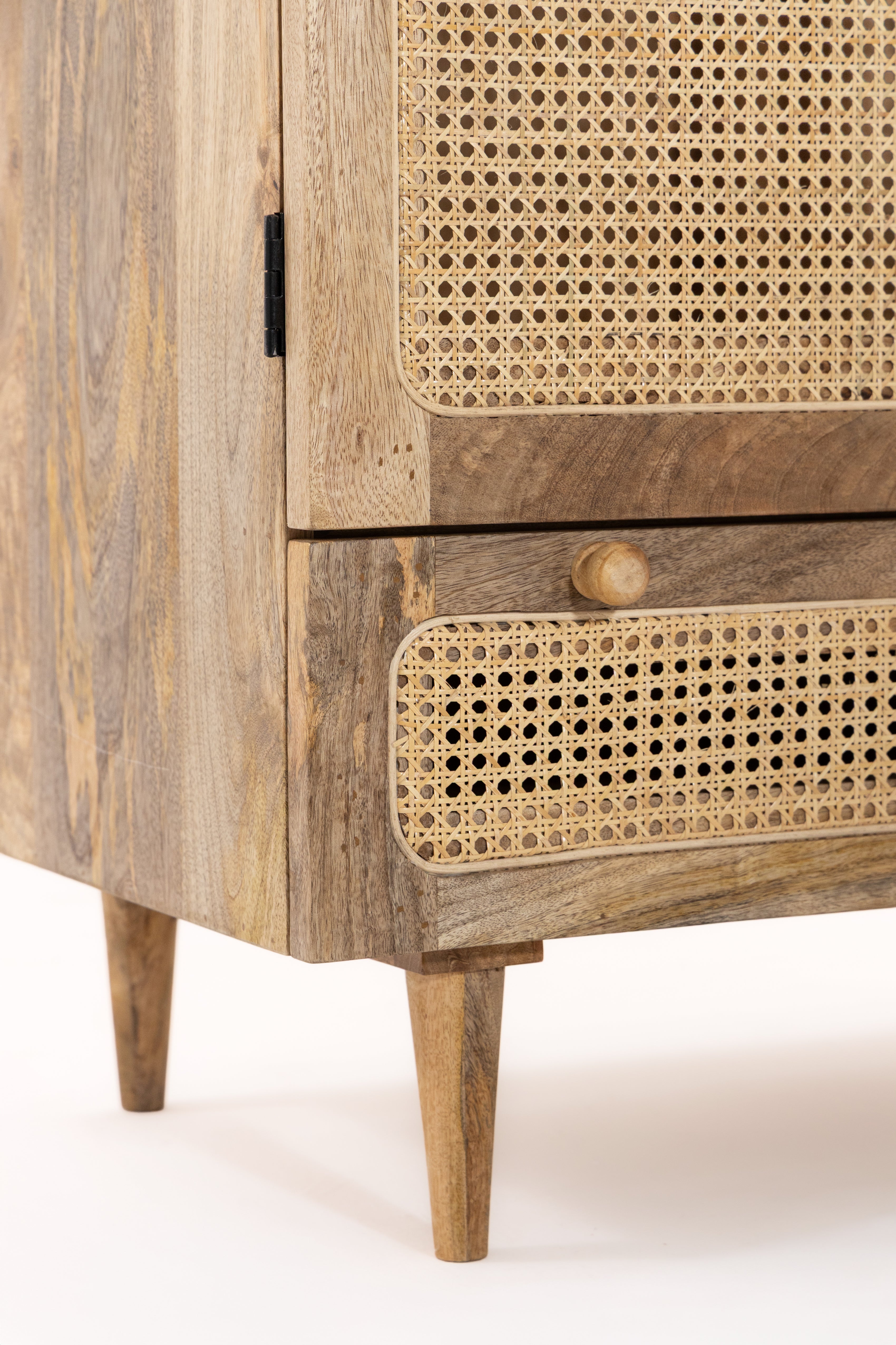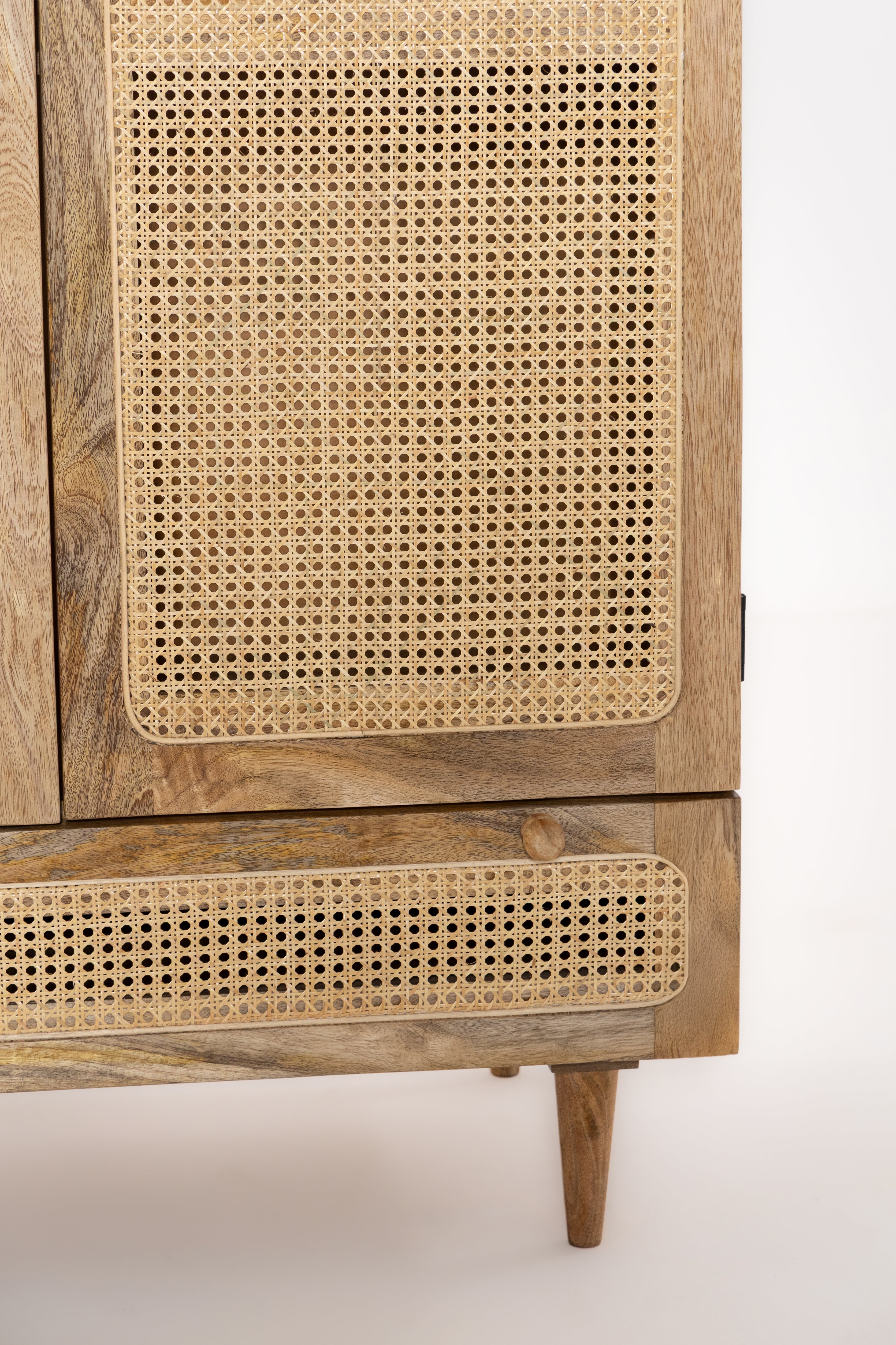Crafted with high-quality mango wood, this cabinet features two rattan doors that add a touch of natural elegance to any room. Inside, you'll find three spacious shelves to display and organize your belongings, along with a convenient rattan drawer at the bottom for additional storage. The durable construction ensures longevity, while the sleek design adds a contemporary charm to any room.