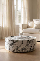 Showcasing a captivating blend of modern design and luxurious stone aesthetics, this coffee table features a perfectly rounded silhouette that serves as a bold yet refined centerpiece for contemporary interiors. Crafted from durable FRC (Fiber Reinforced Concrete), it is finished in a striking Viola Calacatta effect, highlighting dramatic plum, charcoal, and soft grey veining against a crisp white base for a truly artistic presence. The smooth surface and sculptural form create rich visual depth while offering a sturdy platform for decorative accents, books, or serving trays. With its timeless color palette and statement-making appeal, this piece enhances living spaces with sophistication, durability, and a touch of classic allure.
