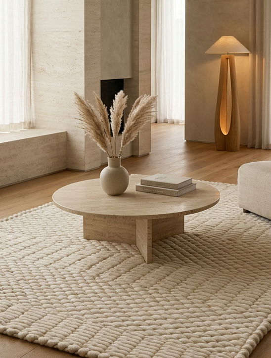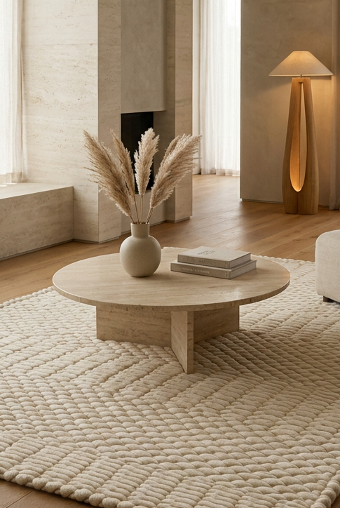 Soft natural warmth meets modern sculptural elegance in a piece that brings quiet refinement to any living space. The smooth travertine surface offers gentle tonal movement that feels organic and luxurious, creating an inviting focal point with effortless style. A round top rests on a grounded architectural base that adds subtle character while maintaining a serene minimal presence. Designed to elevate both contemporary and timeless interiors, this statement piece enriches the room with calm beauty and a naturally sophisticated charm.
