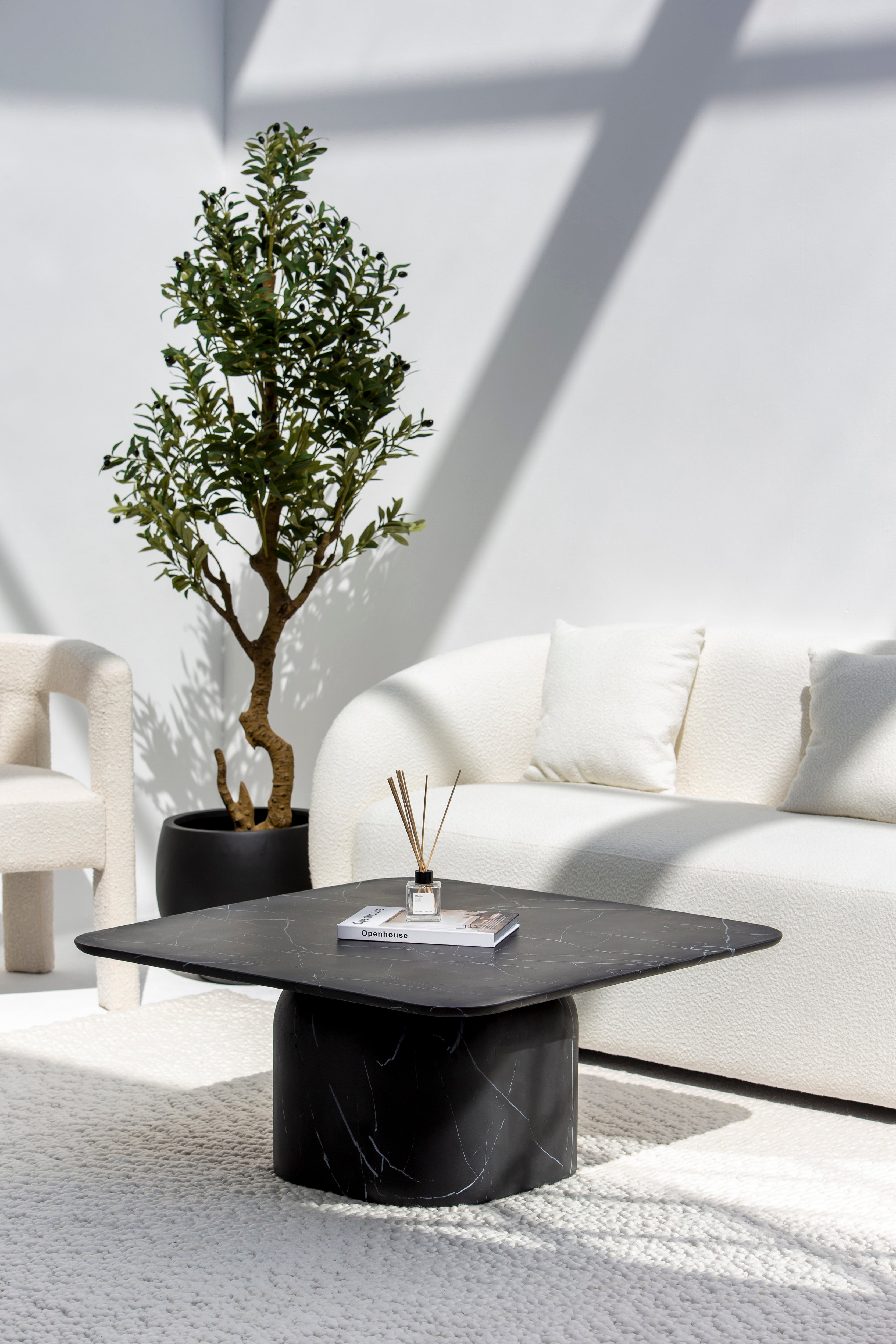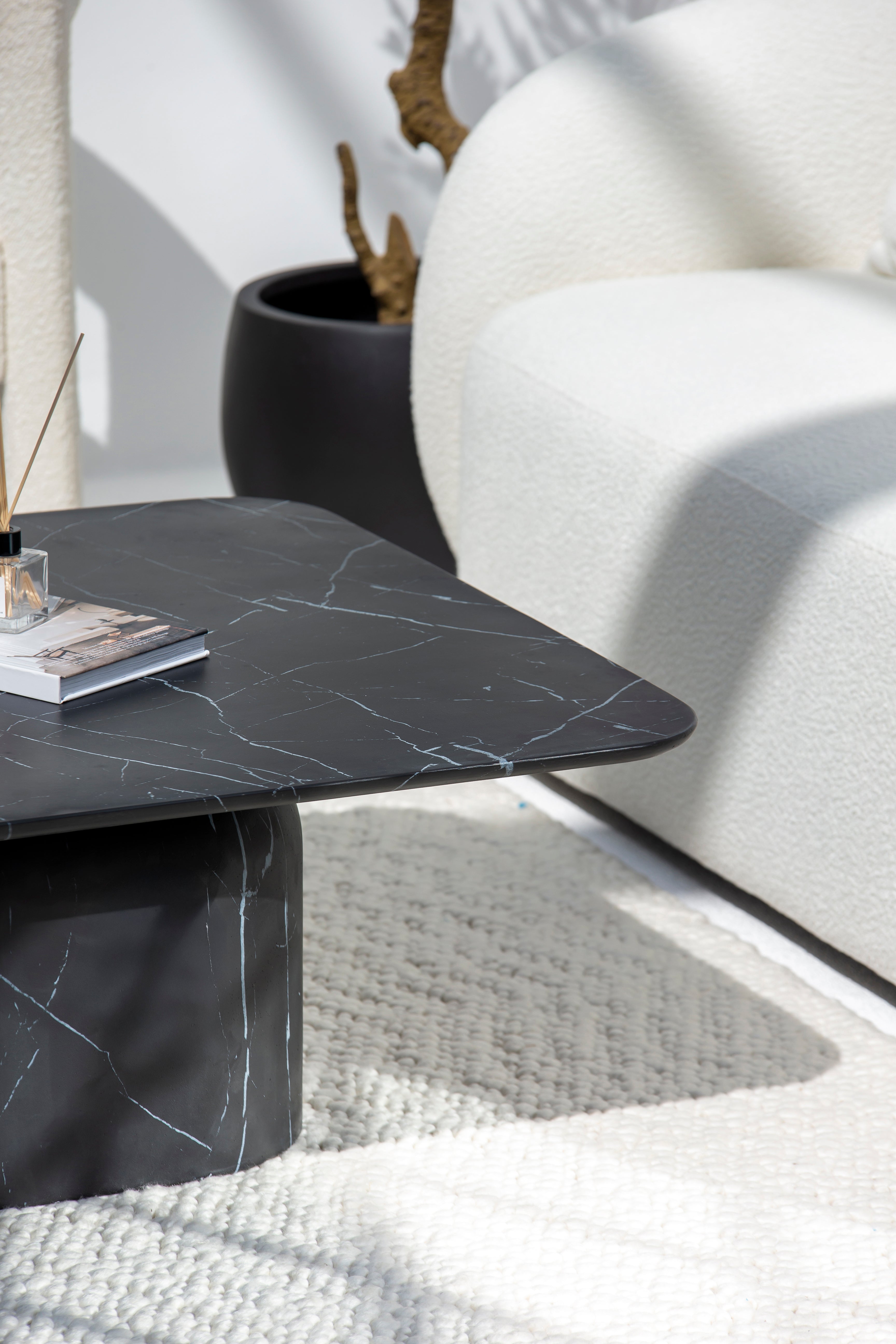 The Astra Marble-Finish Concrete Coffee Table blends sophistication with timeless appeal. Its sleek square top, adorned with a realistic black marble finish featuring intricate white veining, brings an air of opulence to any room. Crafted from GRC (Glassfiber Reinforced Concrete), this table marries durability with an elegant design, making it a standout centerpiece for modern or minimalist interiors. The sturdy cylindrical base enhances its architectural appeal, offering both form and function.