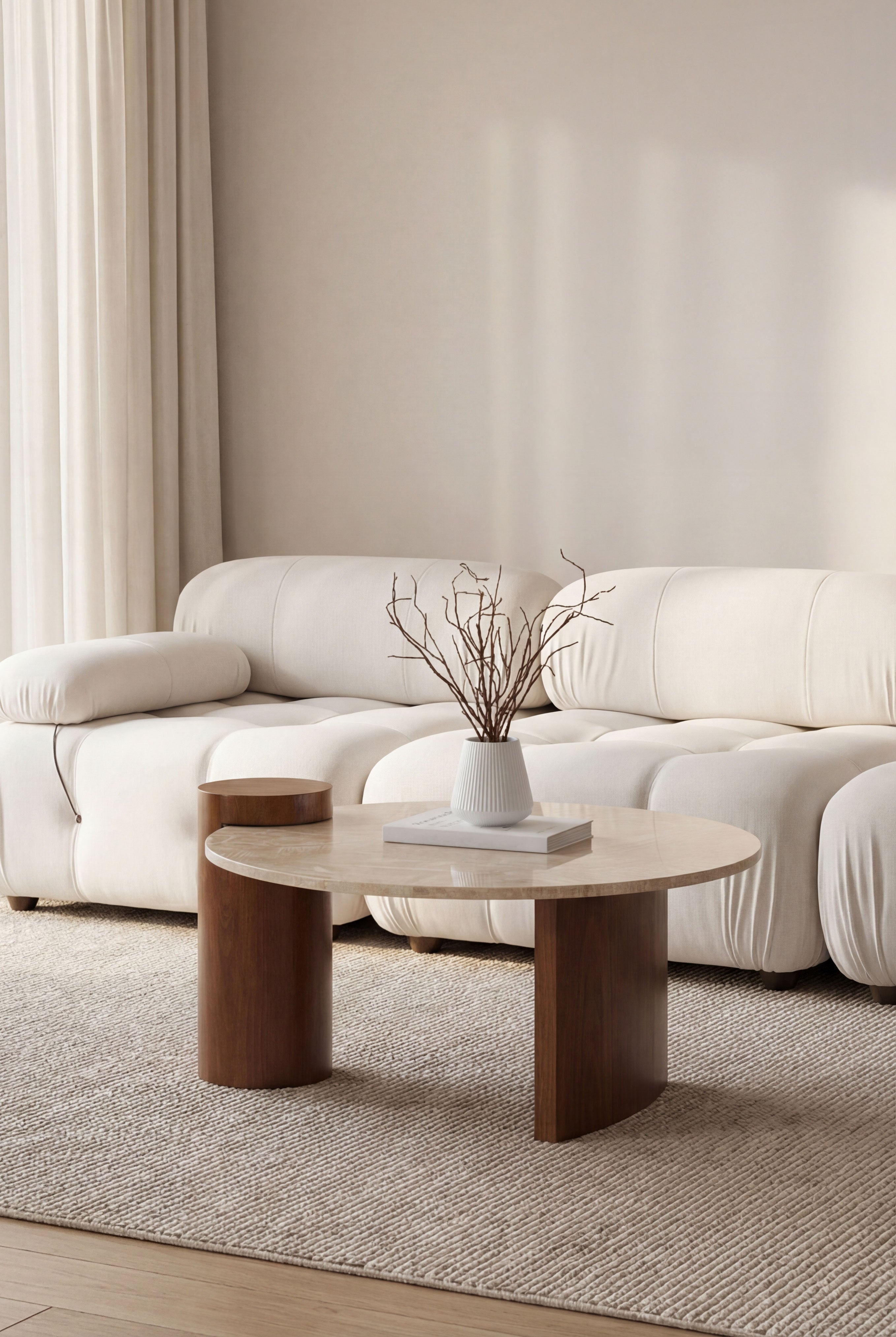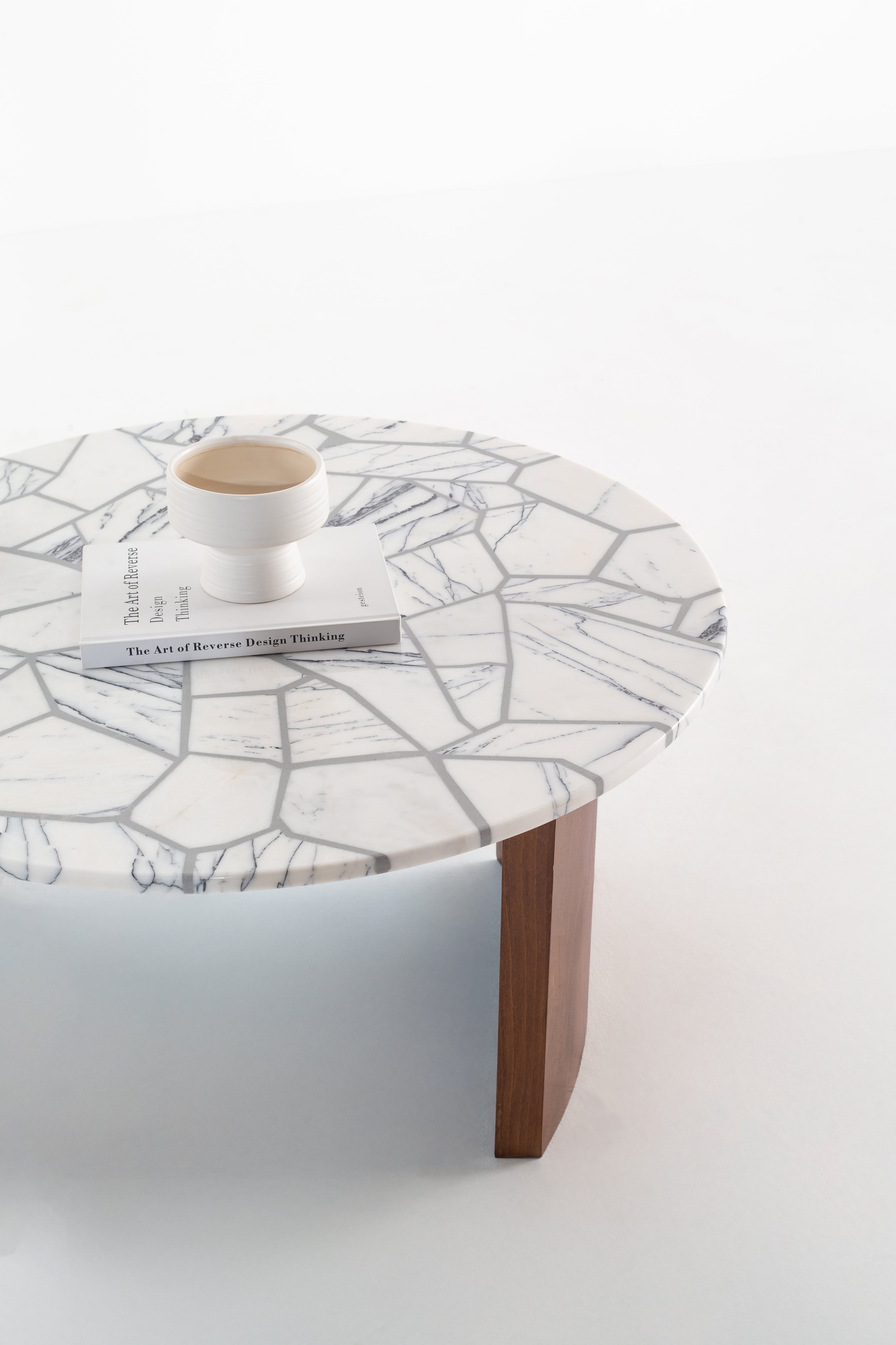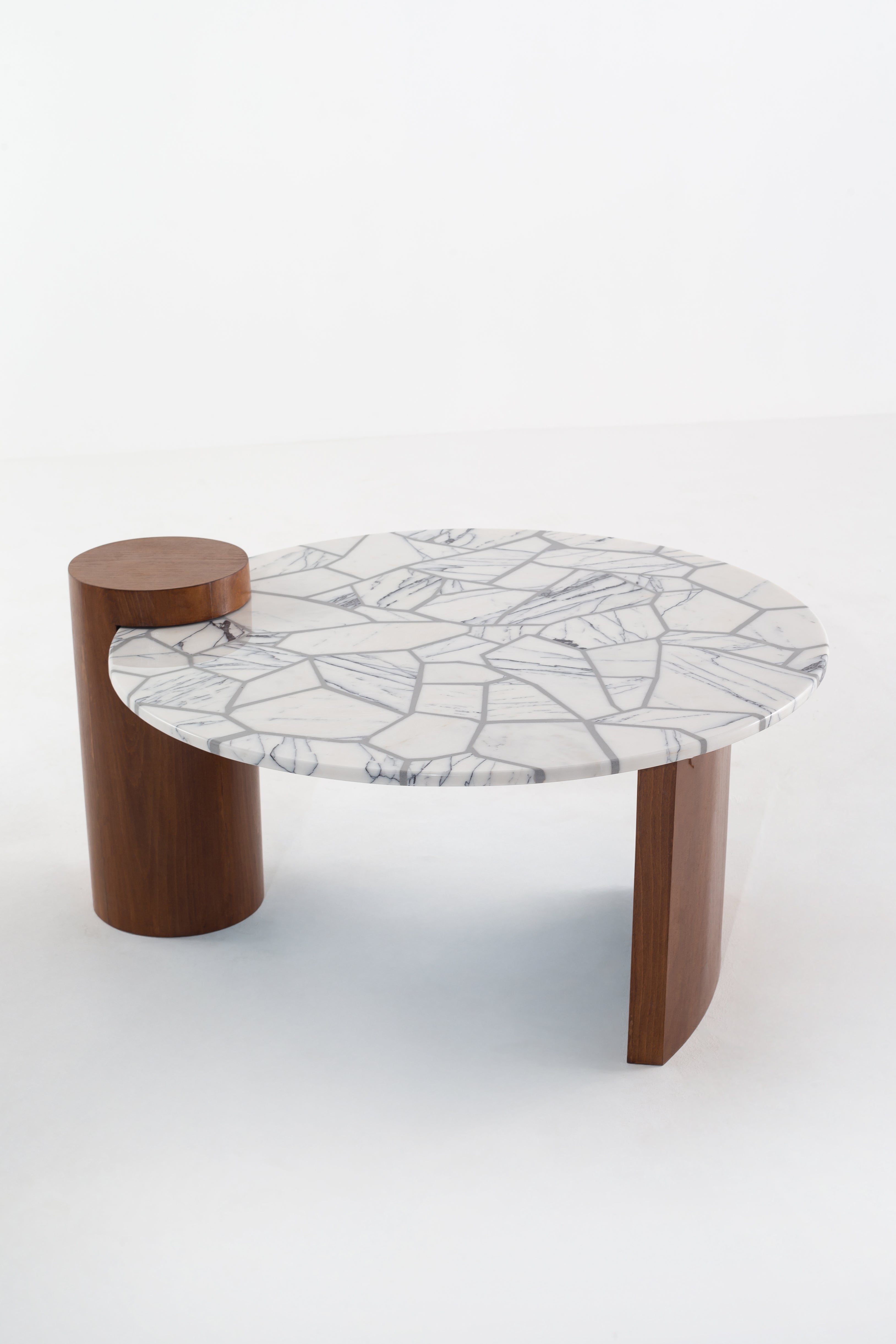 A round stone top features a lilac grey mosaic pattern that brings subtle movement and visual depth. The puzzle-style wooden base adds warmth and architectural contrast. Soft tonal shifts create a calm, composed surface. Balanced proportions give the design a grounded yet fluid presence. A distinctive centrepiece shaped for modern living spaces.