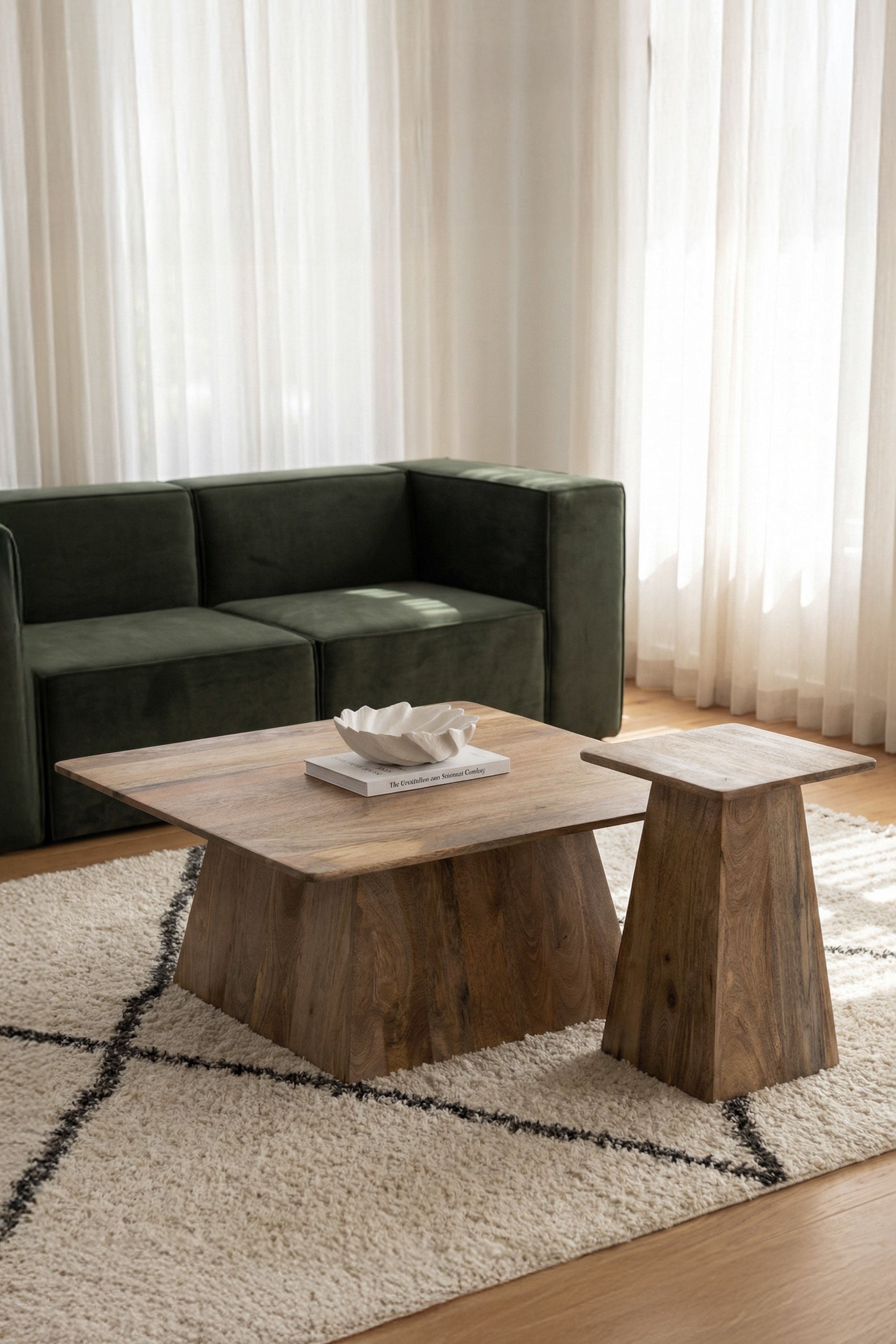 Designed as a versatile centerpiece for modern living, this center coffee table is crafted from solid mango wood and defined by a bold, sculptural form that brings warmth and presence to your space. The expansive tabletop rests on a strong pedestal base, showcasing natural grain variation that makes each piece feel unique and grounded. Balanced and substantial yet visually clean, it works effortlessly as both a coffee table and a central anchor for seating areas. Thoughtfully made for everyday use, it adds timeless character and refined simplicity to interiors that value natural materials and functional design.
