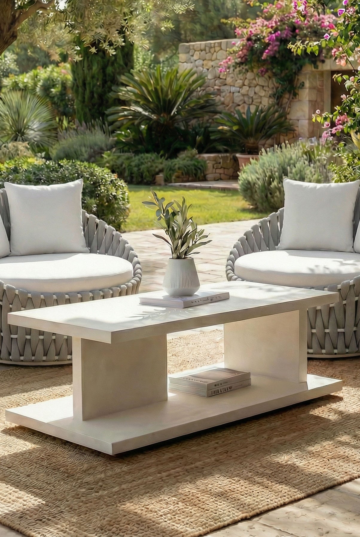 A statement of refined minimalism, this rectangular coffee table in smooth microconcrete blends modern design with organic texture. The off-white finish enhances its sculptural silhouette, while the subtly textured surface adds depth and a tactile feel. A bold central support connects the wide top and base, creating an architectural presence that balances aesthetics and functionality. Whether styled with books and décor or left unadorned, this coffee table transforms your living space with understated elegance and a serene, luxury and timeless indoor appeal.