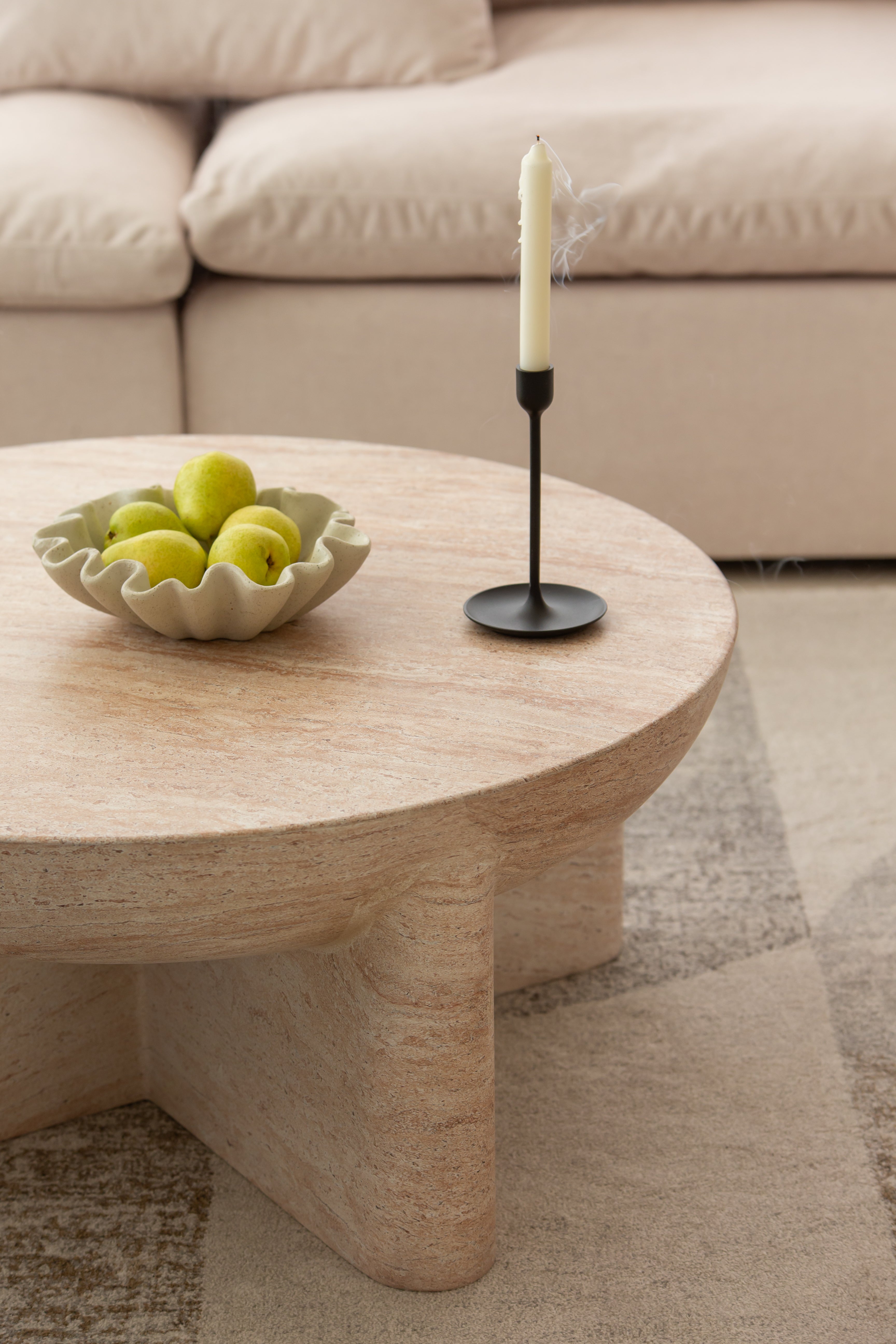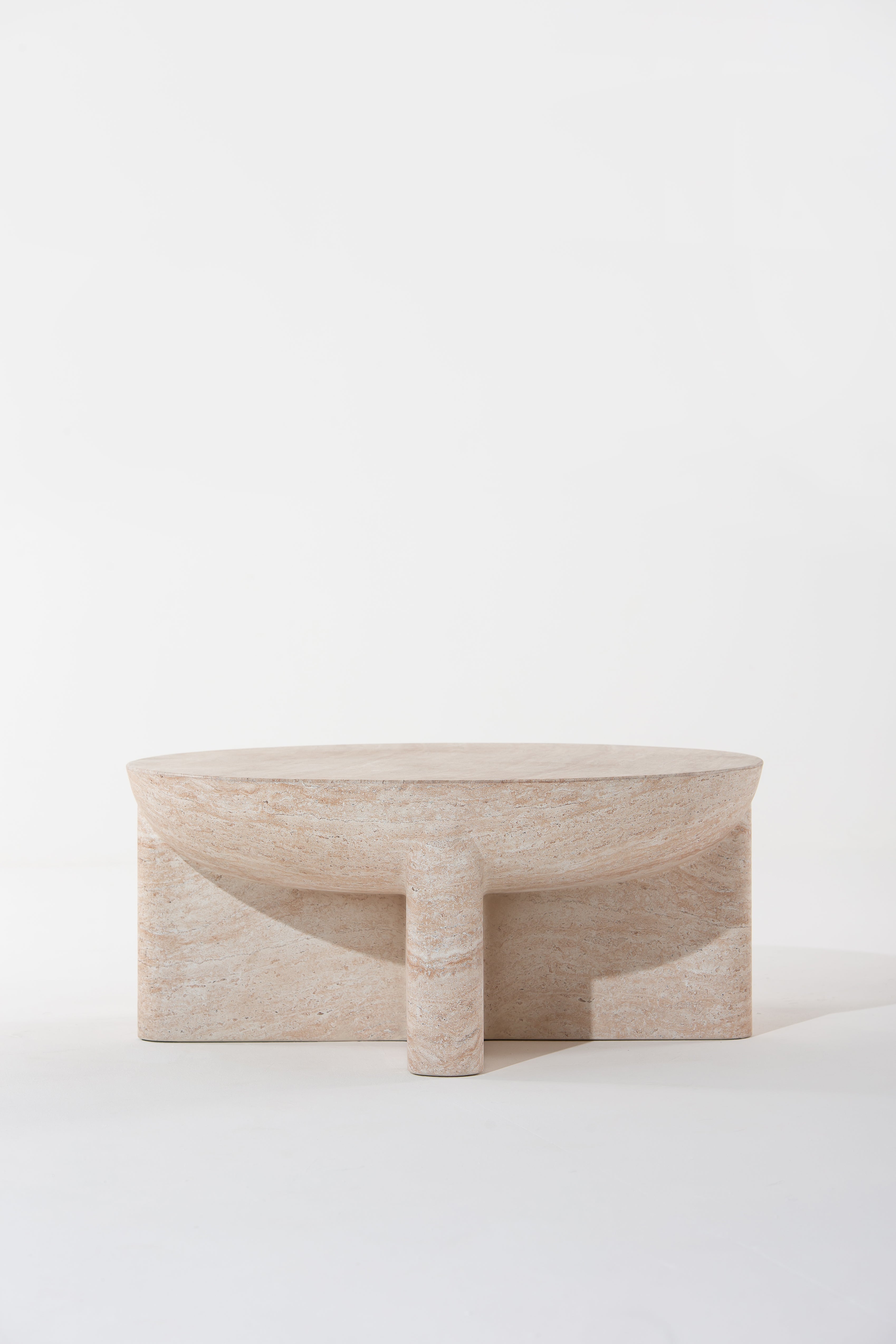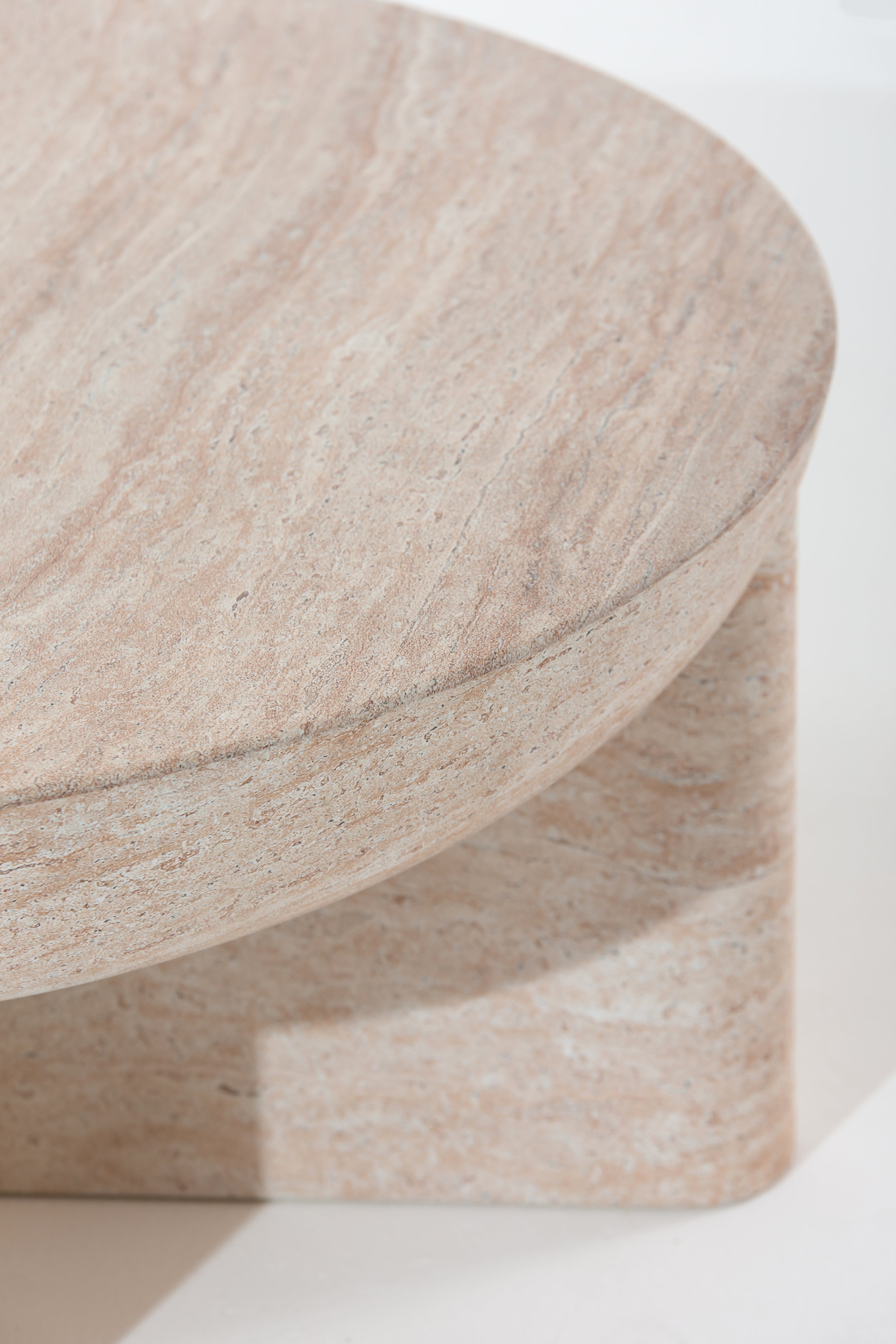 The Morrison Travertine-Finish Concrete Coffee Table seamlessly blends modern aesthetics with natural elegance. Crafted with a travertine-inspired finish, it radiates a warm, earthy beige tone that beautifully mimics genuine stone. The rounded tabletop rests gracefully on a uniquely structured base, adding a sculptural touch to any room. Its polished, smooth surface highlights subtle veining and a rich texture, making it an ideal statement piece in contemporary and minimalist spaces.