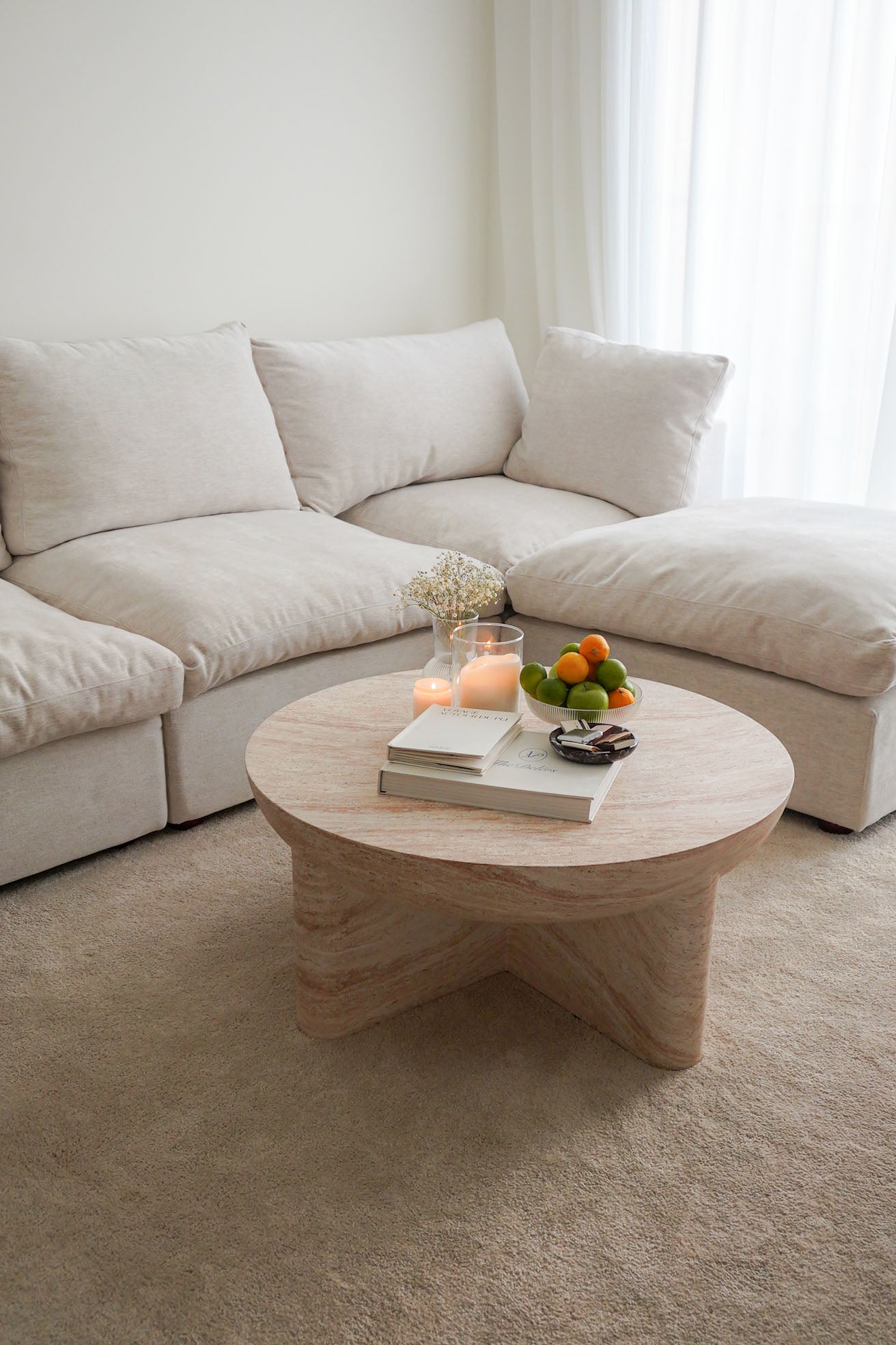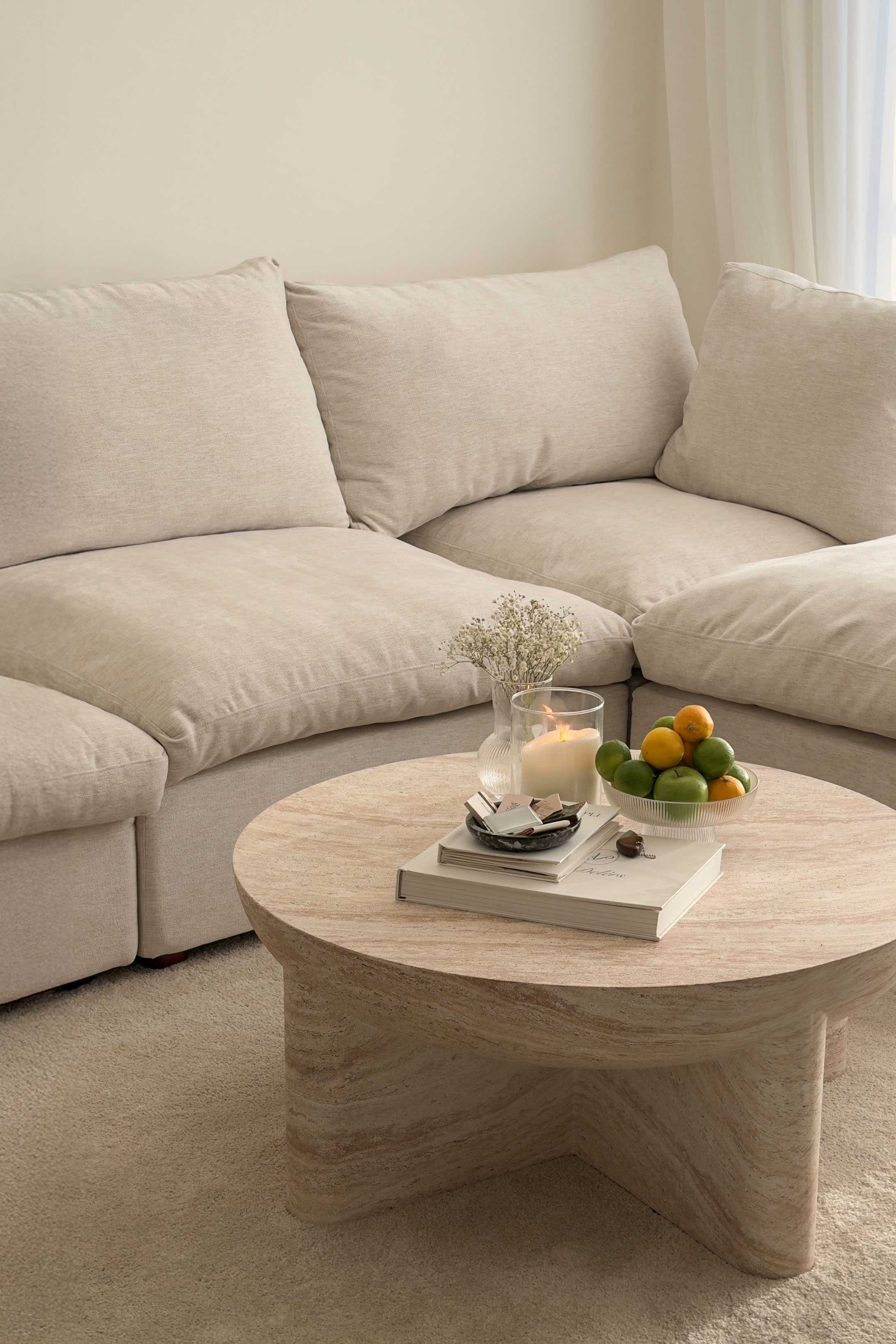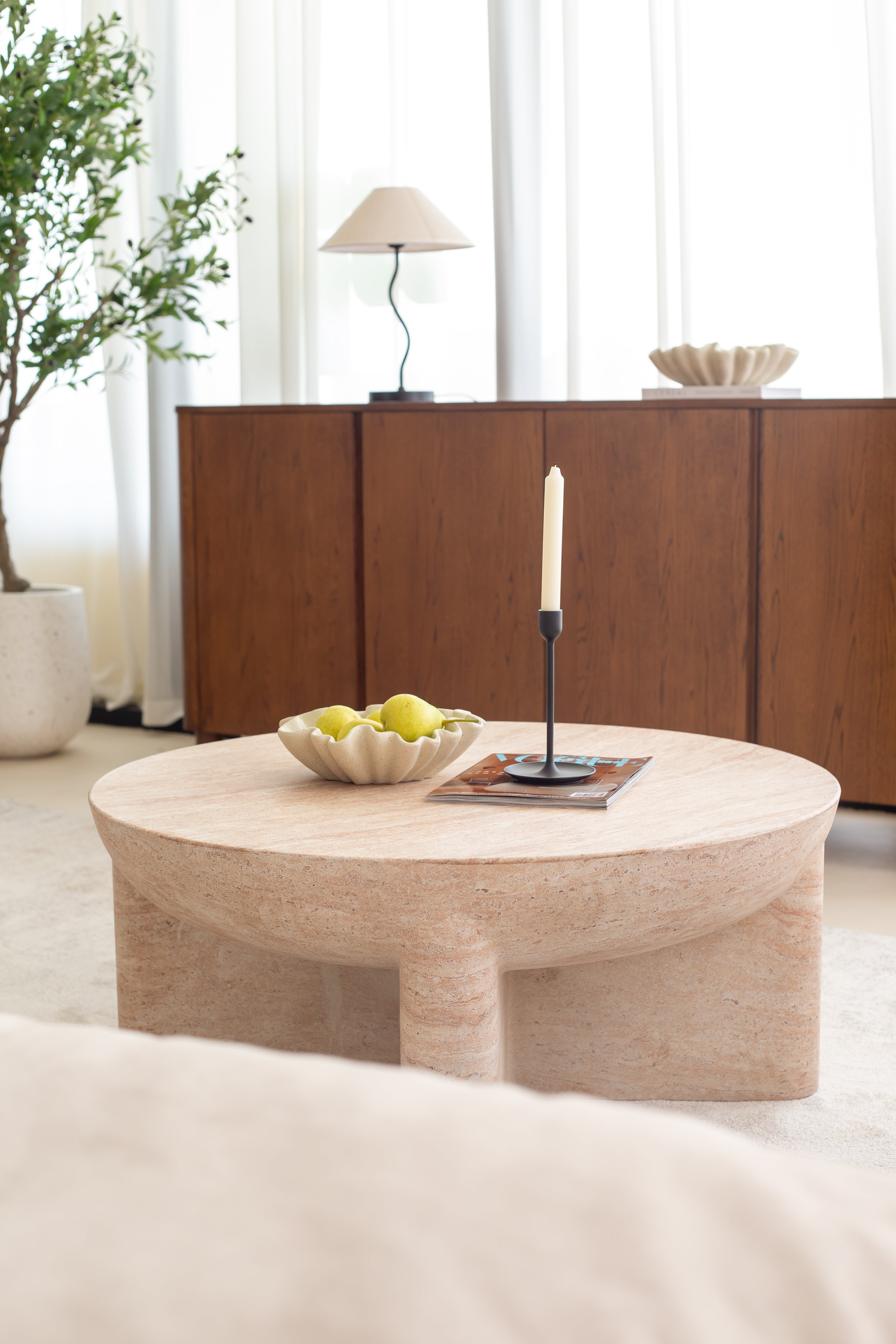The Morrison Travertine-Finish Concrete Coffee Table seamlessly blends modern aesthetics with natural elegance. Crafted with a travertine-inspired finish, it radiates a warm, earthy beige tone that beautifully mimics genuine stone. The rounded tabletop rests gracefully on a uniquely structured base, adding a sculptural touch to any room. Its polished, smooth surface highlights subtle veining and a rich texture, making it an ideal statement piece in contemporary and minimalist spaces.