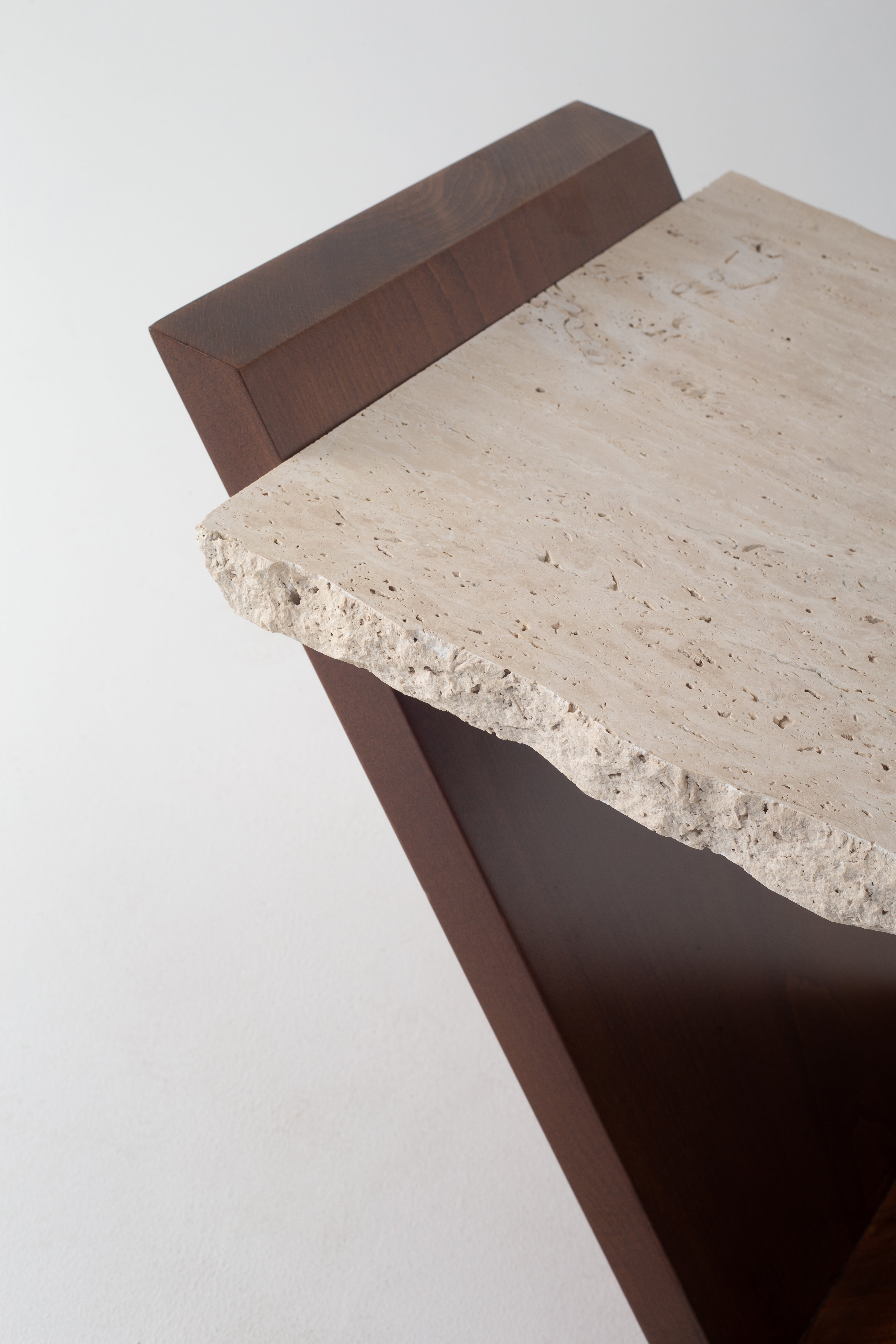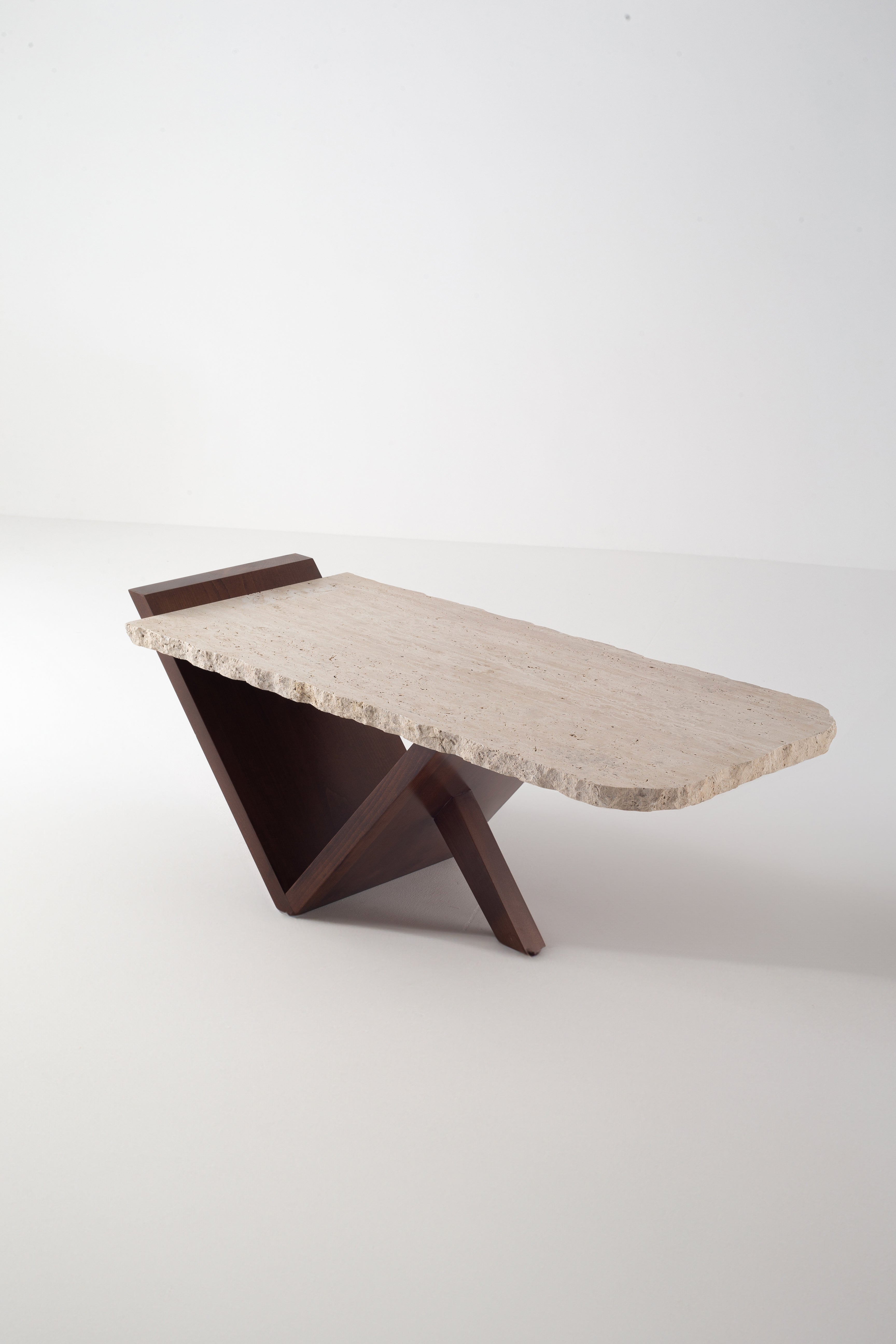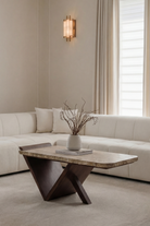 A bold statement of artistry and function, this travertine coffee table transforms your space with sculptural elegance. The raw-edge travertine top highlights natural stone’s organic beauty, while the angular walnut-finished wooden base adds striking contrast and architectural depth. Its geometric V-shaped frame offers a dynamic presence, making it more than just a table, it’s a modern design statement. Whether styled with décor or left minimal, this luxury coffee table is crafted to bring warmth, texture, and contemporary refinement to your home.