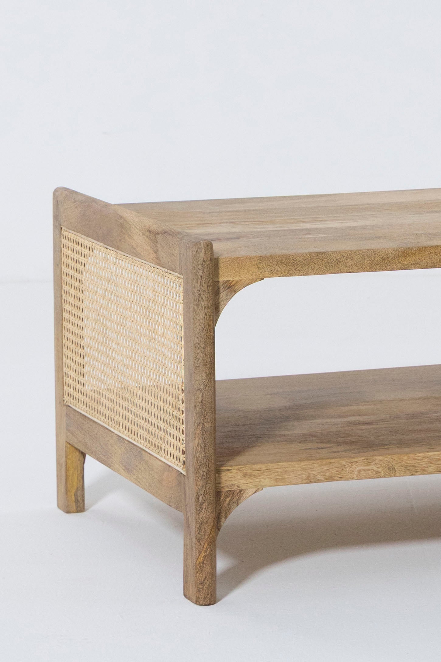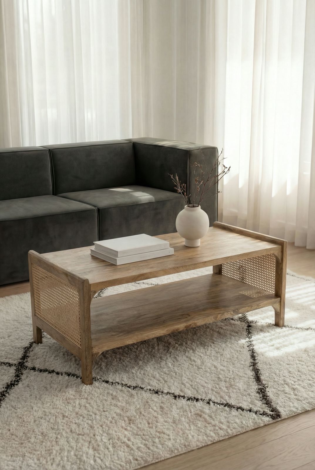 Warm natural wood and woven panels bring relaxed European charm into your living space, creating a calm and inviting focal point that grounds your seating area with texture, softness, and an effortlessly curated coastal mood.