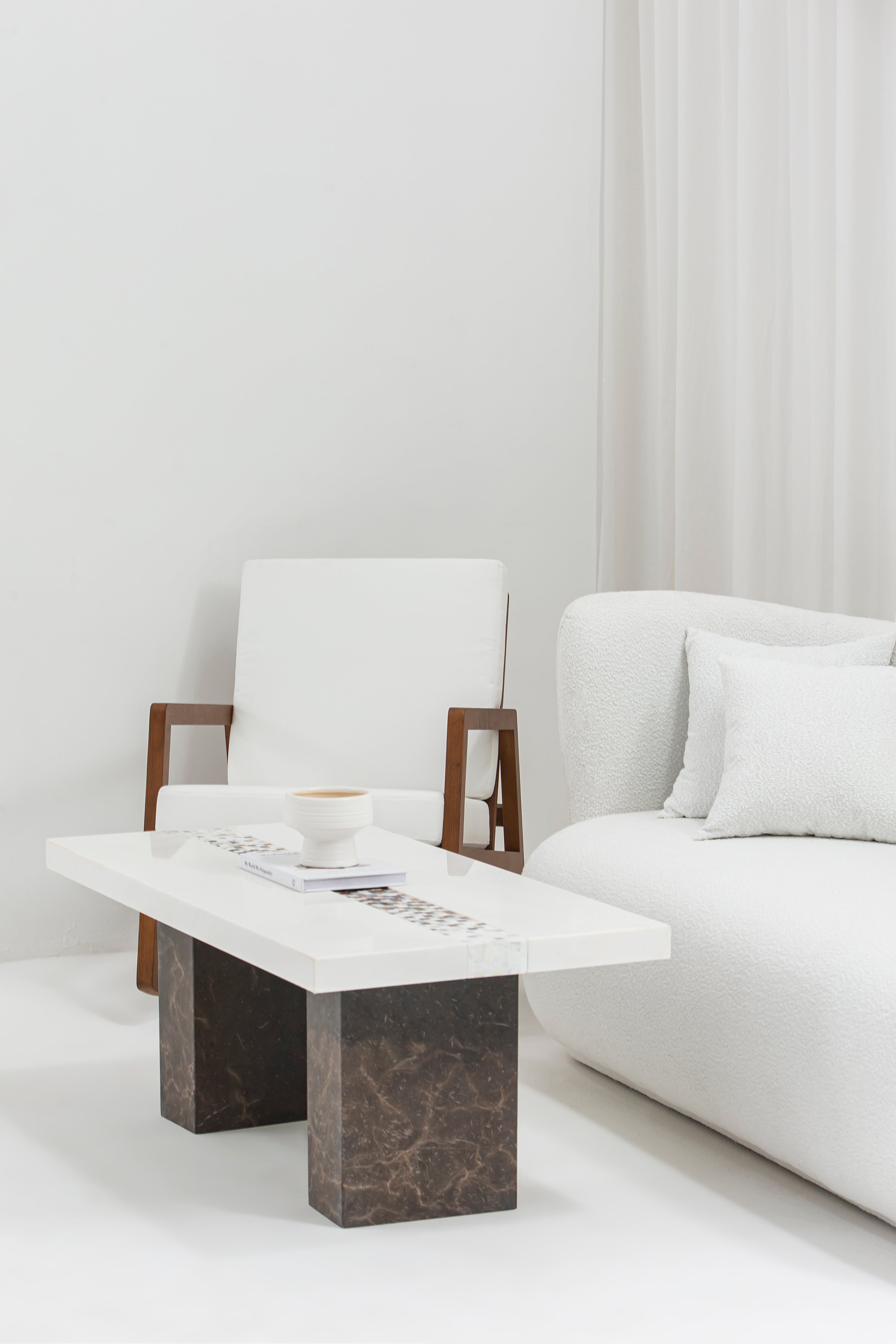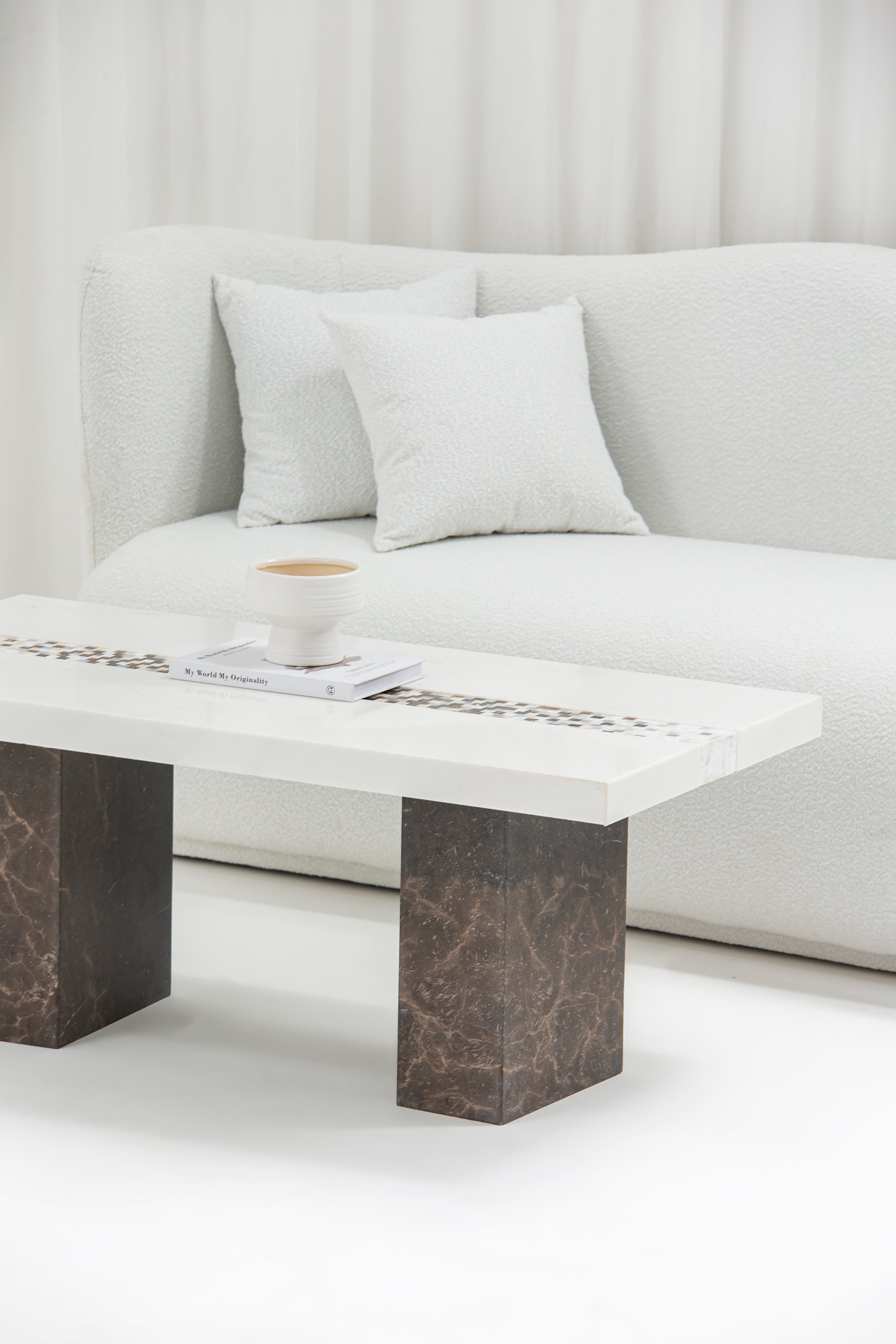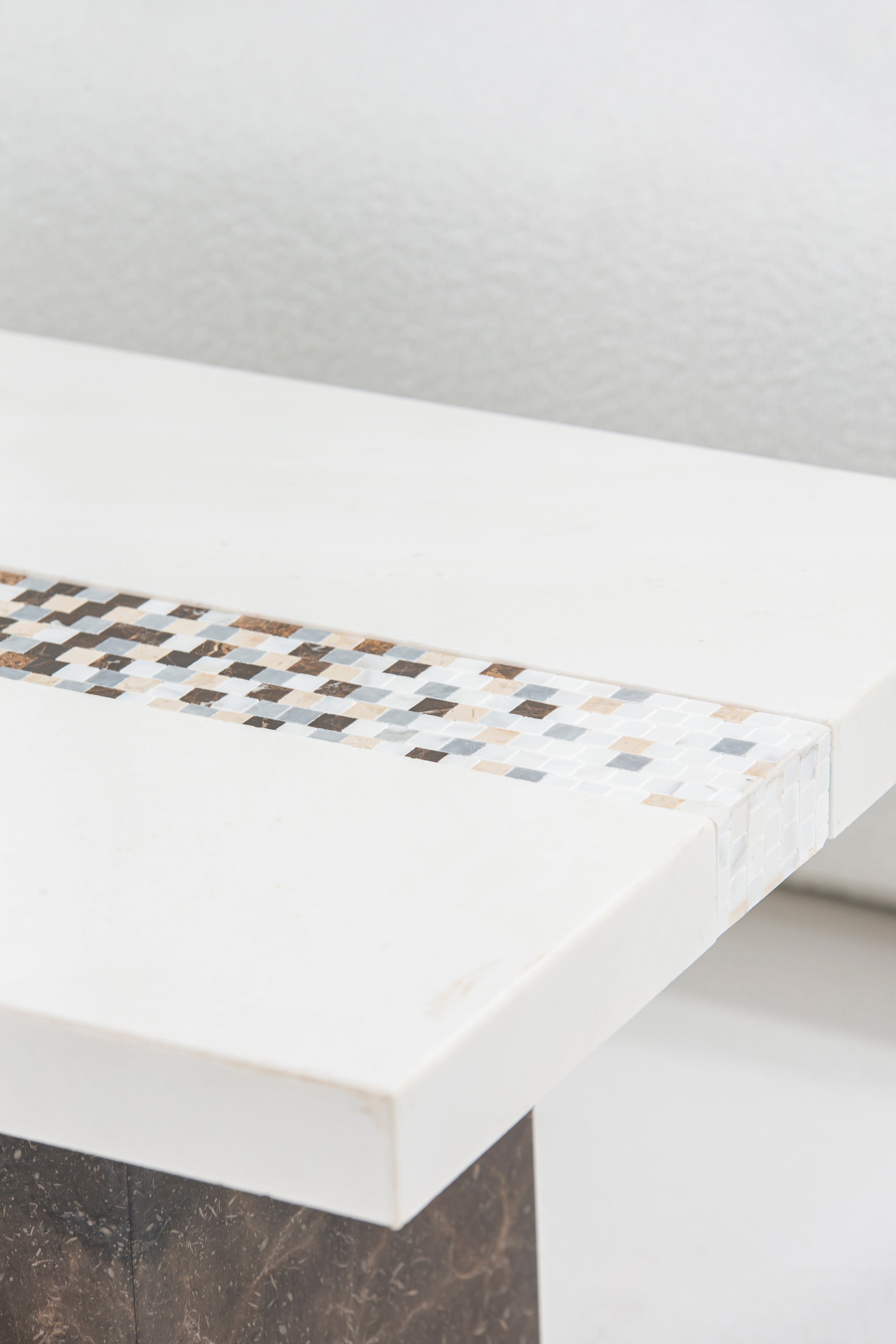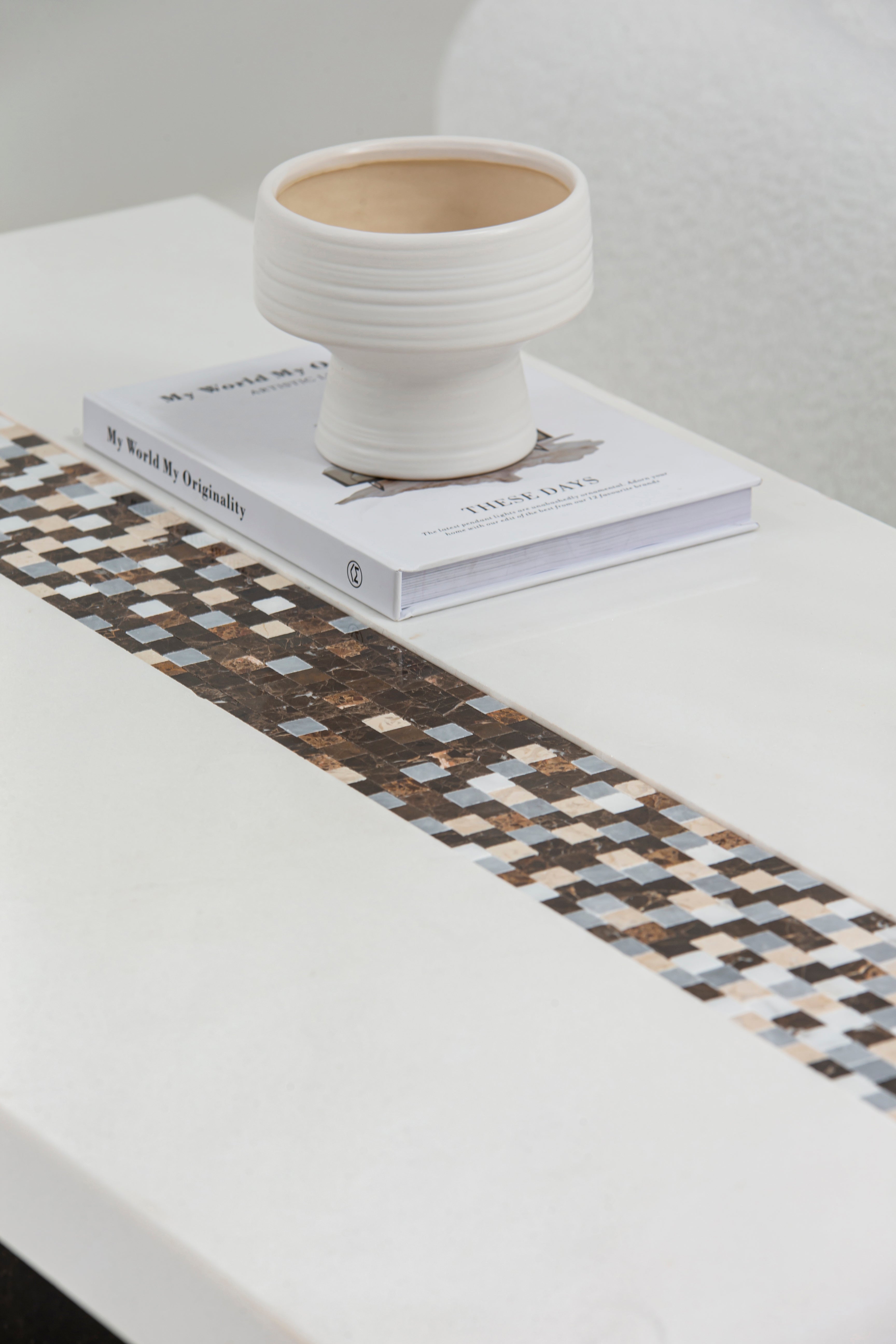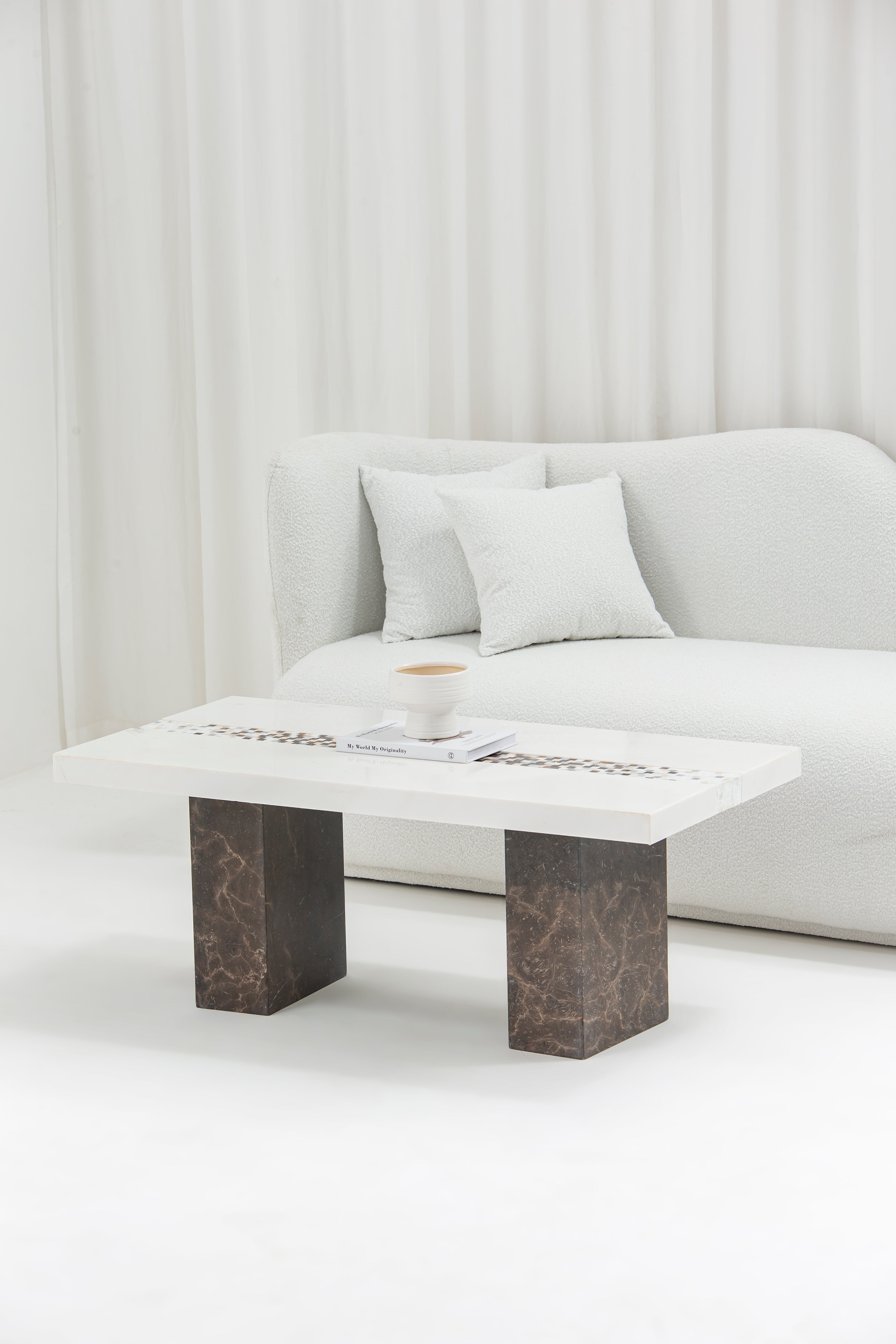 Transform your space with our handcrafted mosaic coffee tables, made from natural white marble and detailed with artisan mosaic inlay strips in Grey, Terracotta, or Beige-Brown tones. The elegant top is accented by a striking central band of fine mosaic tiles, adding texture and contrast to its smooth, polished surface. Supported by handmade Brown Pietra marble block legs, each piece blends clean lines with rich, organic materials. Whether you favor cool neutrals, warm earth tones, or classic beiges, this table becomes the focal point of any modern, Mediterranean, or minimal interior—designed for those who curate with intention.