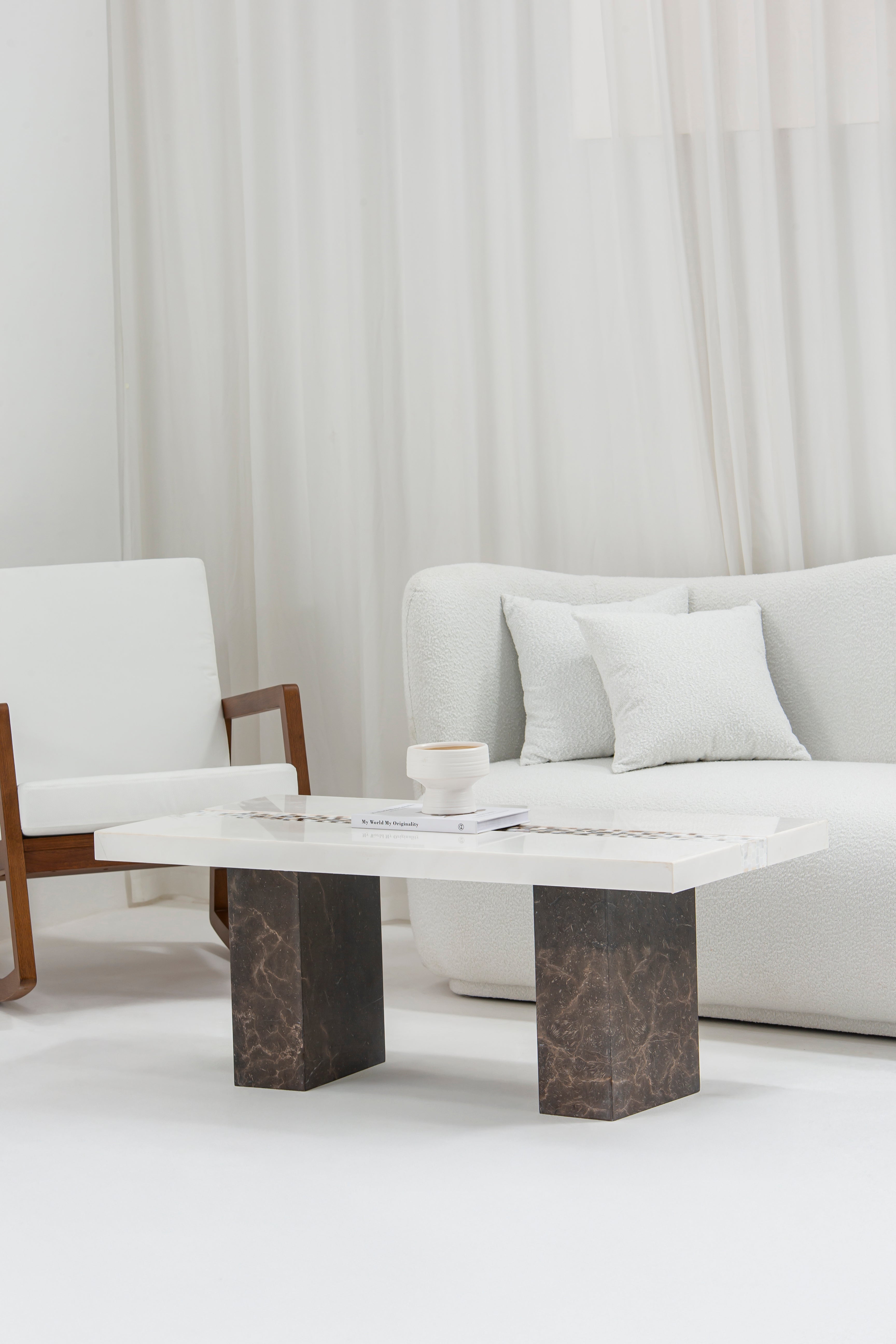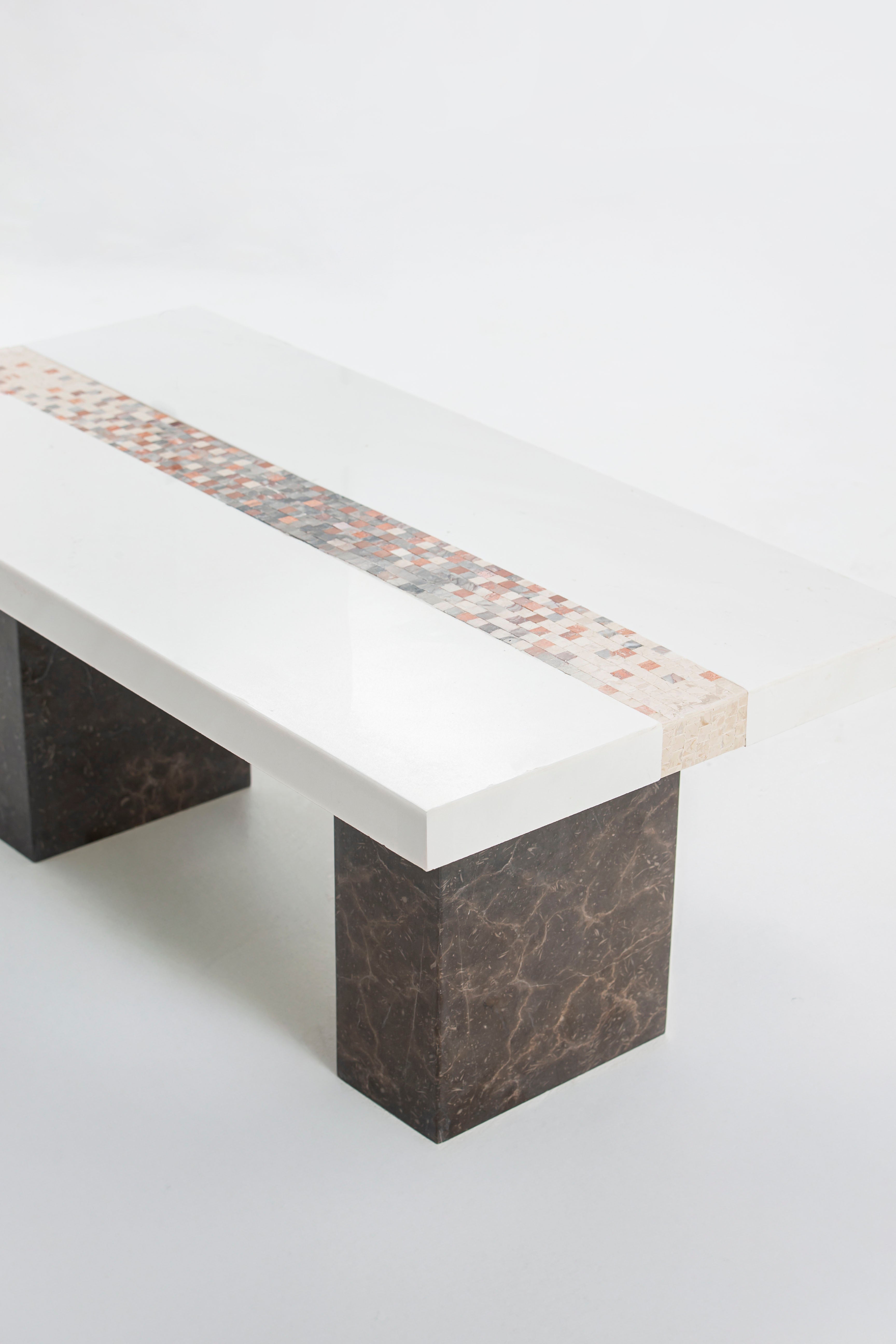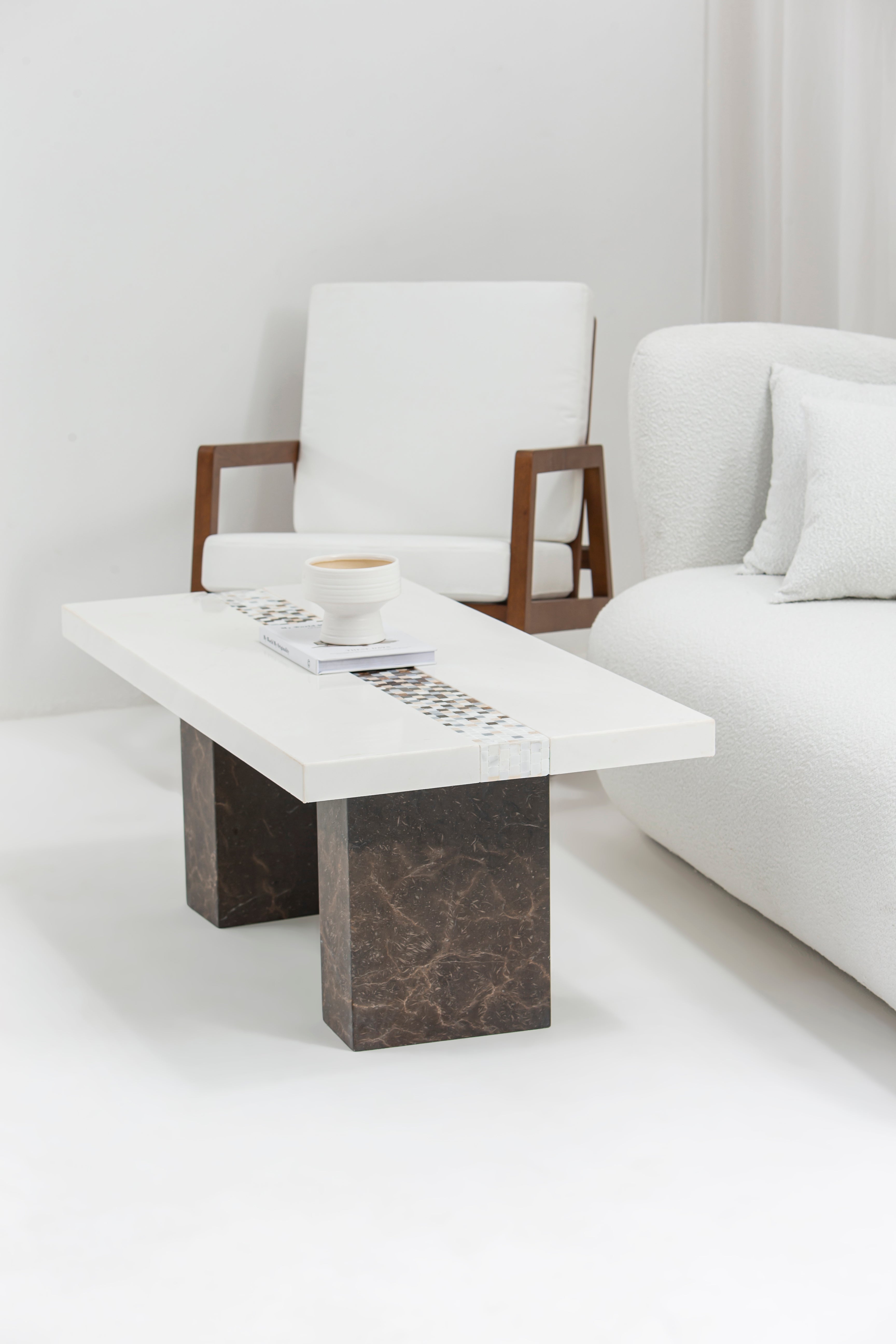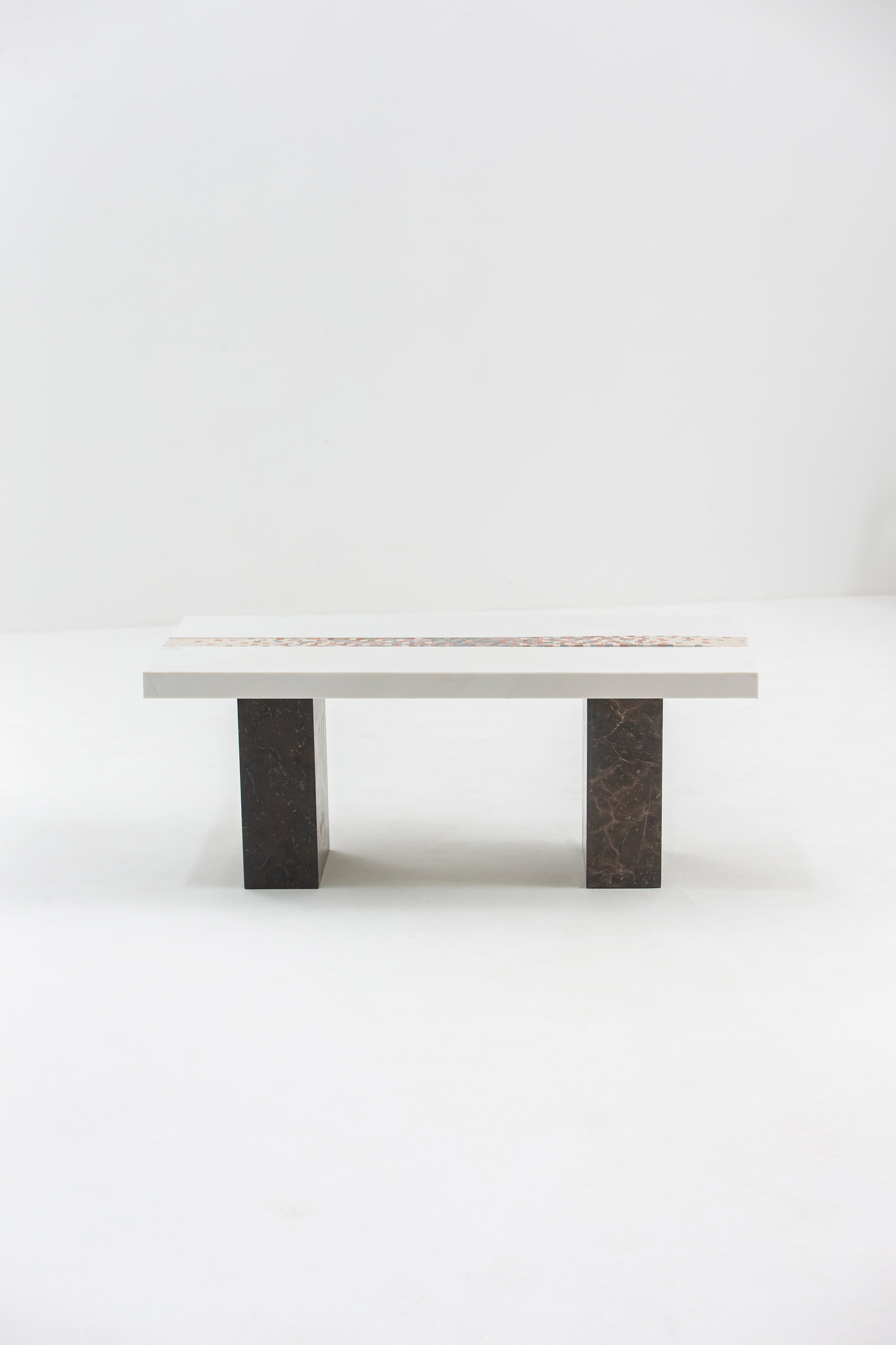 Transform your space with our handcrafted mosaic coffee tables, made from natural white marble and detailed with artisan mosaic inlay strips in Grey, Terracotta, or Beige-Brown tones. The elegant top is accented by a striking central band of fine mosaic tiles, adding texture and contrast to its smooth, polished surface. Supported by handmade Brown Pietra marble block legs, each piece blends clean lines with rich, organic materials. Whether you favor cool neutrals, warm earth tones, or classic beiges, this table becomes the focal point of any modern, Mediterranean, or minimal interior—designed for those who curate with intention.