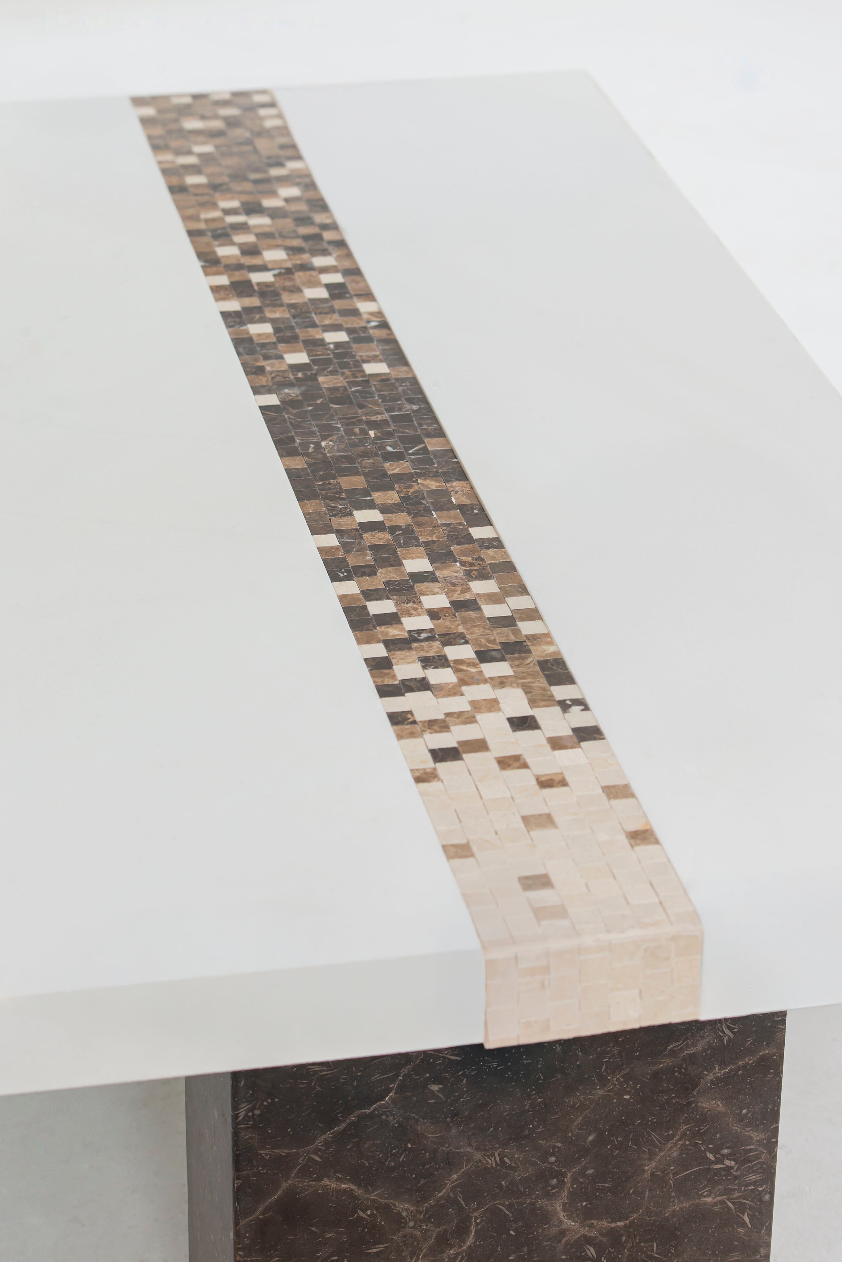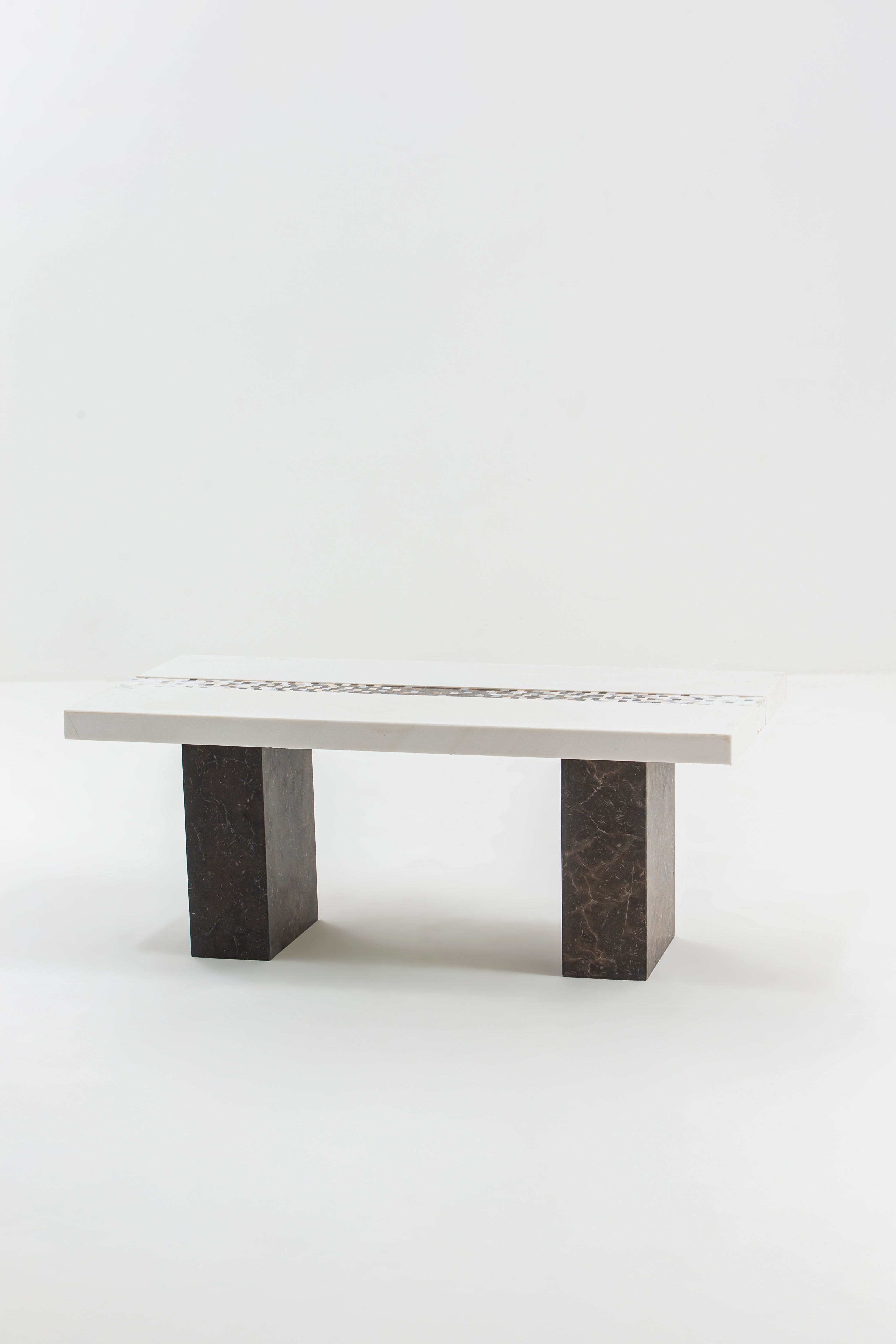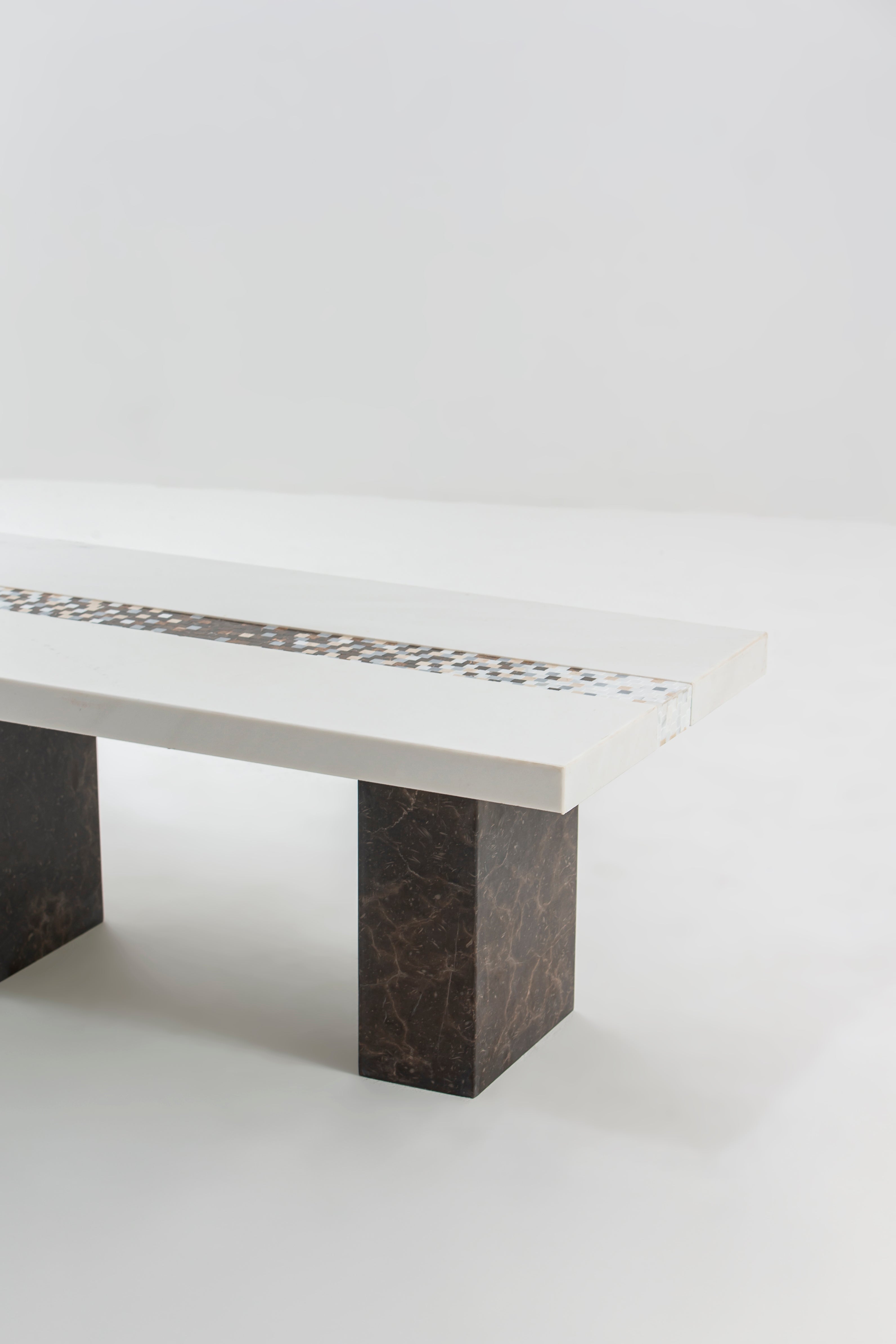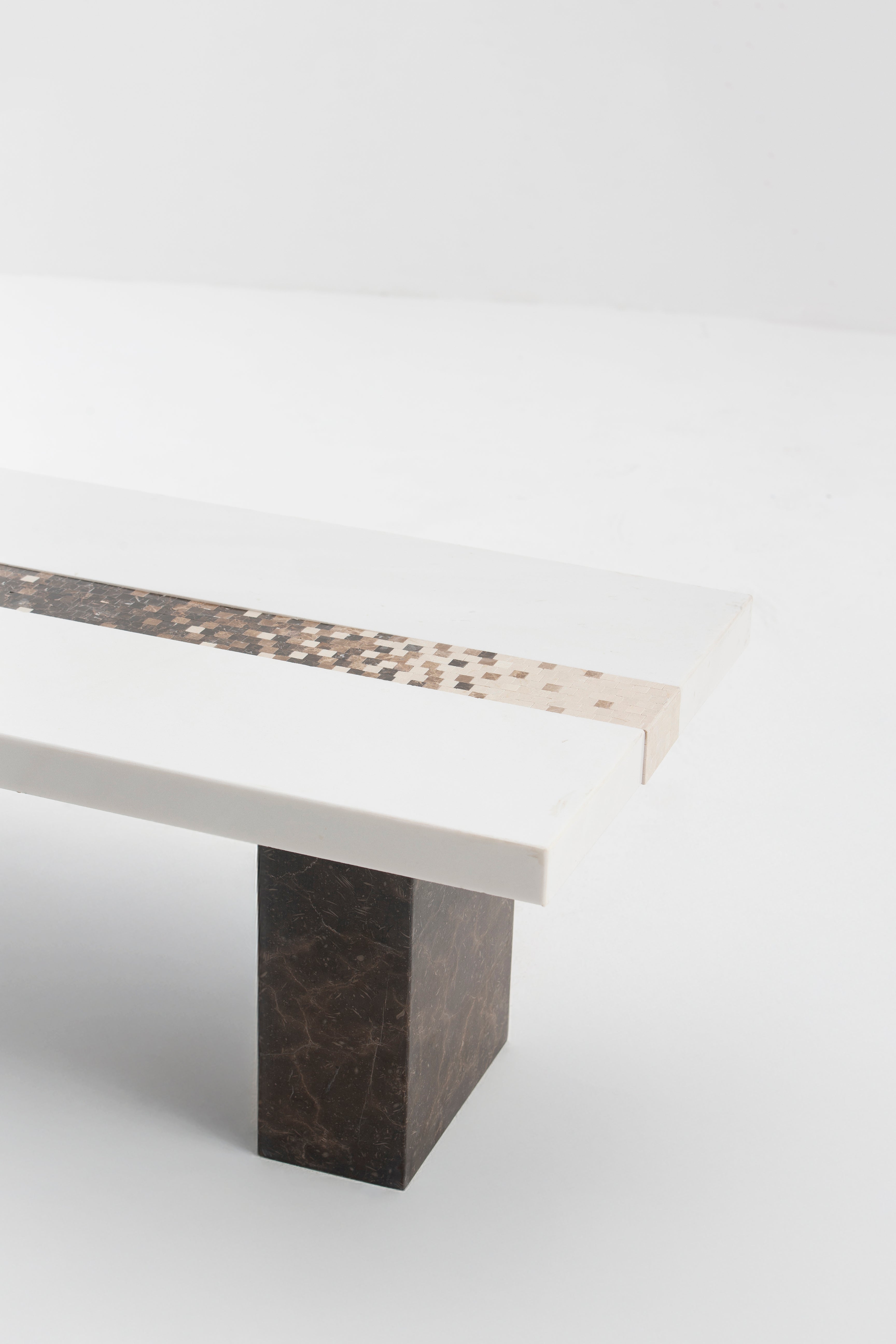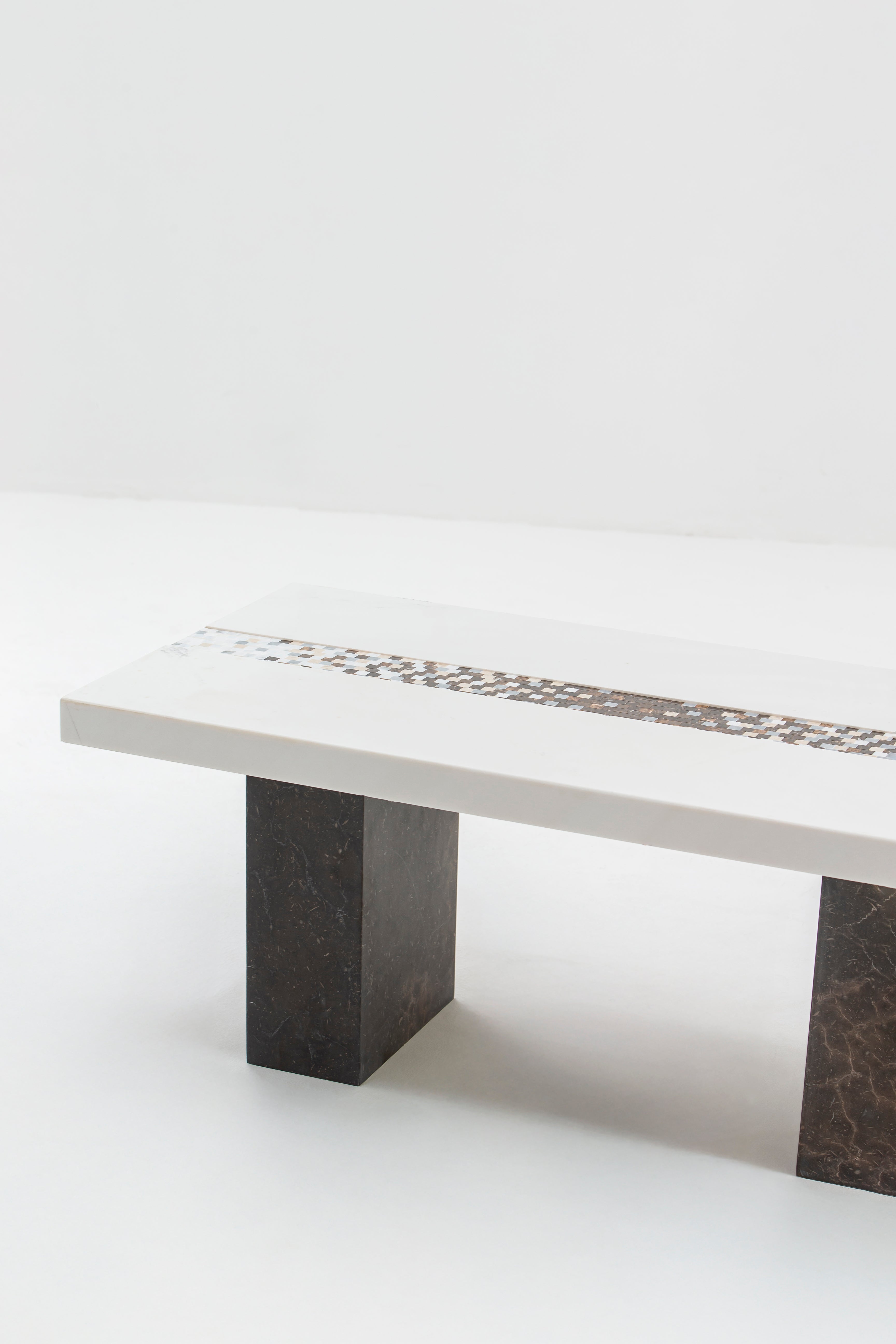 Transform your space with our handcrafted mosaic coffee tables, made from natural white marble and detailed with artisan mosaic inlay strips in Grey, Terracotta, or Beige-Brown tones. The elegant top is accented by a striking central band of fine mosaic tiles, adding texture and contrast to its smooth, polished surface. Supported by handmade Brown Pietra marble block legs, each piece blends clean lines with rich, organic materials. Whether you favor cool neutrals, warm earth tones, or classic beiges, this table becomes the focal point of any modern, Mediterranean, or minimal interior—designed for those who curate with intention.
