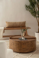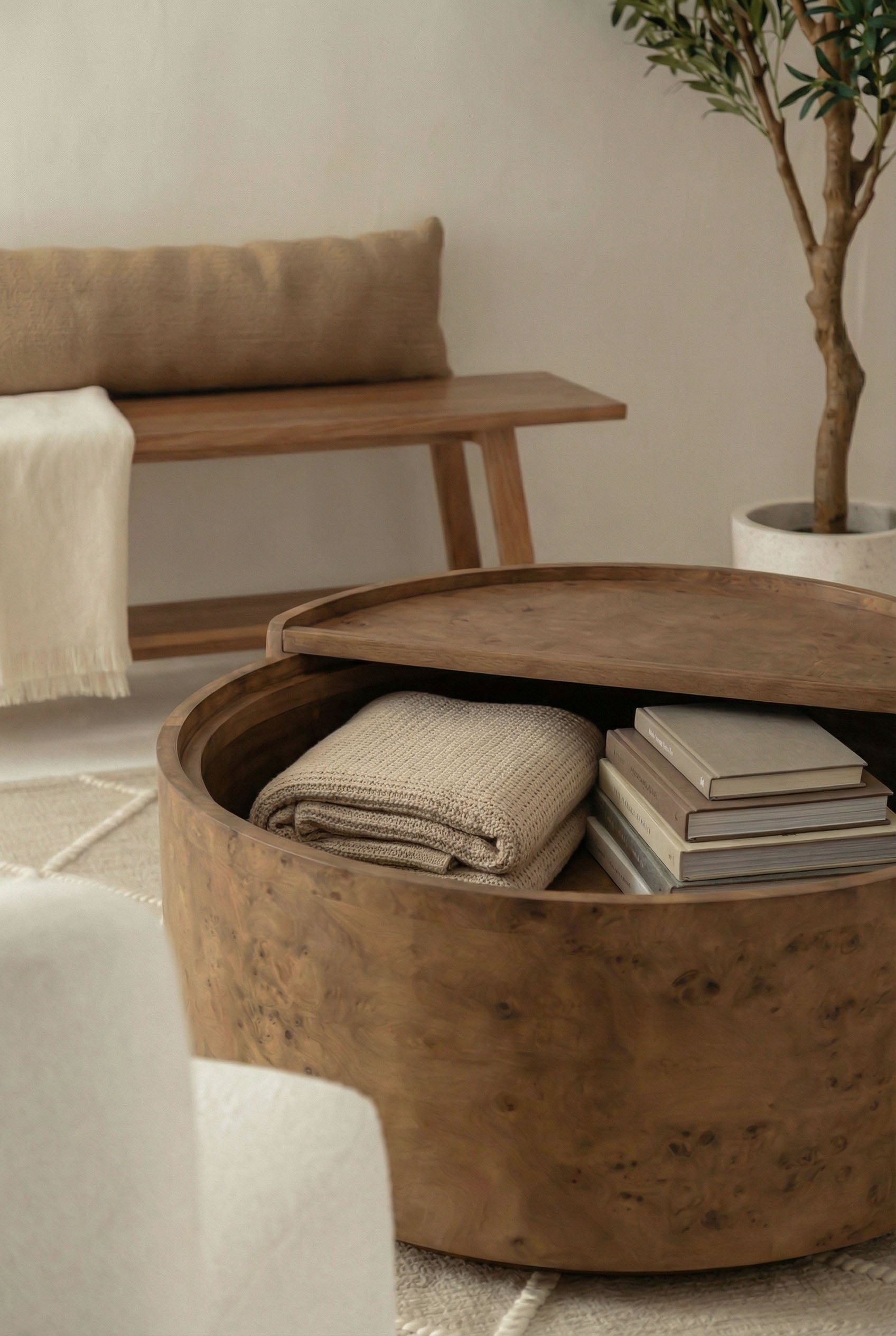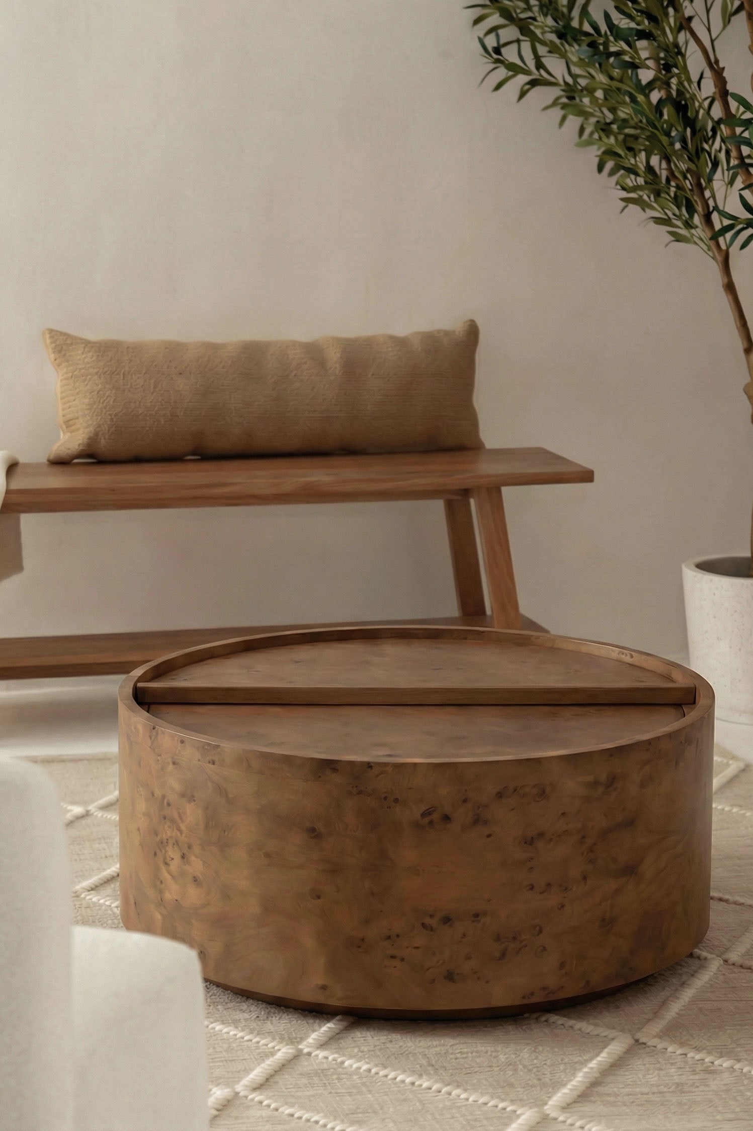 Bring a bold, gallery worthy finish to your living room with this dark wood coffee table, designed in a sculptural round silhouette that instantly elevates your space. The rich, moody tone adds depth and sophistication, while the clever lift top design opens smoothly to reveal hidden storage, perfect for keeping remotes, candles, coasters, and everyday essentials neatly tucked away. With a refined surface for styling trays and décor, it creates a calm centerpiece that feels luxurious, practical, and beautifully uncluttered.